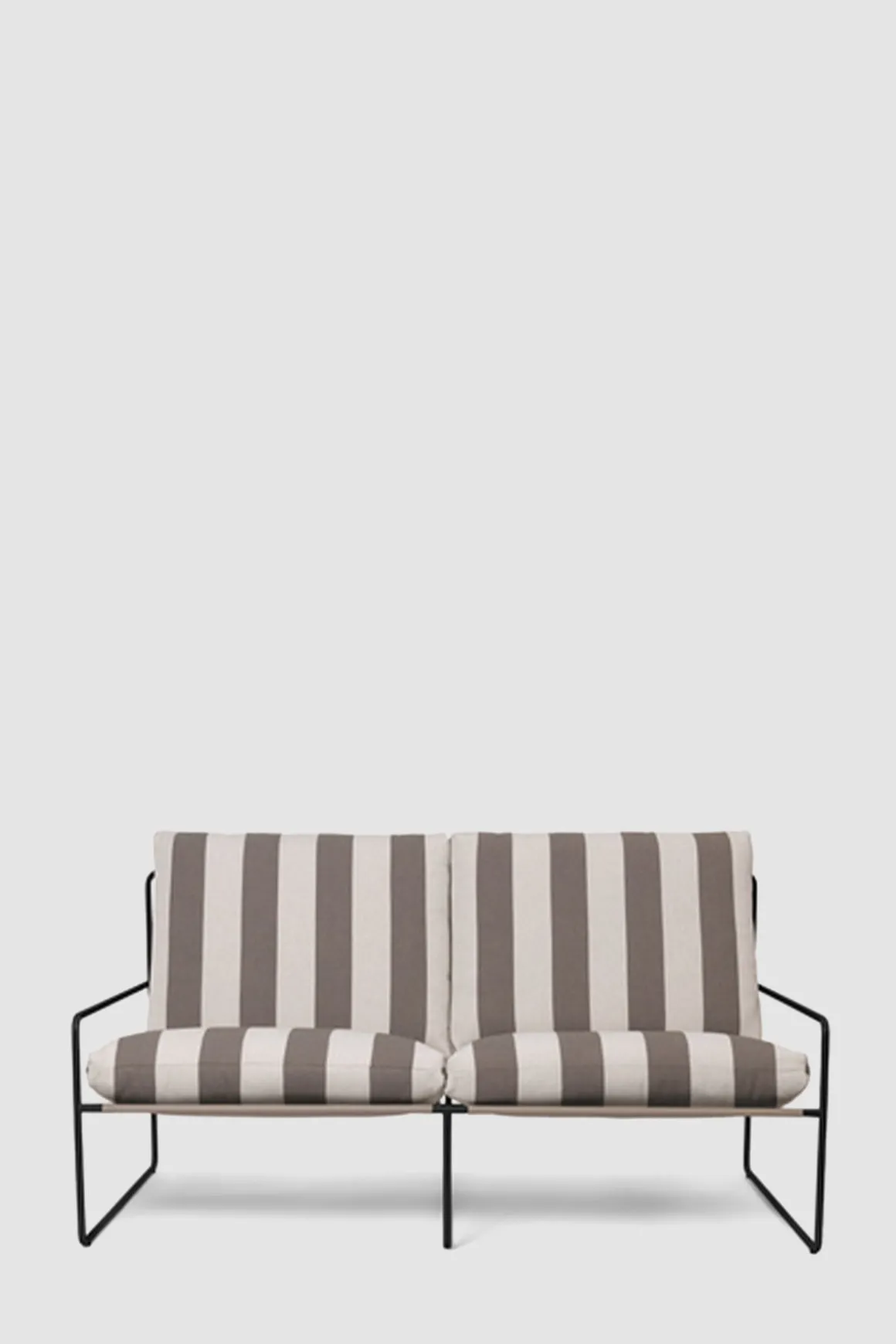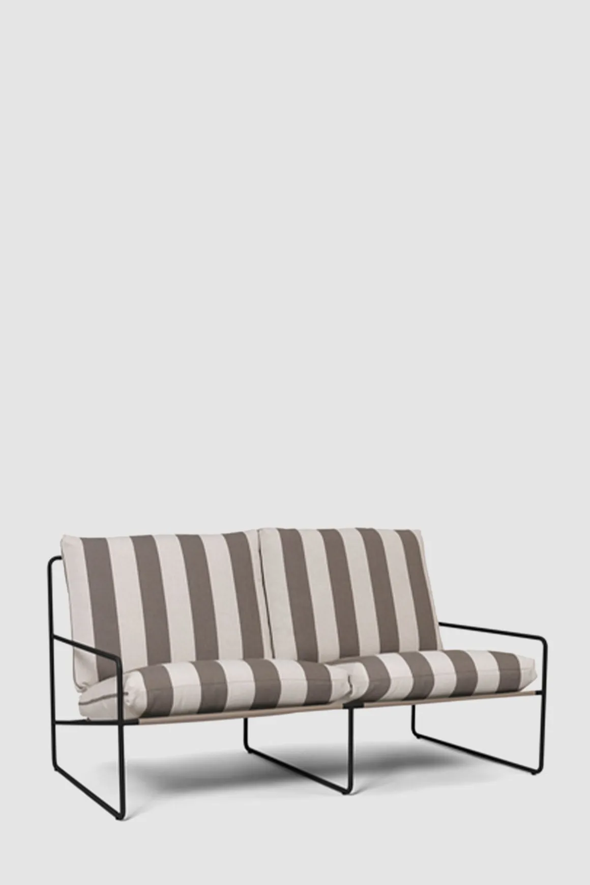 klassisk profil fra Ferm Living. Vår og sommer betyr avslapning og kvalitetstid tilbrakt utendørs. Skap et innbydende salongområde med Desert Sofa, hvor det er god plass til å sole seg, lese bøker og underholde venner og familie. Med det uforutsigbare været i tankene, er Desert Sofa designet for utendørs bruk og er komplettert med koselige sofaputer som er både vann- og UV-bestandige. Sofaen kommer i et stripet trekk med sort ramme. Stilfull, minimalistisk og komfortabel.