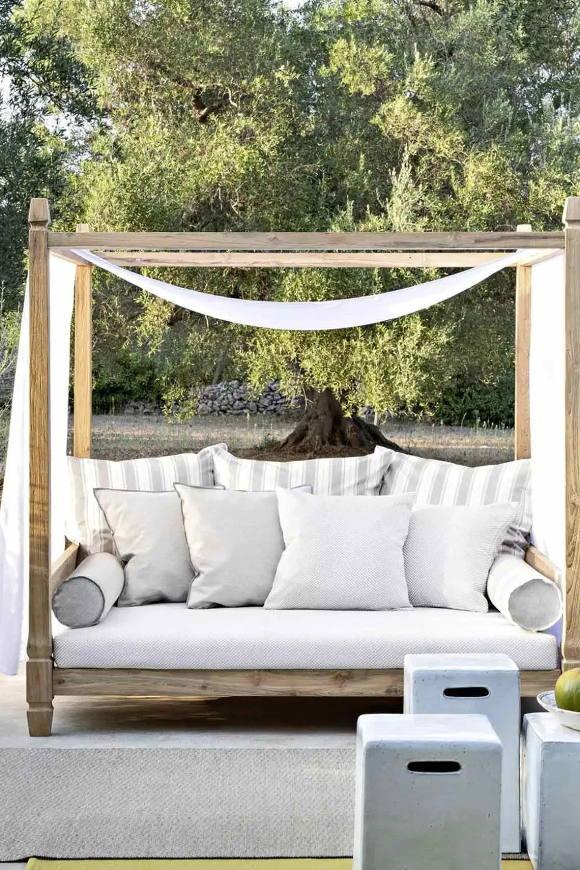 Utesofa Jeko 07 fra italienske Gervasoni, designet av Paola Navone. Jeko-kolleksjonen søker den eksotiske stemningen i klassisk og luksuriøs kolonistil. Bordene, sofaene og lenestolene har rammer i ECOTeak, et materiale hentet fra resirkulerte teakbjelker og elementer gjenvunnet fra riving av tradisjonelle trehus på øya Java i Indonesia, godkjent av lokale myndigheter. De gjenvunnede elementene kuttes til, repareres med resirkulert tre, monteres og slipes for å fremheve det originale treverket, og til slutt håndpolert med hampkluter og spon. Jeko 07 sofaen kjennetegnes av et bredt og lavt sete, med avtagbar pute. Ekstra løse puter kan legges til for å øke komforten ytterligere. Søylene i hvert hjørne av sofaen lager en baldakin med en hvit gardin som gir intimitet og behagelig skygge. Kombiner med andre møbler fra Jeko-serien for en komplett look og få den luksuriøse resort-følelsen hjemme. Trekket på sofaen er i polypropylen som er både vann, smuss-og muggavvisende. Stoffet er mykt, sterkt og holdbart, og trekket er avtagbart og kan vaskes på 30 grader.