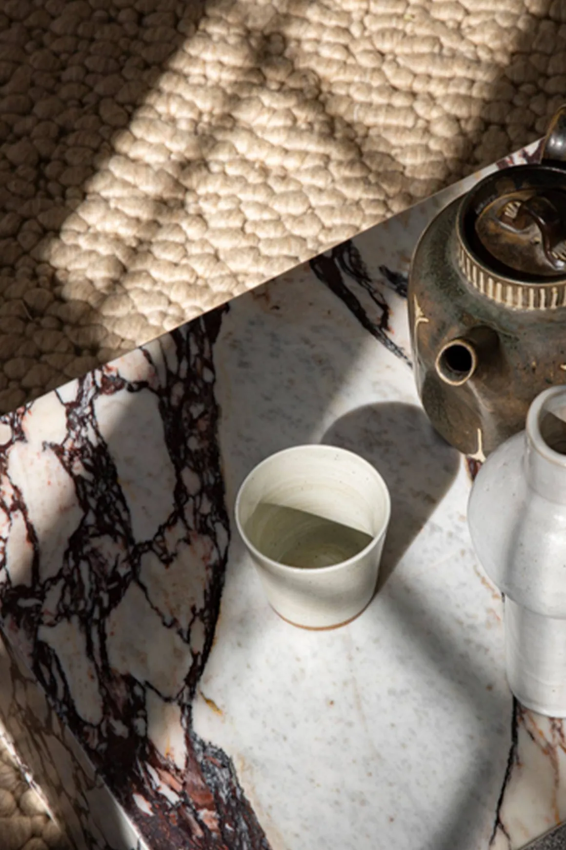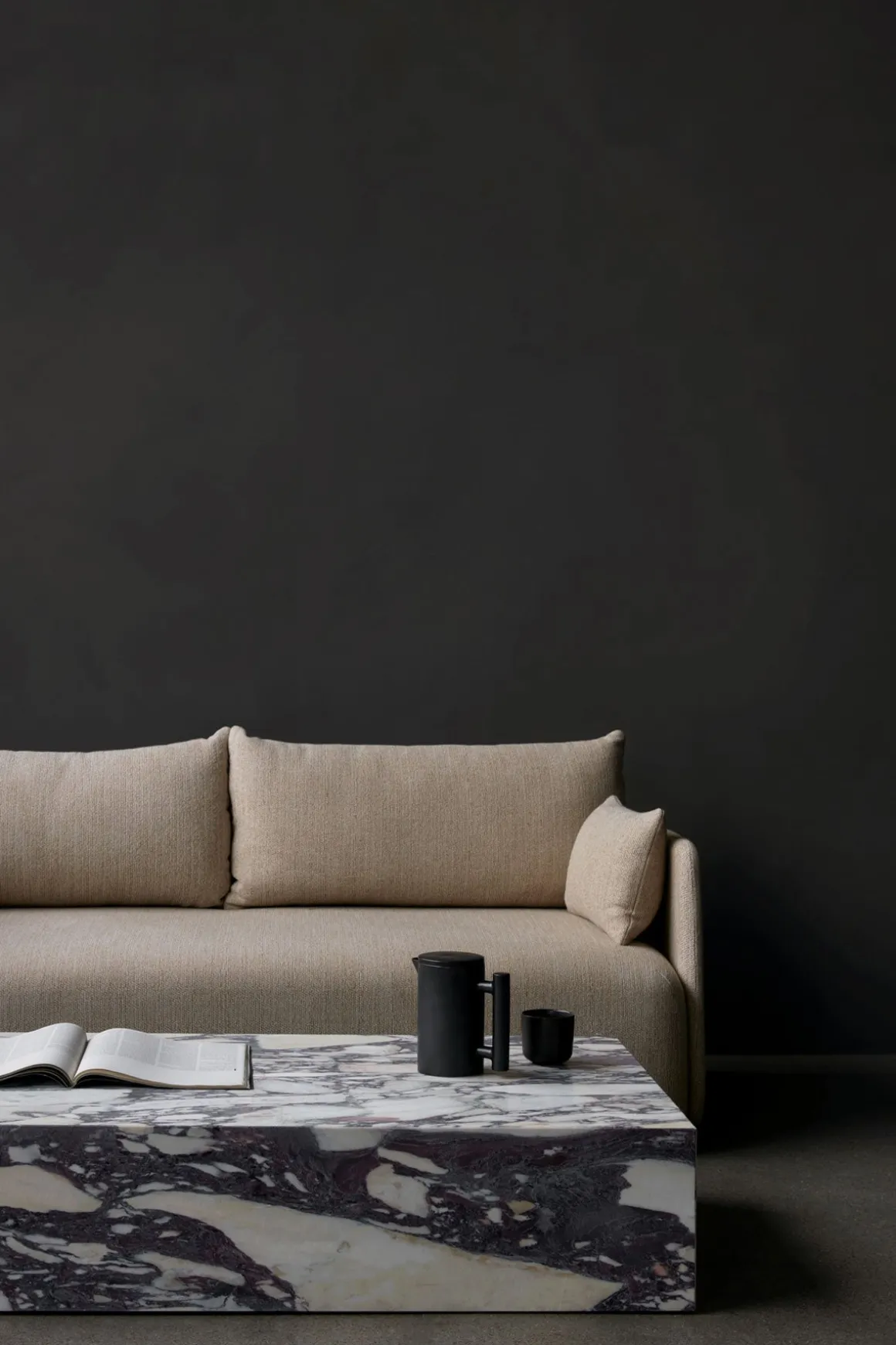Plinth Grand sofabord er en supersized versjon av det klassiske Plinth Low-bordet. Laget i Calacatta Viola marmor med en dyplilla farge som bukter seg rundt basen i unike formasjoner, og gir et organisk, særegent uttrykk til hvert bord. Bordet er formet til et perfekt balansert rektangel, og er et allsidig og multifunksjonelt sofabord håndlaget i en liten fabrikk i Portugal. Bordet har en lav sokkel som gjør at det nesten ser ut som om det svever over gulvet. Plinth har også fire små ben som kan justeres i underkant av en cm i høyden. Bena synes ikke da de er satt fire cm inn fra kanten. Plinth tilbys i fire marmortyper med unike årringer i tillegg til Kunis Breccia-stein. Designet egner seg til en rekke bruksområder og rom. Plint Grand er ideell som både sofabord eller utstillingsbord for dekorative gjenstander. Det er også et skulpturelt objekt i seg selv, som løfter et rom med sin sofistikerte og lysreflekterende finish.