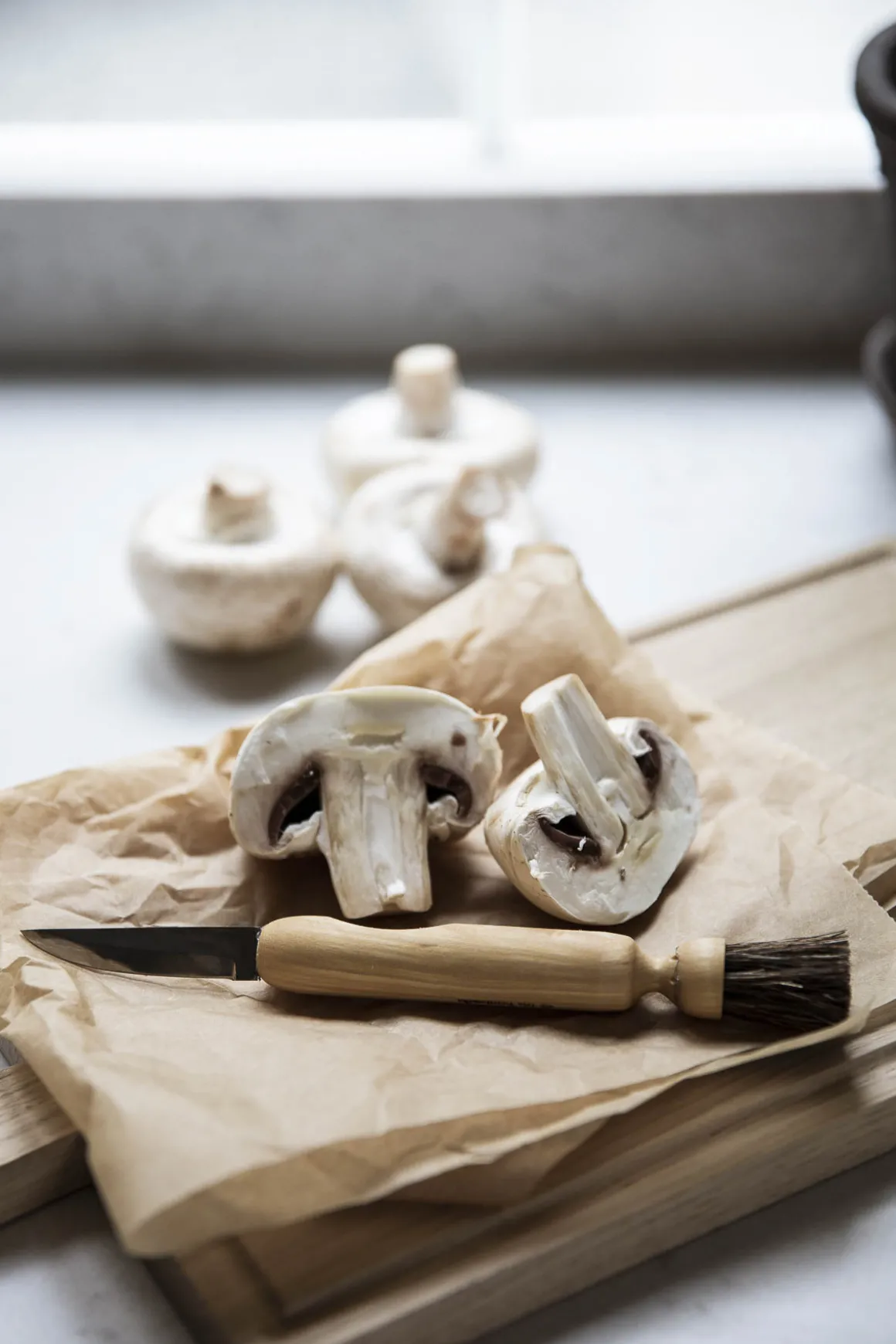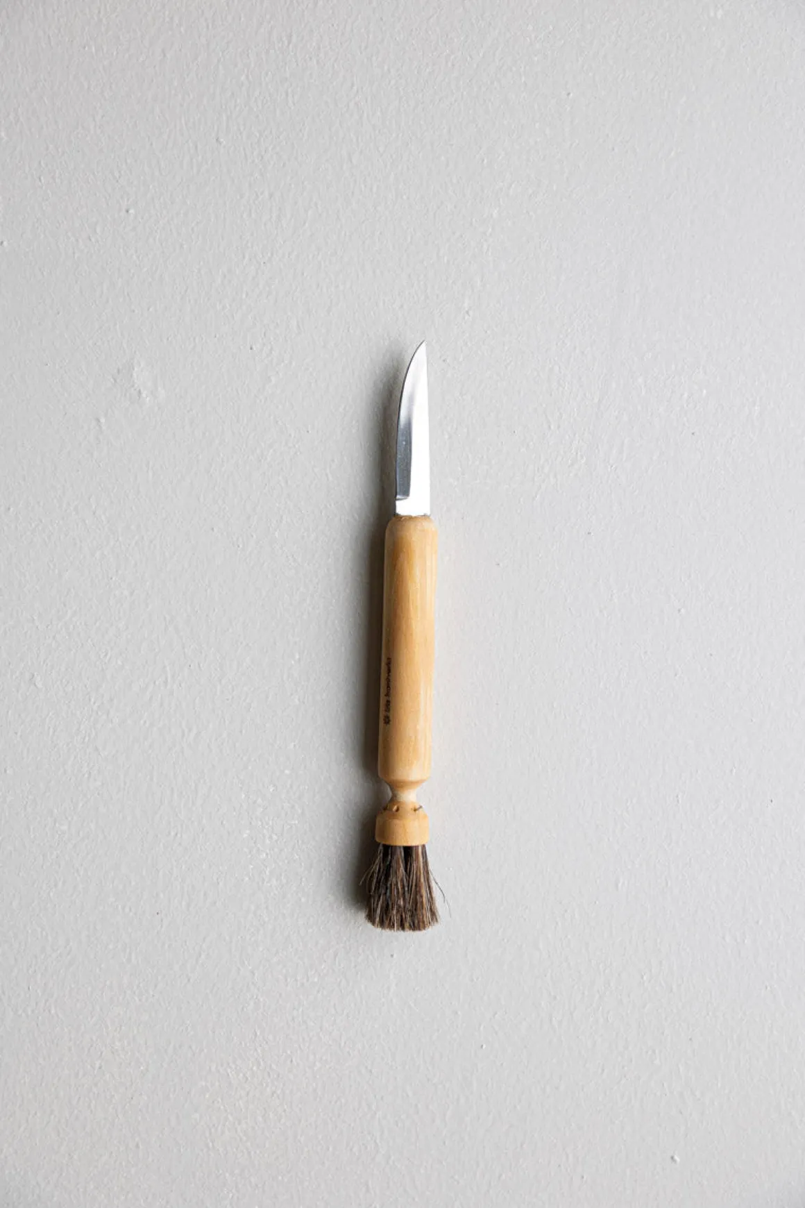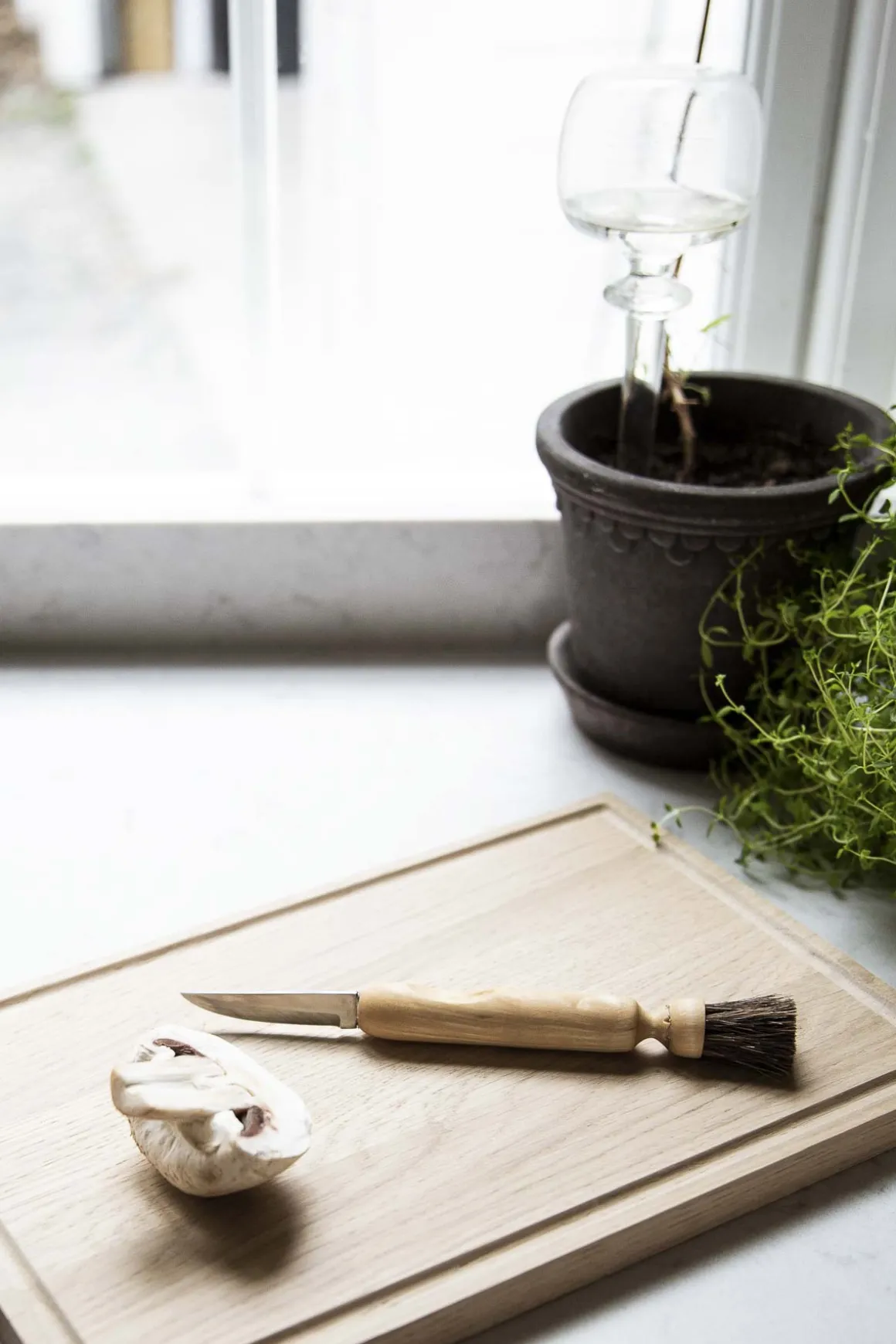 Høsten er tiden for soppjakt i skogen, og da passer det perfekt å ha med seg en soppkniv! Kniven er håndlaget av bjørk, rustfritt stål og har børste av hestehår. Lett å holde i, og er fin å ha med på tur og etter når du skal rense jord og smuss av soppen.