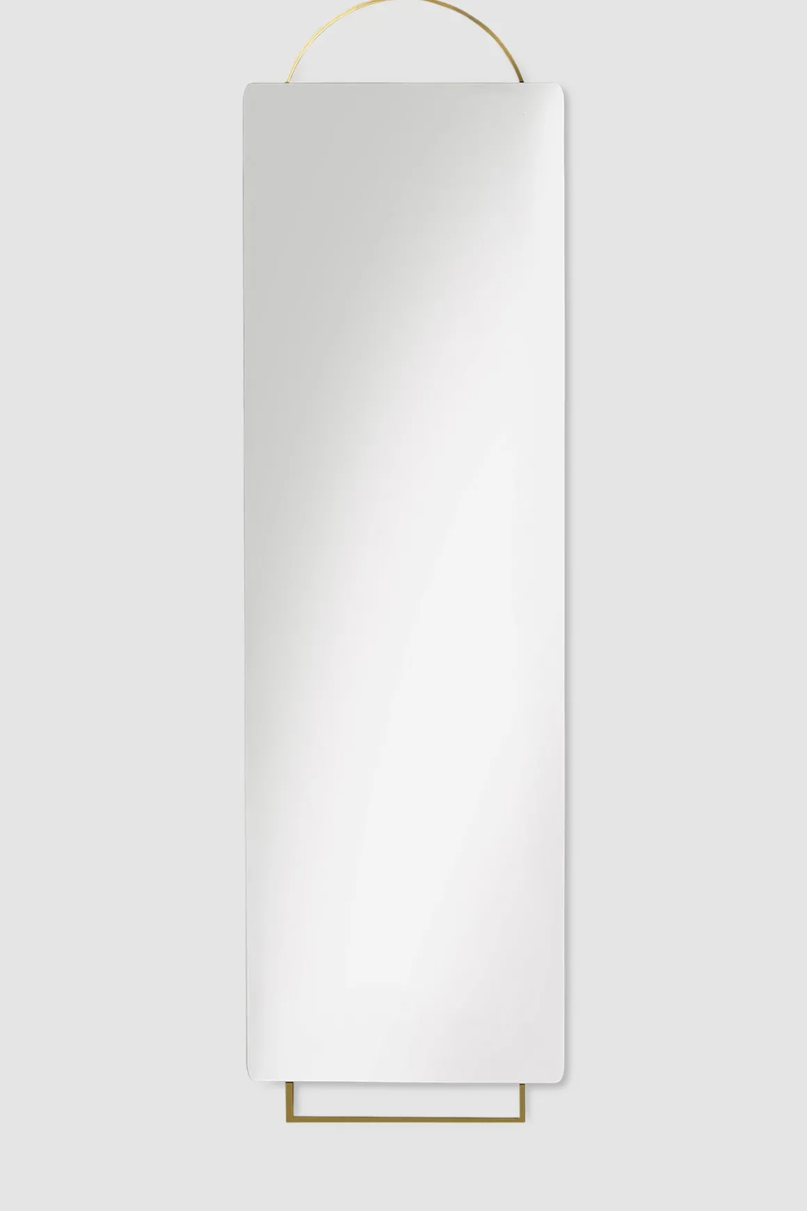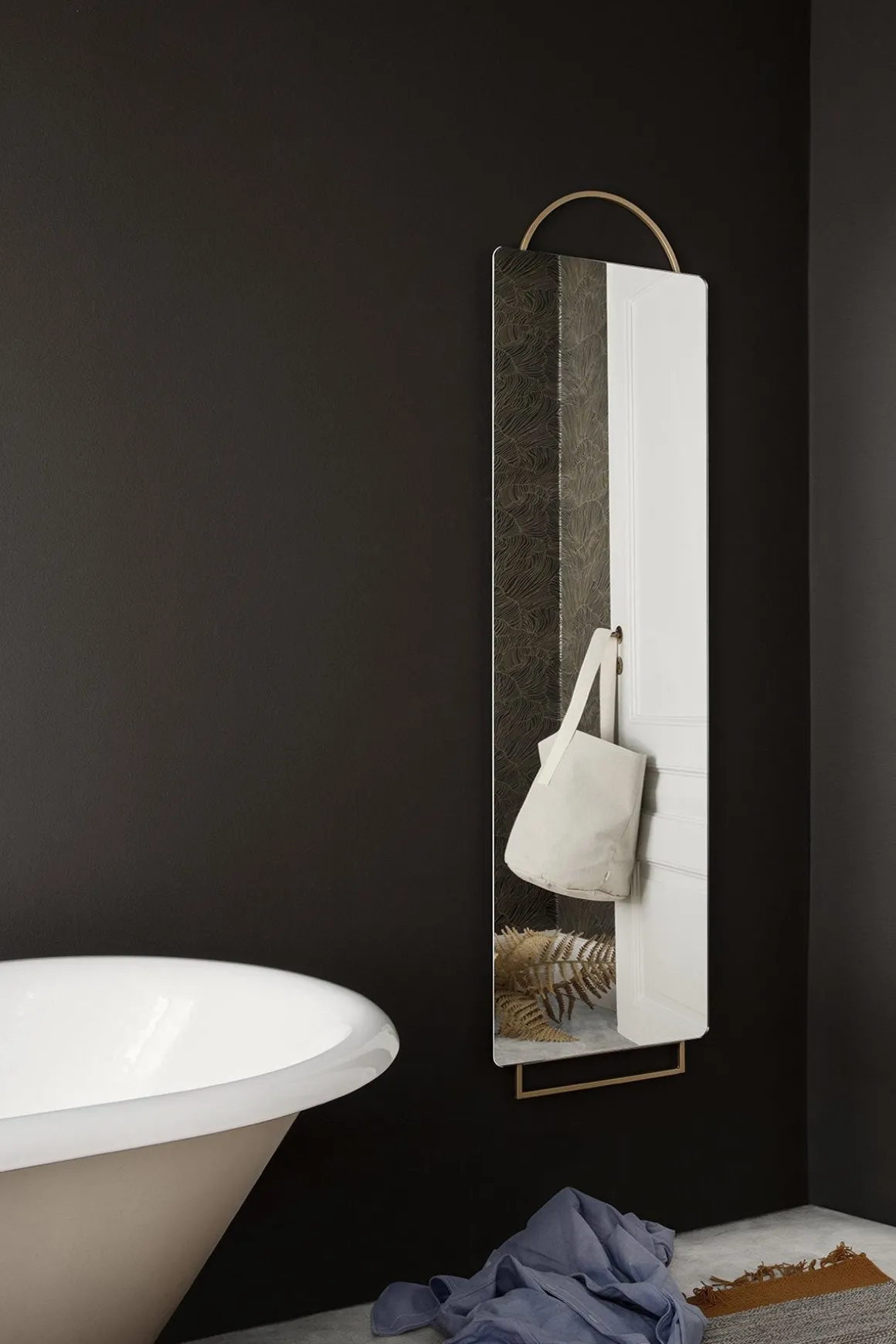 Utrolig flott speil fra Ferm Living. Speilet henter inspirasjon fra elegante smykker, med en moderne ramme i messingfarget stål. Speilet kan plasseres mot veggen eller henges opp med festene man finner på baksiden.