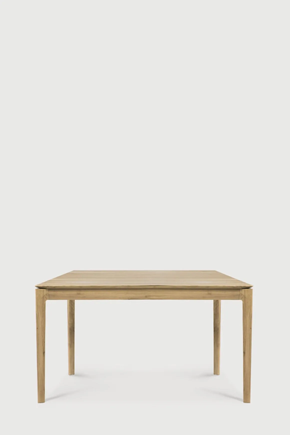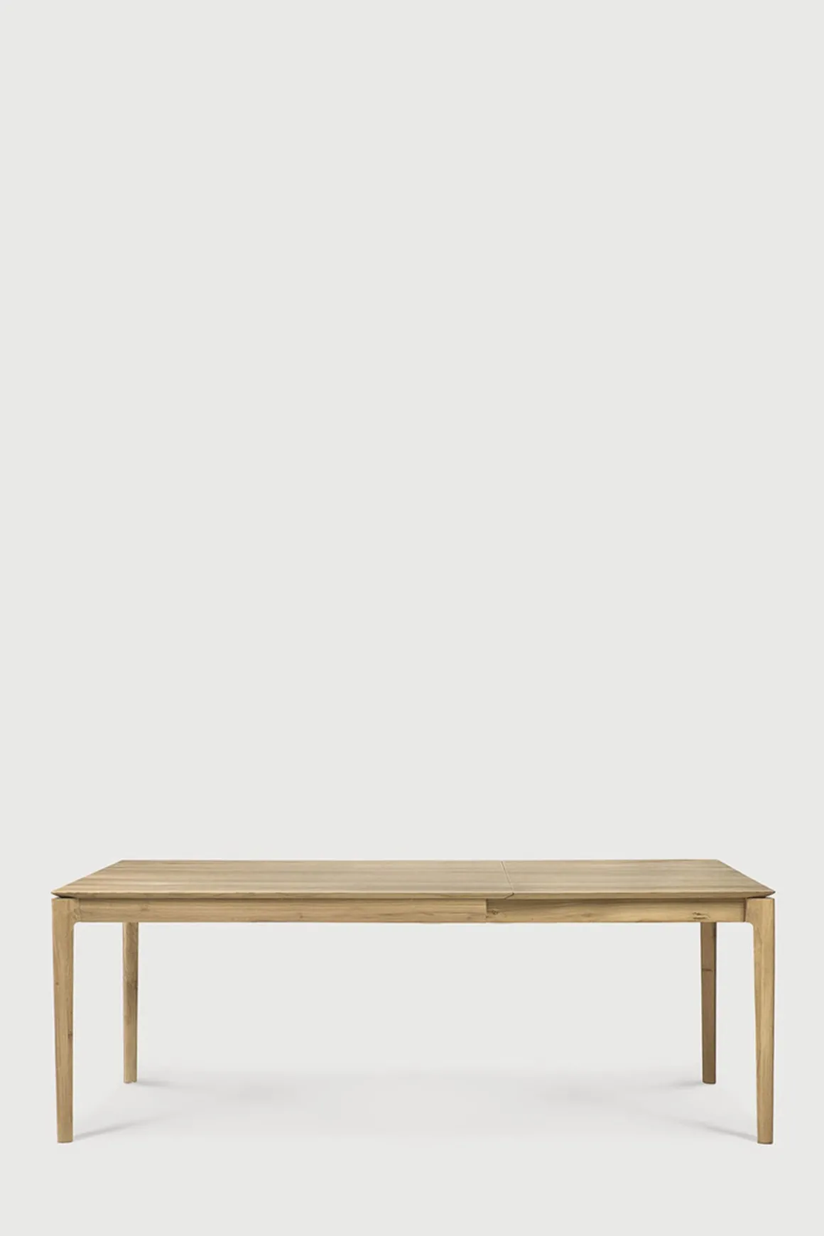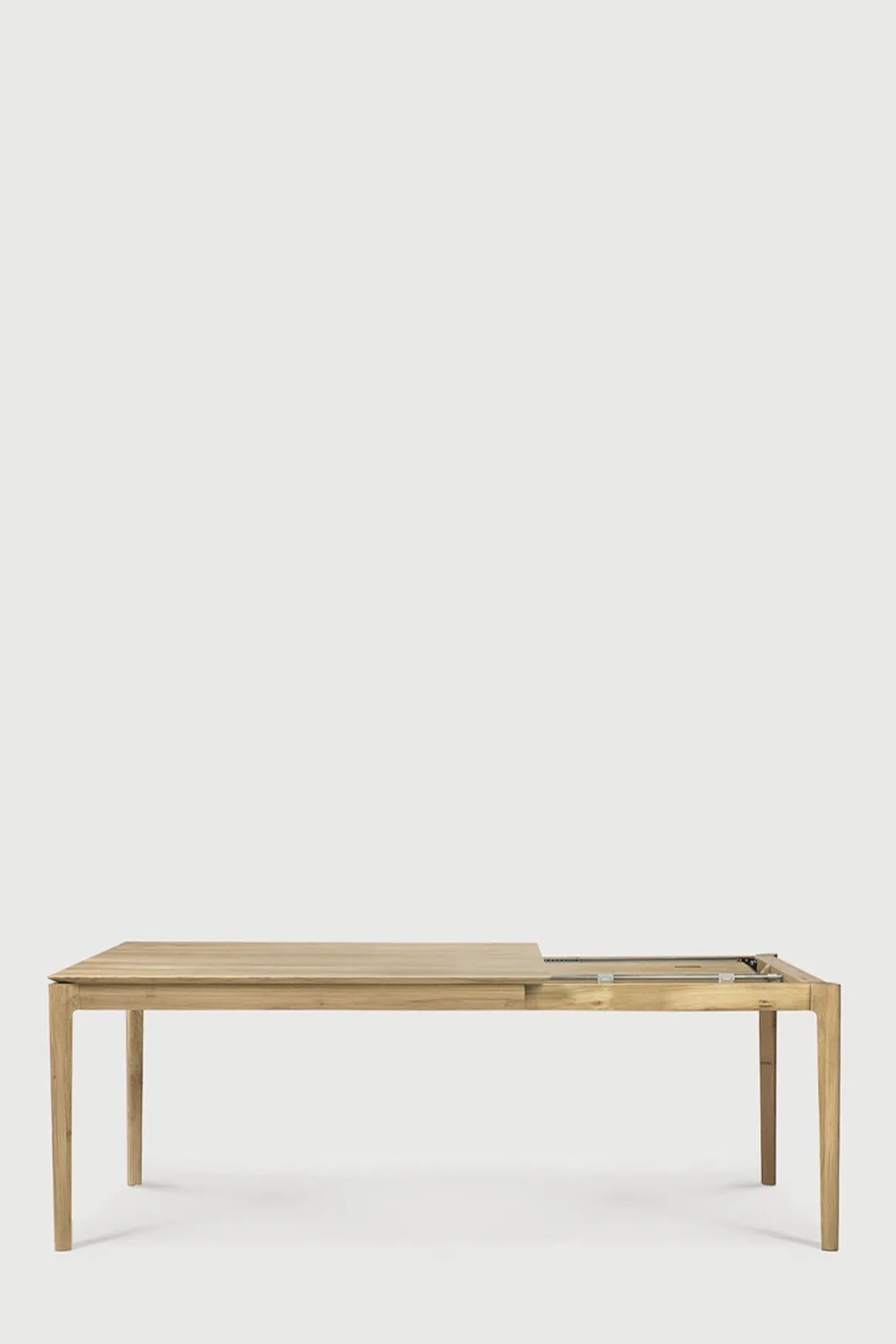 Bok spisebord i solid eik med ileggsplate fra belgiske Ethnicraft, designet av Alain van Havre. Det forlengbare bordet måler 140cm og 220cm med ileggsplaten, perfekt hvis du har flere til bords en dag. Bordet har et luftig og minimalistisk uttrykk med en solid konstruksjon. Designet er enkelt, med komplekse detaljer som gjør det tidløst og personlig. Ethnicraft har fokus på å bruke europeisk eik i høy kvalitet og lar materiale komme til sin rett ved å beholde de naturlige varisasjonene og teksturene i treet. Dette er et bord du kan glede deg over i mange år fremover og som vil passe i alle hjem.