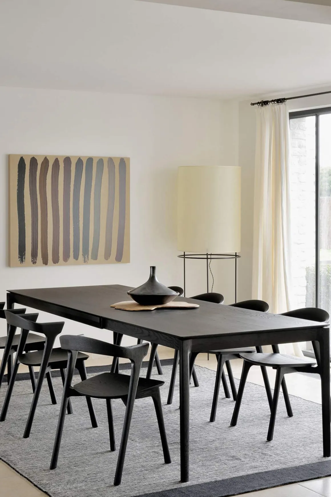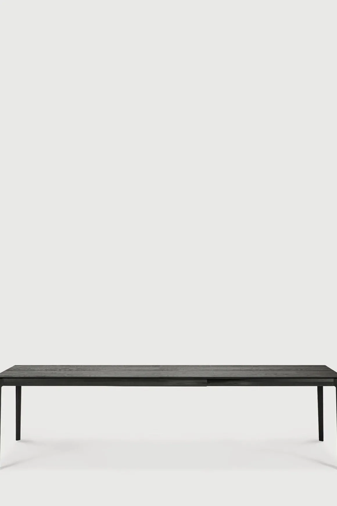 Bok spisebord i solid, sortlakkert eik med ileggsplate fra belgiske Ethnicraft, designet av Alain van Havre. Det forlengbare bordet måler 180cm og 280cm med ileggsplaten, perfekt hvis du har flere til bords en dag. Bordet har et luftig og minimalistisk uttrykk med en solid konstruksjon. Designet er enkelt, med komplekse detaljer som gjør det tidløst og personlig. Ethnicraft har fokus på å bruke europeisk eik i høy kvalitet og lar materiale komme til sin rett ved å beholde de naturlige varisasjonene og teksturene i treet. Dette er et bord du kan glede deg over i mange år fremover og som vil passe i alle hjem.
