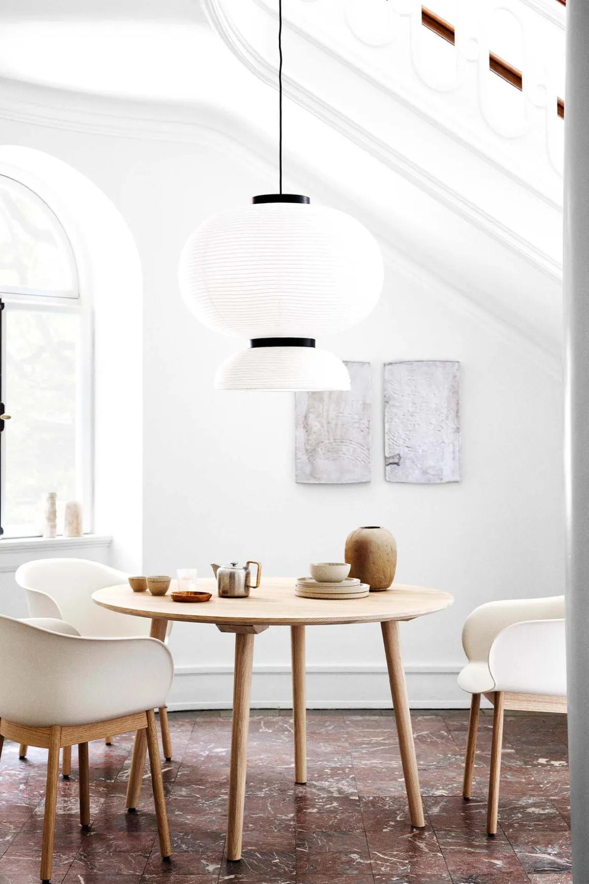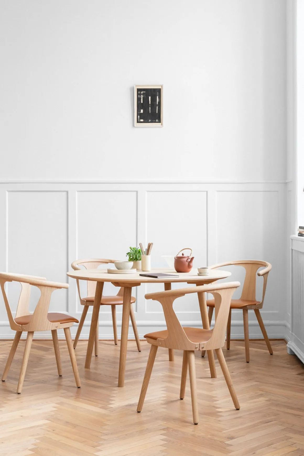 SK4 In Between spisebord, designet av finske Sami Kallio for u0026amp;Tradition. Inspirert av den skandinaviske arven innen design og møbelhåndverk, er In Between et resultat av Sami Kallios solide forankring i tradisjonelle håndverksteknikker og hans øye for geniale detaljer. Det startet med en enkelt stol som senere resulterte i en serie møbler inkludert både bord og barkrakker. Bordet er laget av solid oljet eller lakkert tre og kommer i tre forskjellige varianter. Man kan velge mellom finish i oljet eik, røkt oljet eik, sort lakkert eik eller oljet valnøtt.