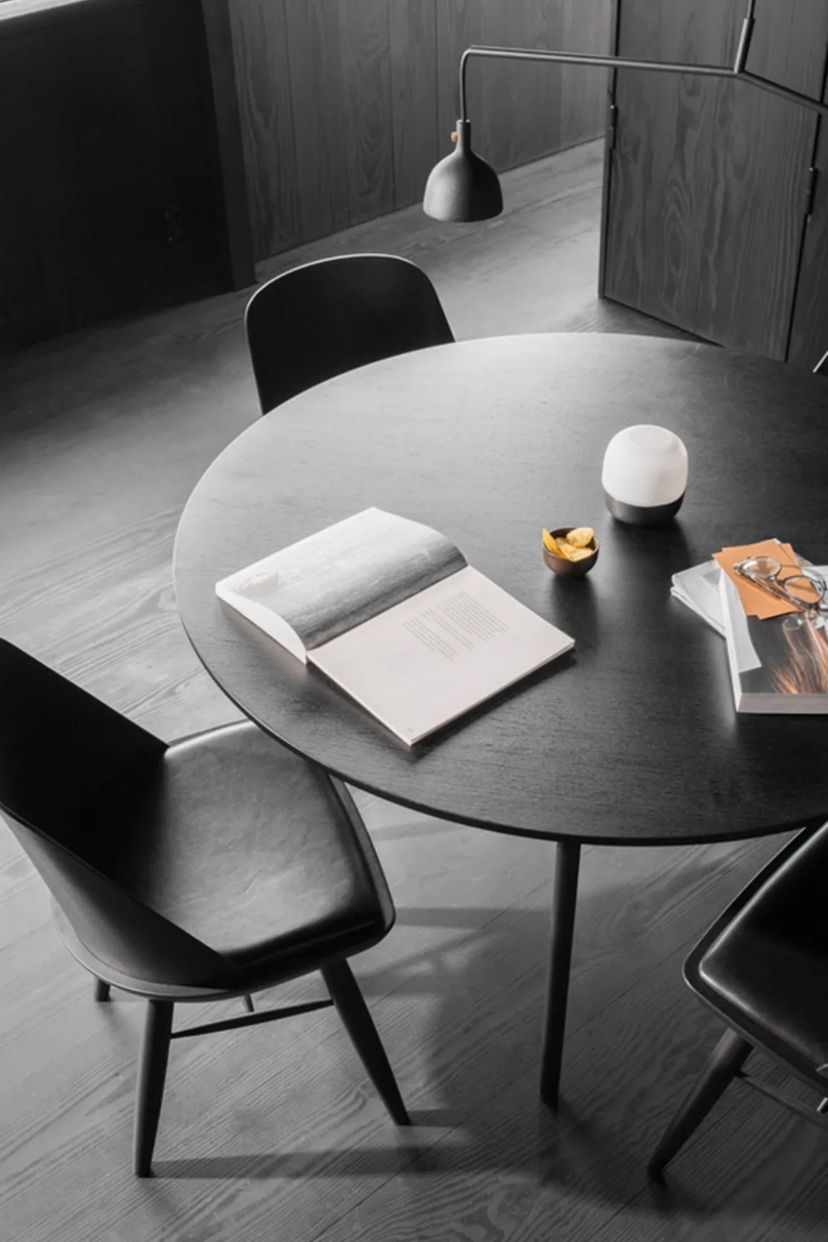Snaregade rundt spisebord i en mørkegrå farge, med bordplate i linoleum og ben i sort, pulverlakkert stål. Snaregade er designet av Norm Architects og ble opprinnelig designet til Audo Copenhagens grunnlegger Bjarne Hansens private hjem. Han trengte et bord som hadde effektiv plassbruk, var visuelt lett og selvfølgelig sofistikert. Bordet ble så godt mottatt at det har vært i produksjon siden, og kommer i flere varianter, størrelser og farger. Snaregade er et klassisk og minimalistisk bord med en sterk geometrisk tilstedeværelse. Bordet er klassisk nok til å heve enhver plass estetisk, og er samtidig stødig og holdbart nok for både kommersiell og privat bruk. Dette er et praktisk og vakkert bord med god plass til 4-5 personer rundt, til hverdags eller spesielle anledninger.