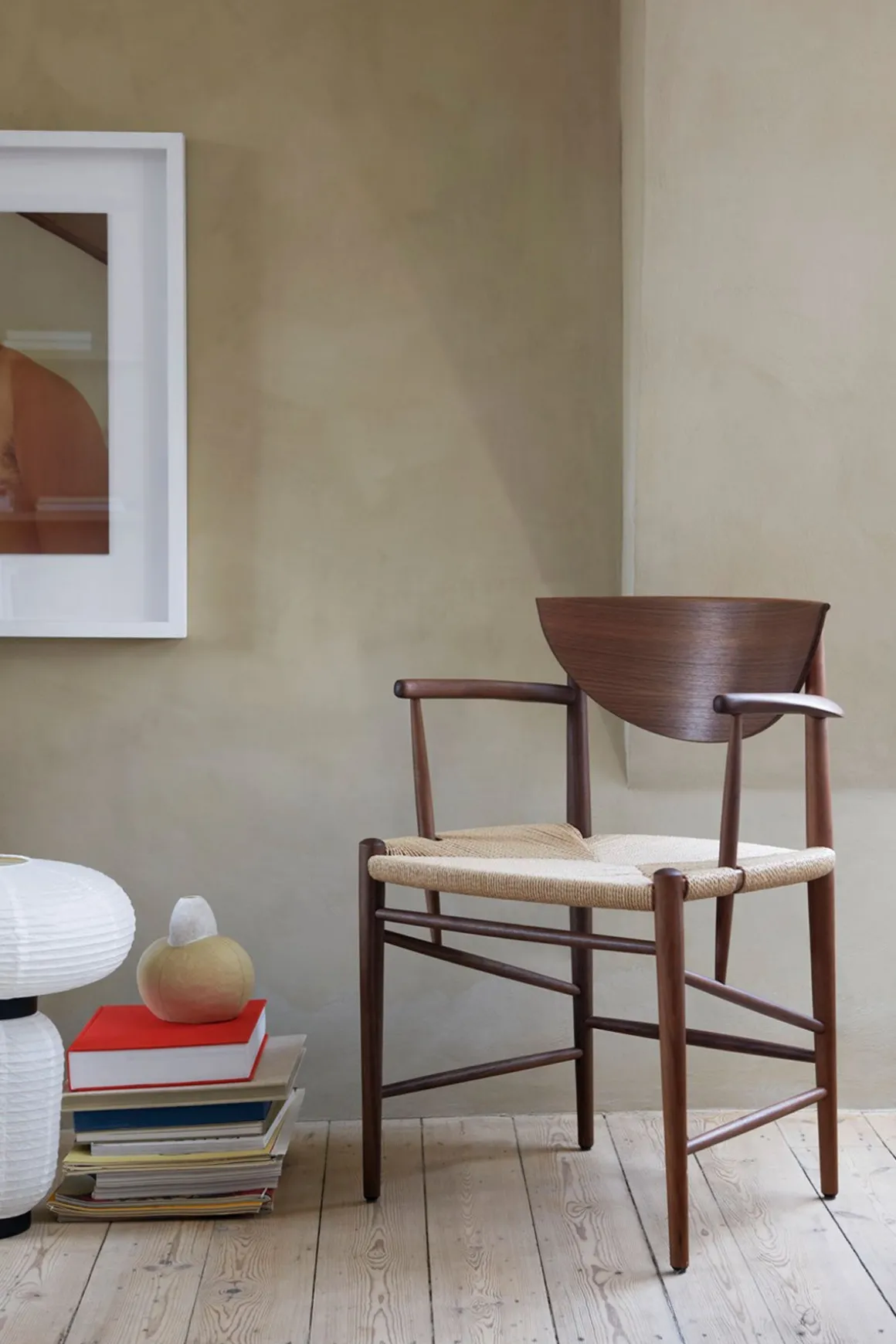 Drawn spisestol med armlener i oljet valnøtt fra danske u0026amp;Tradition. Drawn er en del av dansk designhistorie og ble designet av Hvidt u0026amp; Mølgaard i 1956. Stolen er bygget på tradisjonelle håndverksteknikker og laget av naturlige materialer som tilfører en lunhet og varme til hjemmet. Tilgjengelig i oljet eik, oljet valnøtt, såpet eik, og i svartlakkert eik. Den kommer i to versjoner: en bredere modell med armlener, eller en noe smalere uten armlener. I tillegg kan man kjøpe ekstra sittepute i enten Prescott-svart eller cognacfarget skinn for en enda mykere sitteopplevelse.