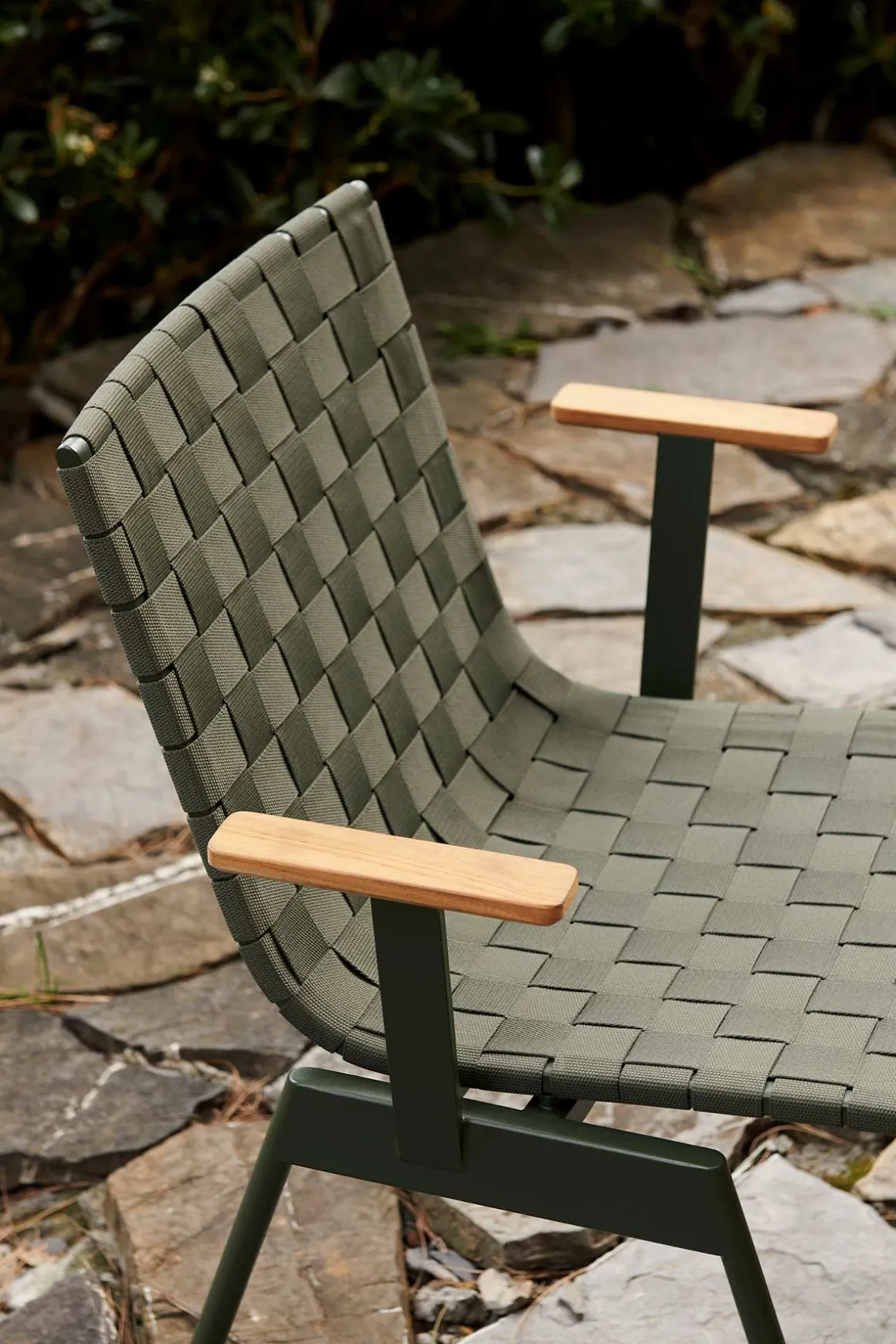 Ville AV34 utestol med armlener fra danske u0026amp;Tradition, designet av den norske designduoen Andersen u0026amp; Voll. Ville er laget av pulverlakkert stål med vevde polyesterremser i sete og rygg og armlener i teak. Metallet kuttes, formes, sveises og deretter pulverlakkeres, mens remsene til stolsetet er vevd for hånd og kuttet i form med en varm kniv for å unngå frynsing. Stolen finnes i sort eller grønn og kommer med eller uten armlener. Ville kan enkelt kombineres med andre typer utemøbler eller du kan komplettere med bord i samme serie for en helhetlig look til uteplassen. Stolene kan stables i hverandre som er veldig praktisk og plassbesparende når de ikke er i bruk.