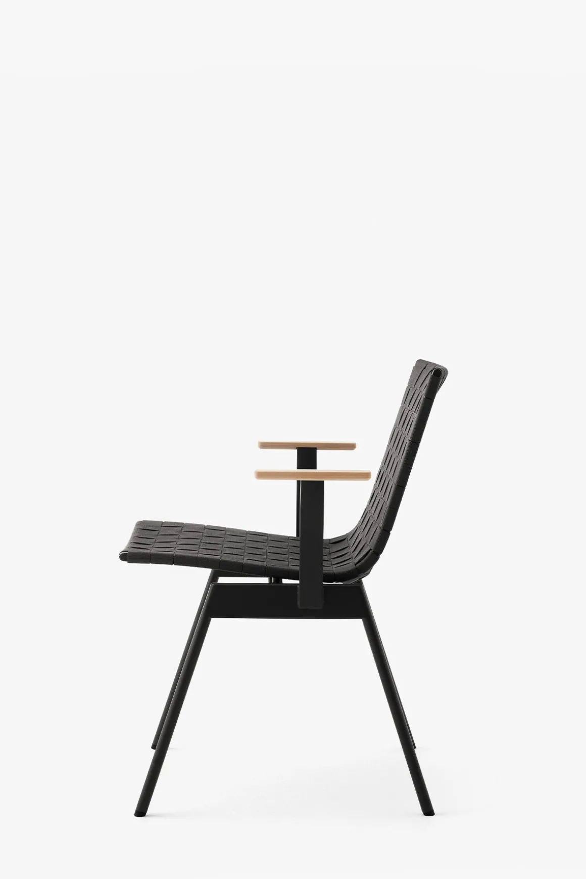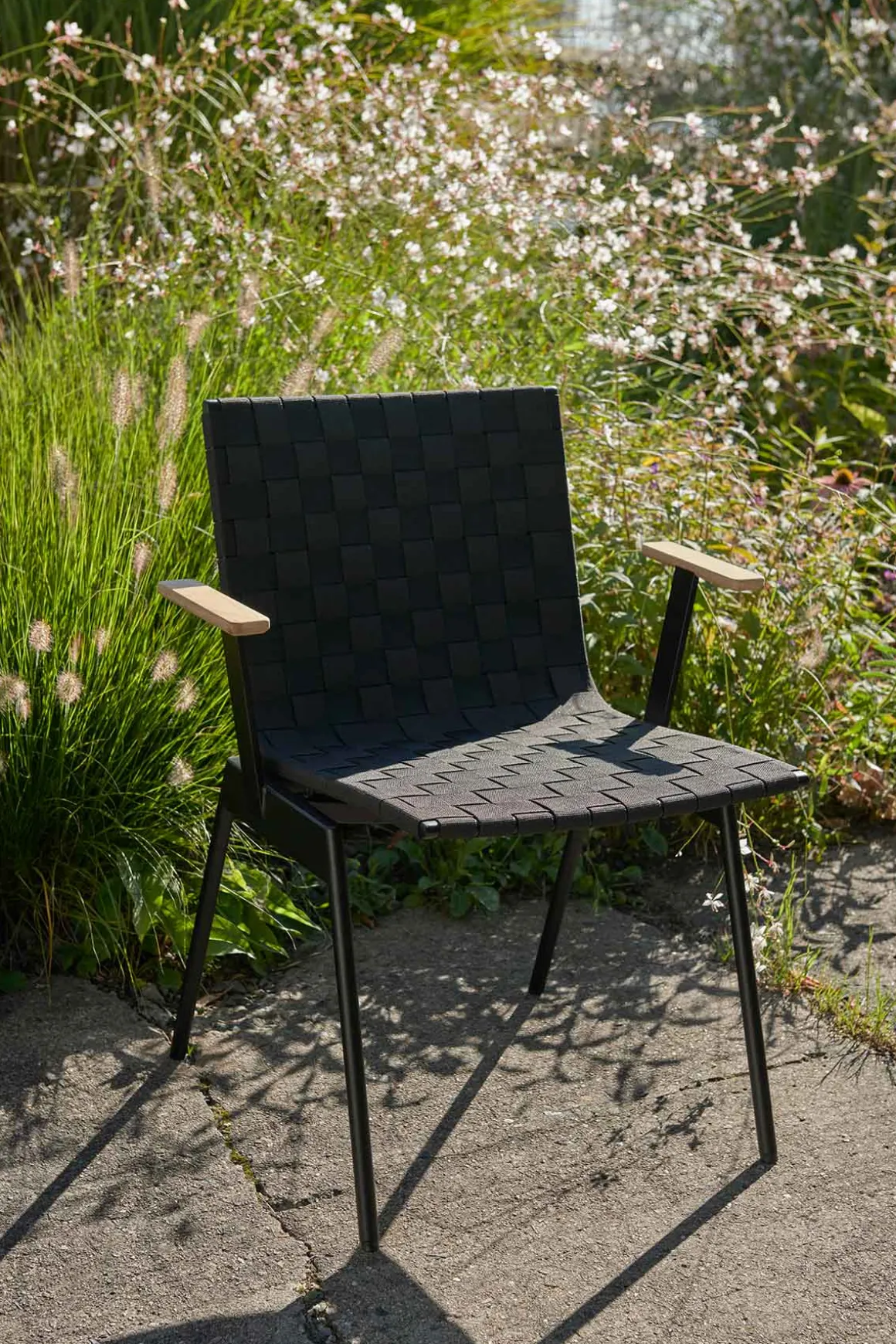 Ville AV34 utestol med armlener fra danske u0026amp;Tradition, designet av den norske designduoen Andersen u0026amp; Voll. Ville er laget av pulverlakkert stål med vevde polyesterremser i sete og rygg og armlener i teak. Metallet kuttes, formes, sveises og deretter pulverlakkeres, mens remsene til stolsetet er vevd for hånd og kuttet i form med en varm kniv for å unngå frynsing. Stolen finnes i sort eller grønn og kommer med eller uten armlener. Ville kan enkelt kombineres med andre typer utemøbler eller du kan komplettere med bord i samme serie for en helhetlig look til uteplassen. Stolene kan stables i hverandre som er veldig praktisk og plassbesparende når de ikke er i bruk.