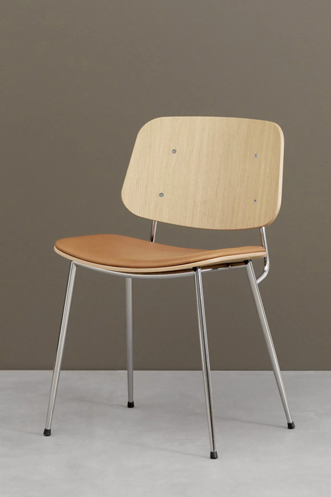 Liker du dansk design, vil du elske denne versjonen av klassikeren som ble designet av Børge Mogensen i 1952. Denne modellen kommer med ben i krom, rygg i eik og sete i cognacfarget, miljøsertifisert anilinskinn. Søborgstolen har klart å kombinere snekkertradisjoner i massivt tre med moderne, formspent finér i perfekt samspill med ramme i en enkel stålkonstruksjon. Seteputen er utskiftbar og trukket i CMHR eller HR-skum med trekk i stoff eller skinn. Søborg-stolen er en behagelig stol med sjenerøse proporsjoner i sete og rygg, som fås med eller uten polstring. De avrundede formene og polstringen i setet gir stolen ekstra god sittekomfort – perfekt til lange frokoster og middager. Søborg-stolen har utskiftbare komponenter som kan fornyes separat etter behov. Hvis du ønsker mer informasjon om stolen eller vil se på stoff-eller skinnprøver, så ta turen innom butikken – vi hjelper deg gjerne!