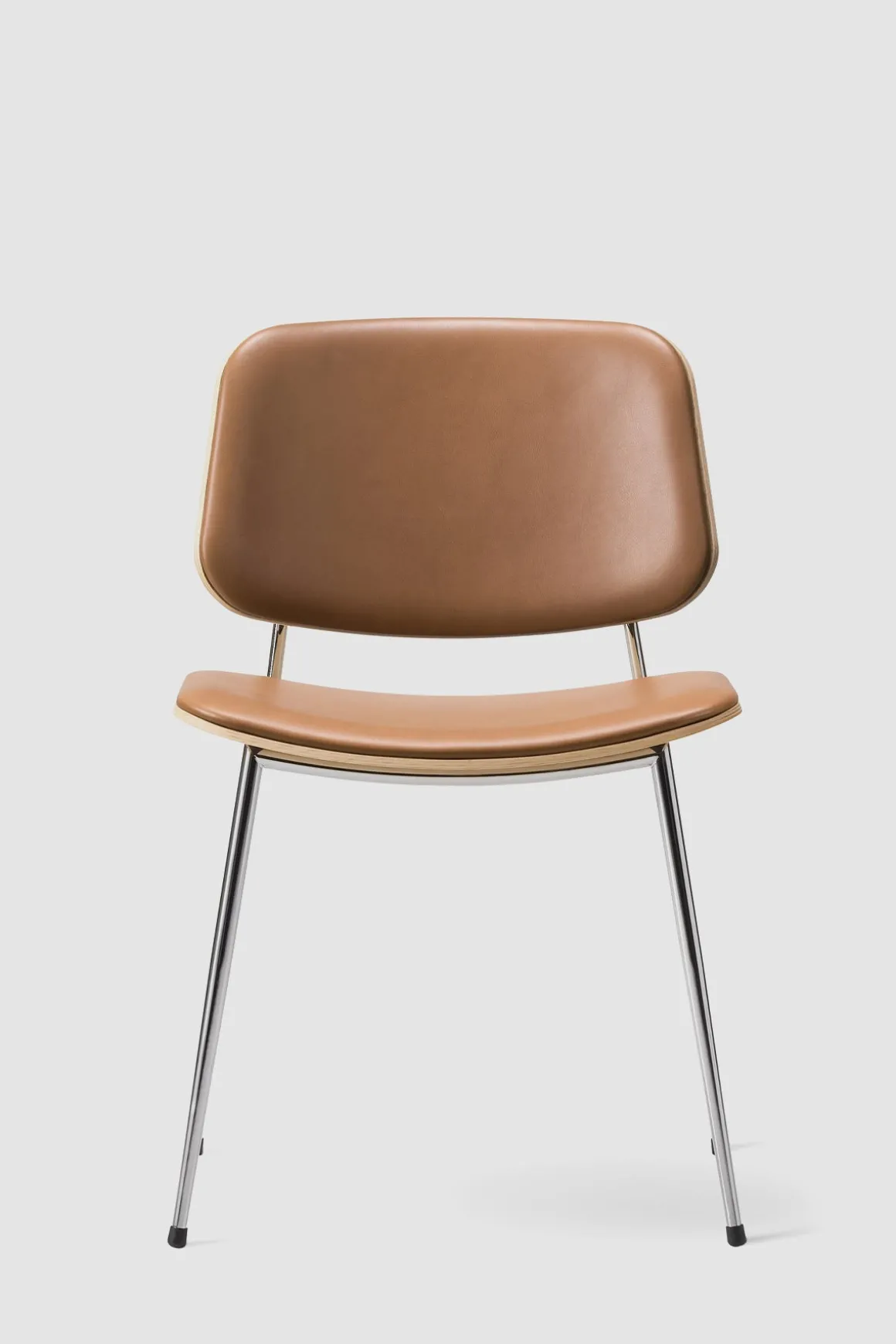 Liker du dansk design, vil du elske denne versjonen av klassikeren som ble designet av Børge Mogensen i 1952. Denne modellen kommer med ben i krom, og rygg-og sete trukket i cognac-farget, miljøsertifisert anilinskinn. Søborgstolen har klart å kombinere snekkertradisjoner i massivt tre med moderne, formspent finér i perfekt samspill med ramme i en enkel stålkonstruksjon. Sete og rygg er trukket i CMHR eller HR-skum med trekk i stoff eller skinn. Søborg-stolen er en behagelig stol med sjenerøse proporsjoner som fås med eller uten polstring. De avrundede formene og polstringen gir stolen ekstra god sittekomfort – perfekt til lange frokoster og middager. Søborg-stolen har utskiftbare komponenter som kan fornyes separat etter behov. Hvis du ønsker mer informasjon om stolen eller vil se på stoff-eller skinnprøver, så ta turen innom butikken – vi hjelper deg gjerne!