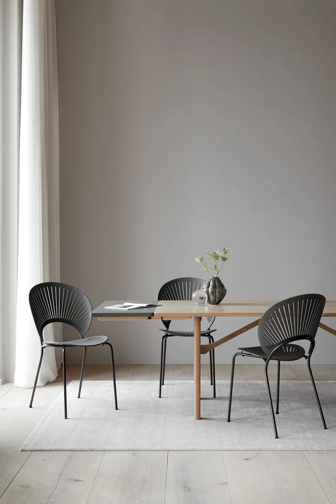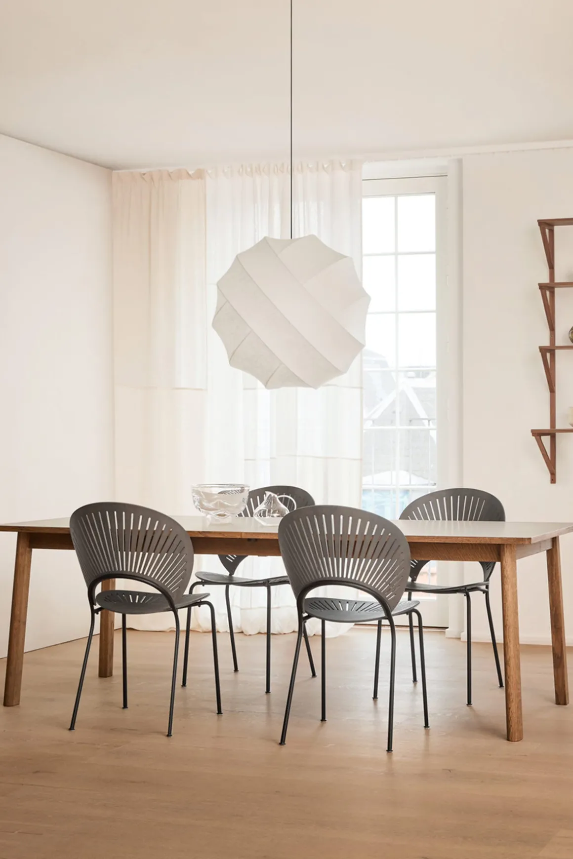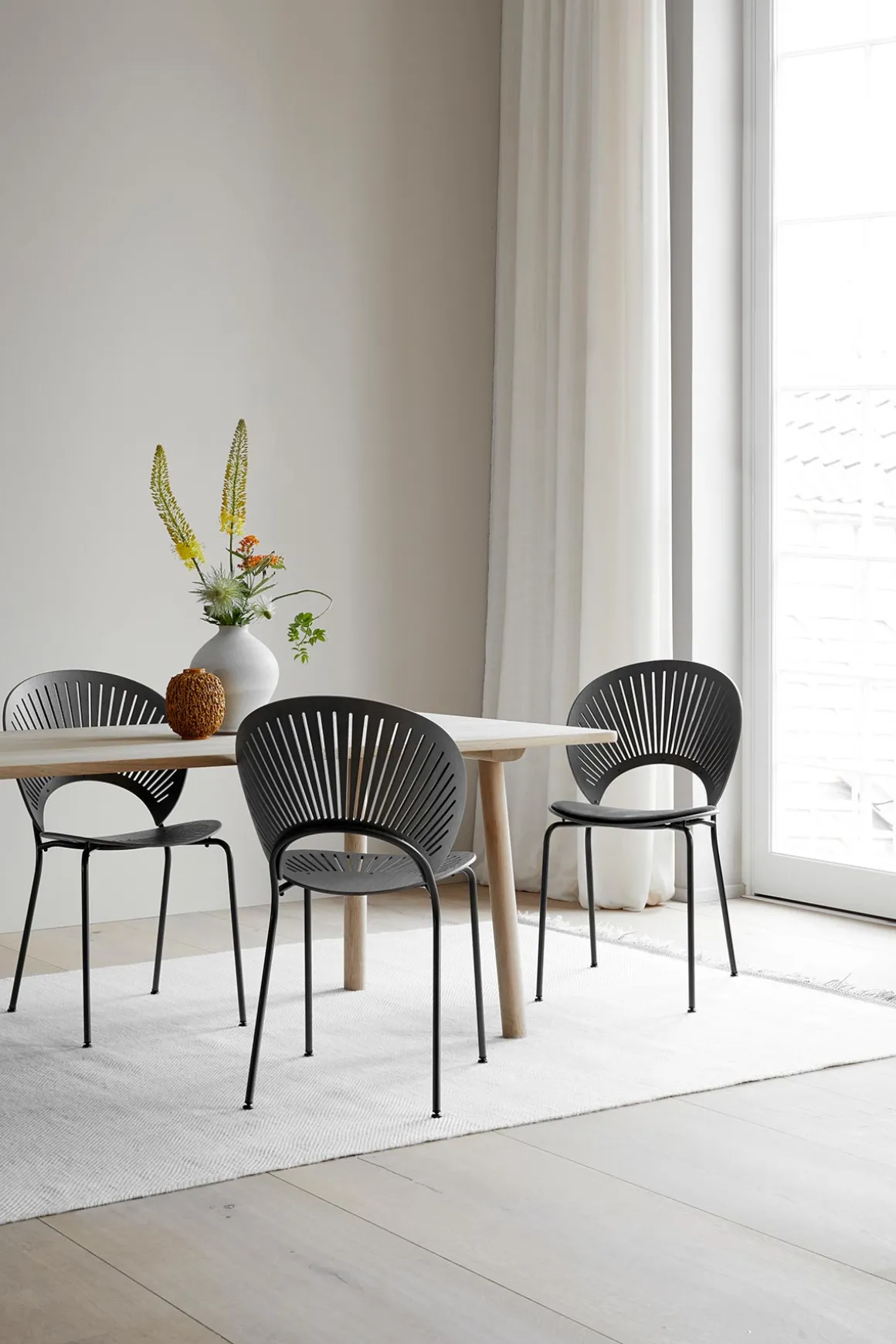Bli kjent med ikoniske Trinidad 3398, designet av den kjente danske designeren Nanna Ditzel til Fredericias 25-års jubileum i 1993. Spisestolen er inspirert av hennes reise gjennom Trinidad og spesielt de forseggjorte utskjæringene på fasadene til «pepperkakehusene» fra kolonitiden. På samme måte som fasadene, utløser det utskårne treverket et samspill av lys og skygger, og skaper et vakkert mønster som gjør stolen unik. Trinidad kombinerer sofistikerte detaljer med uanstrengt eleganse, uten å gå på akkord med hverken komfort eller design. De særegne utskjæringer i den buede ryggstøtten og setet, er både et iøynefallende, dekorativt element, samtidig som det gjør stolen både lettere og luftigere. Spisestolen har utmerket sittekomfort og tar svært lite plass. Stolens ramme er laget av stålrør, ryggstøtten av støpt kryssfiner med presise CNC-utskjæringer, og sete og rygg er montert med nagler. Bena kommer med utskiftbare plastglidere. Denne versjonen uten armlener kan stables – hele 8 stoler i hverandre som er perfekt hvis man har begrenset med plass. Trinidad kommer i flere varianter og er tilgjengelig i behandlet eik, ask, bøk, og valnøtt. I tillegg fås understellet i fargen flint, krom og sort. Trinidads dristige design gjorde stolen til en øyeblikkelig suksess etter lanseringen i 1993 og er nå et lettgjenkjennelig designikon som passer perfekt inn i skandinaviske hjem.
