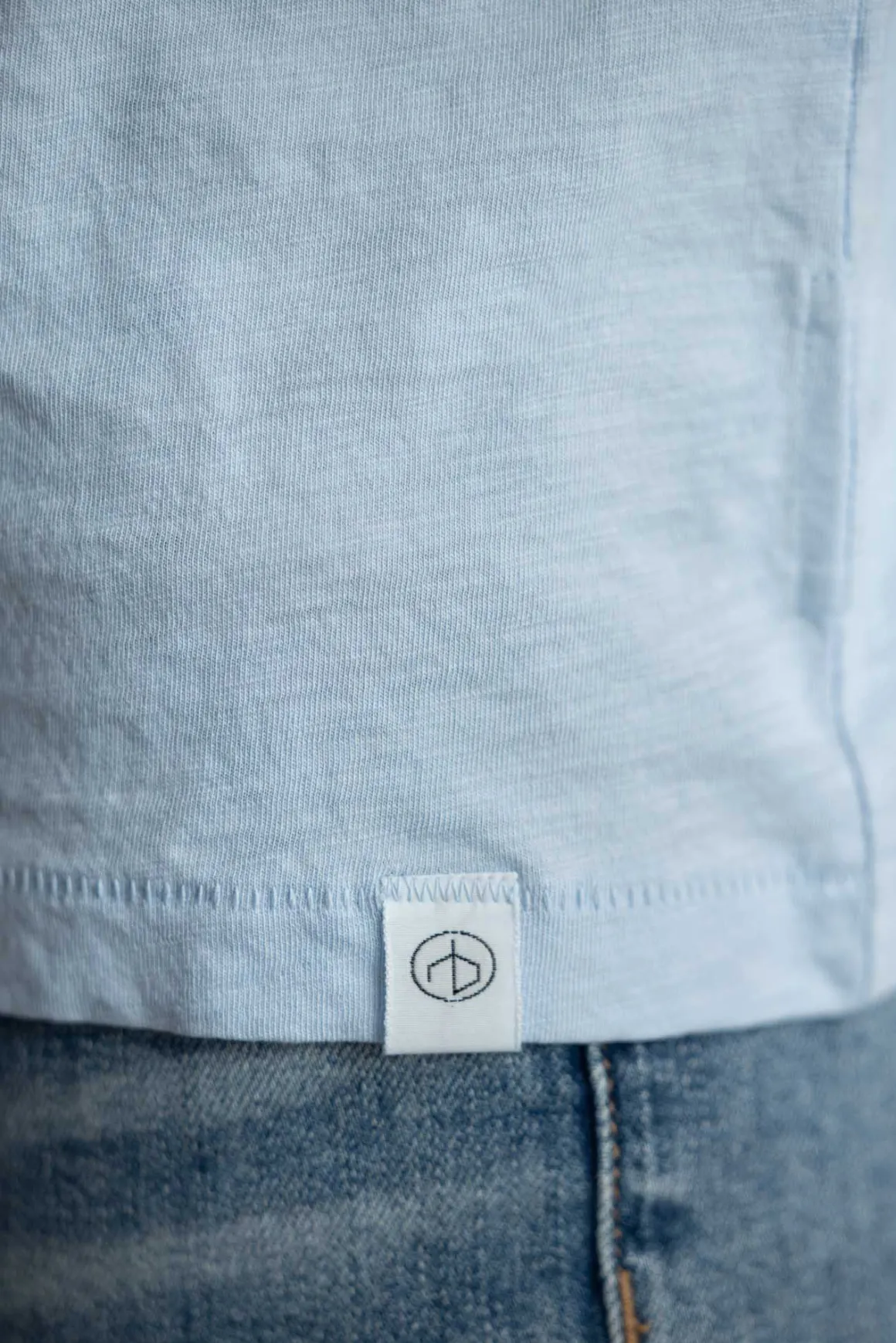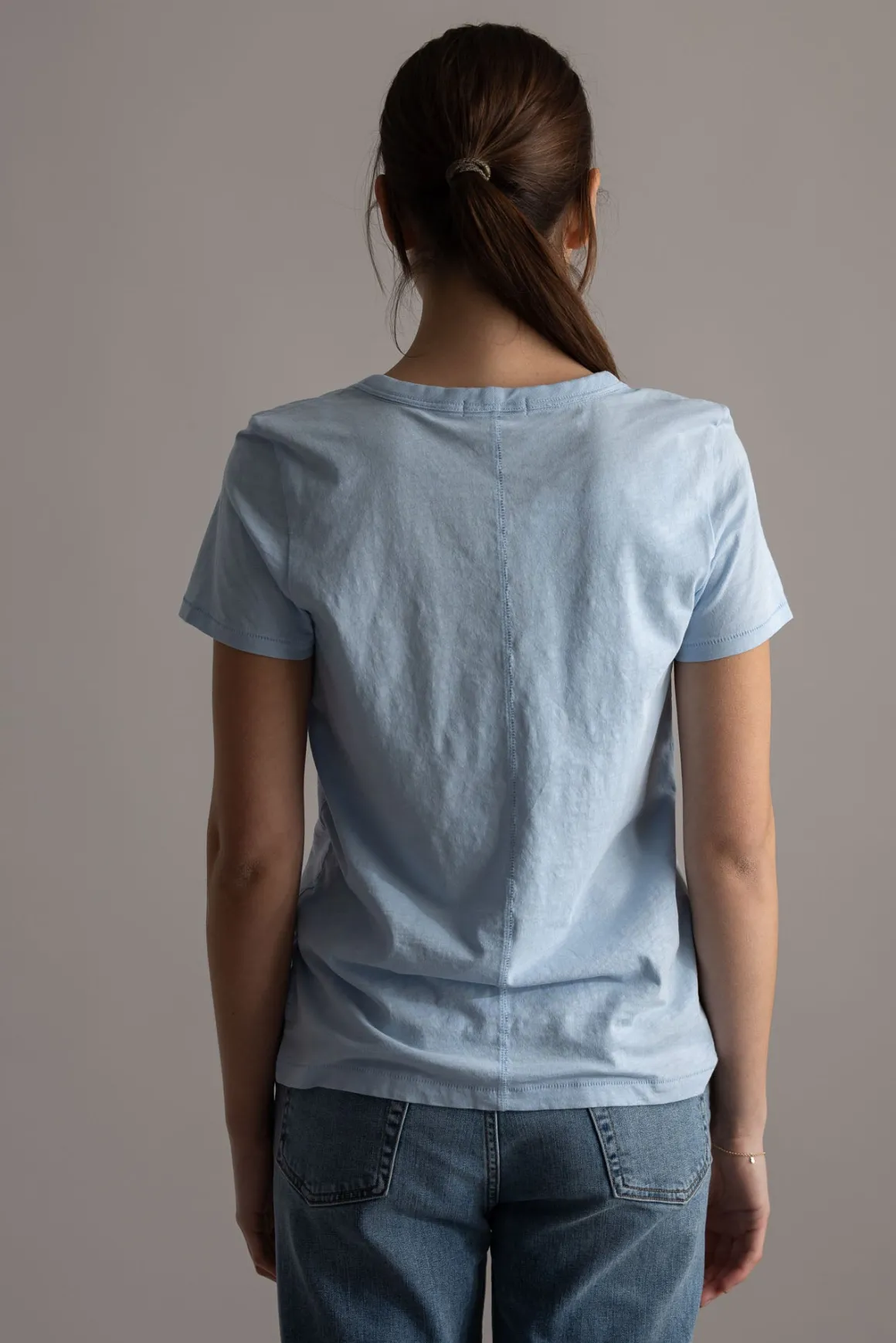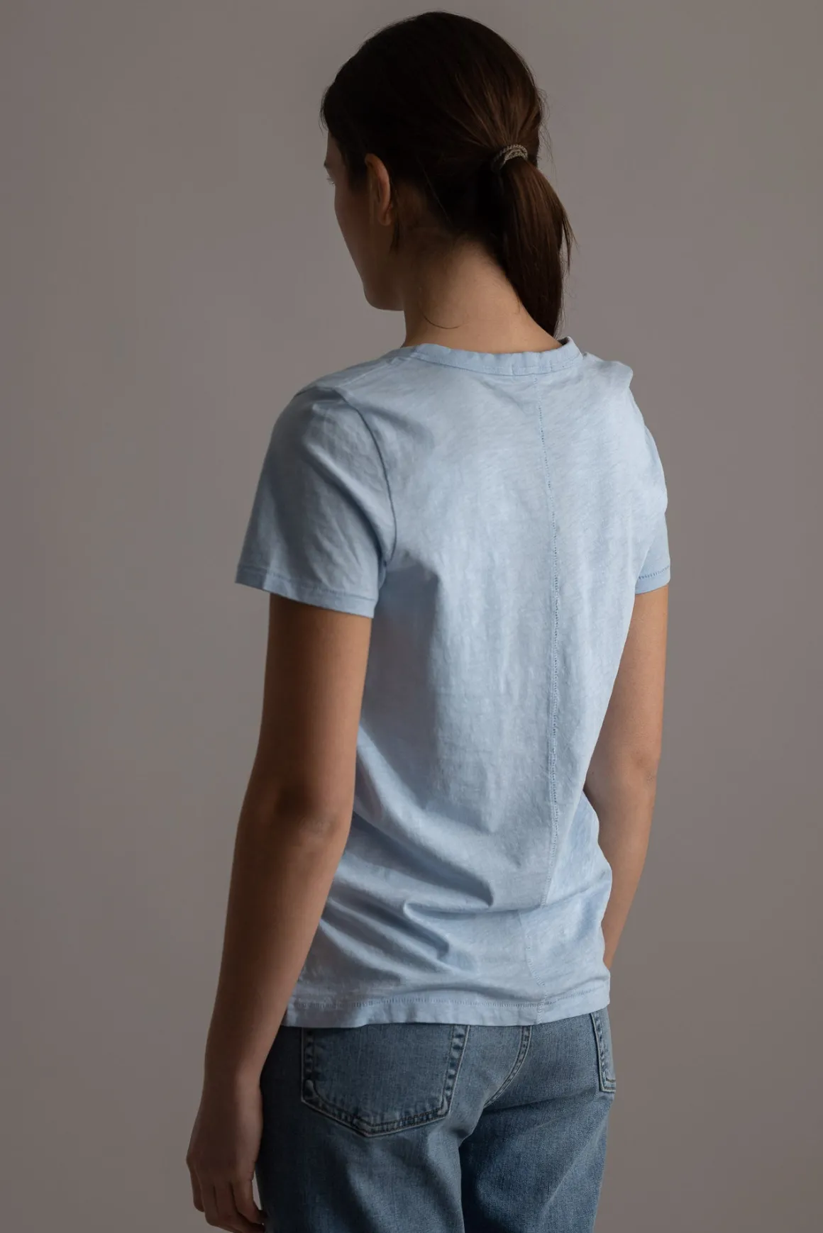 Ny garderobefavoritt fra Ragu0026amp;Bone. Denne klassiske t-skjorten i en fresh lyseblå farge er nøye utformet med en slank passform og korte ermer, og er skreddersydd for å tilby både komfort og holdbarhet. Laget av 100% pima-bomull som er kjent for sin myke og utrolig gode kvalitet som igjen holder seg gjennom hver vask. T-skjorten har et tidløst snitt som enkelt kan kombineres med jeans og sneakers for en uformell stil, eller under en blazer for en moderne vri. Et essensielt tilskudd til basegarderoben.