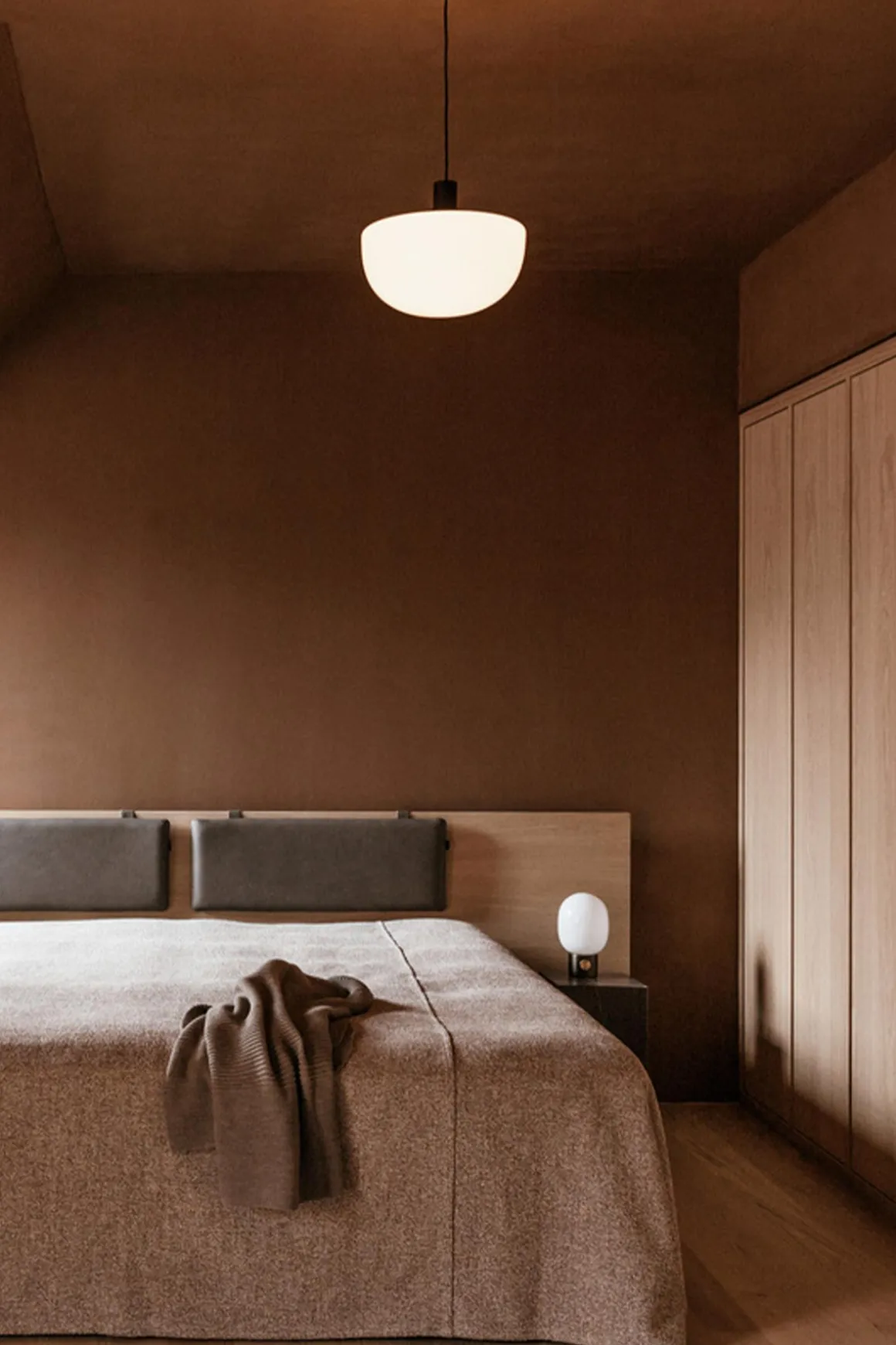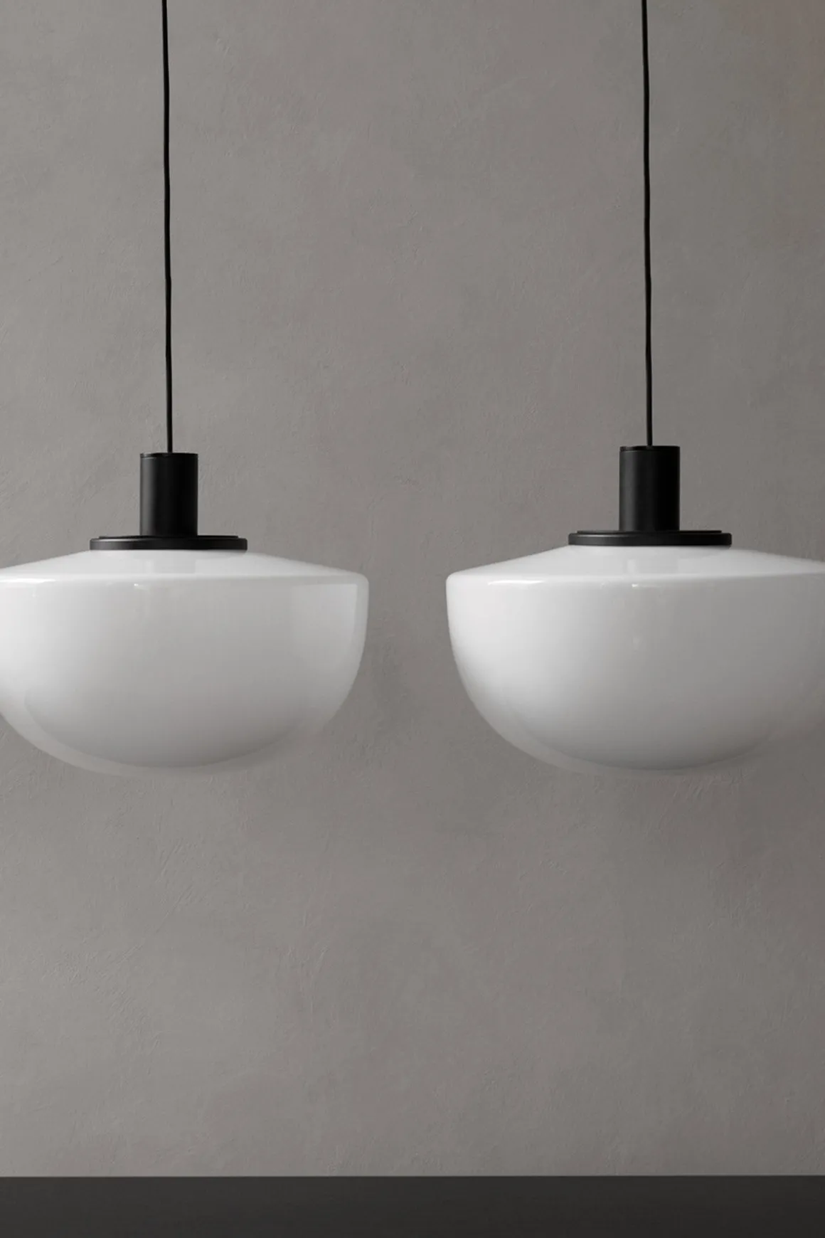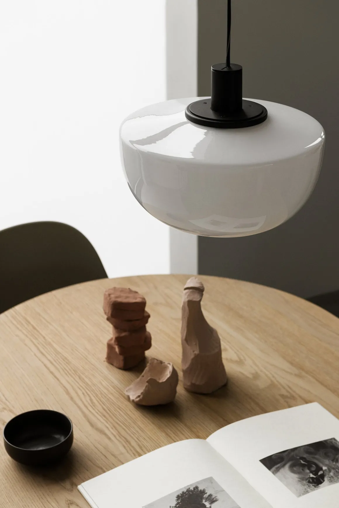 Bank Pendant taklampe, designet av Norm Architects. Lampen fås i opalglass eller grått, munnblåst glass med base av sort, anodisert aluminium. Det matte glasset gir et jevnt 360-grader lys, som tilfører en behagelig atmosfære. Bank har et tidløst, solid design og enkelt formspråk som gjør lampen til en allsidig klassiker som kan brukes i mange rom. Heng den alene eller sammen med 2-3 andre over spisebordet, på kjøkkenet, på soverommet eller i gangen.