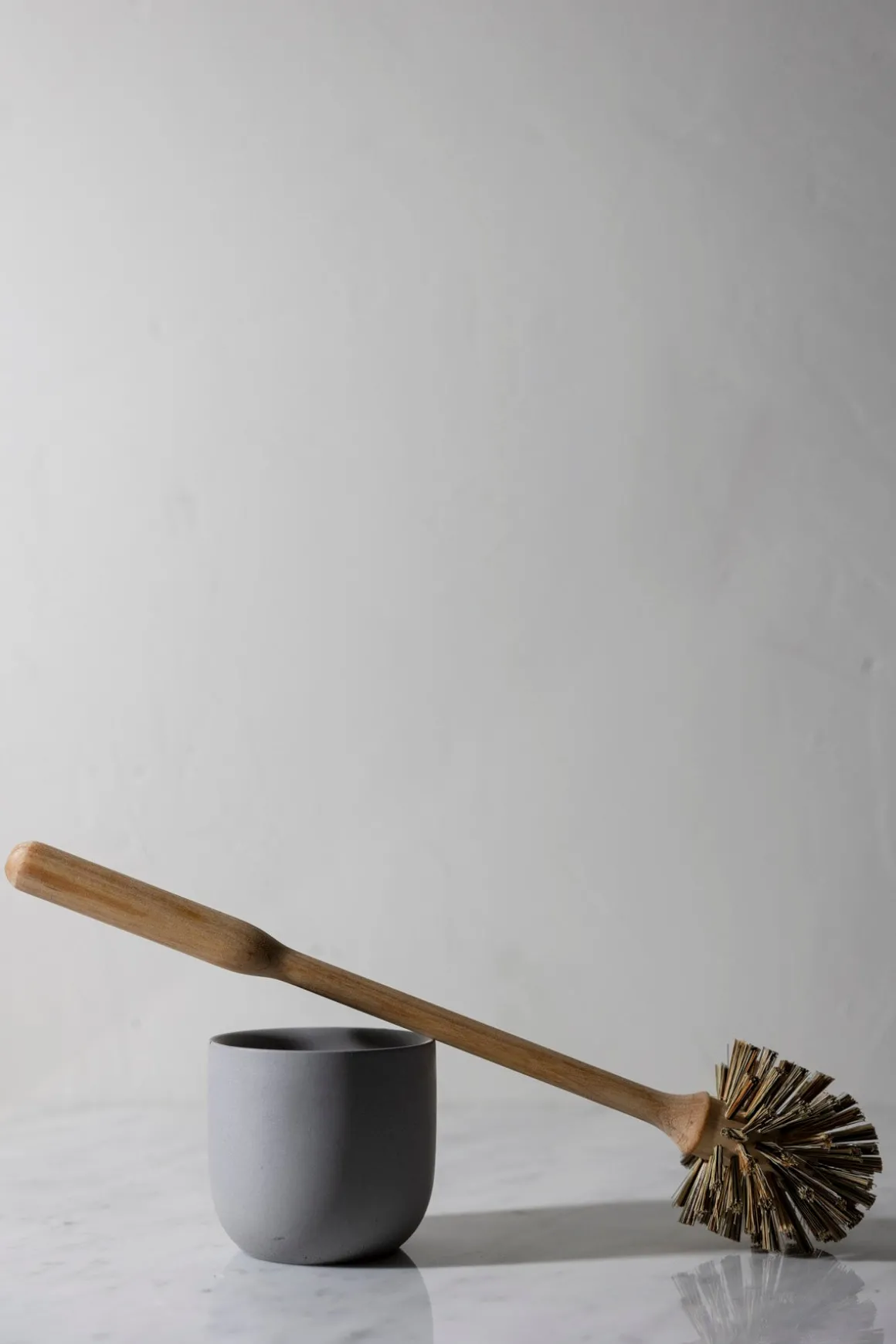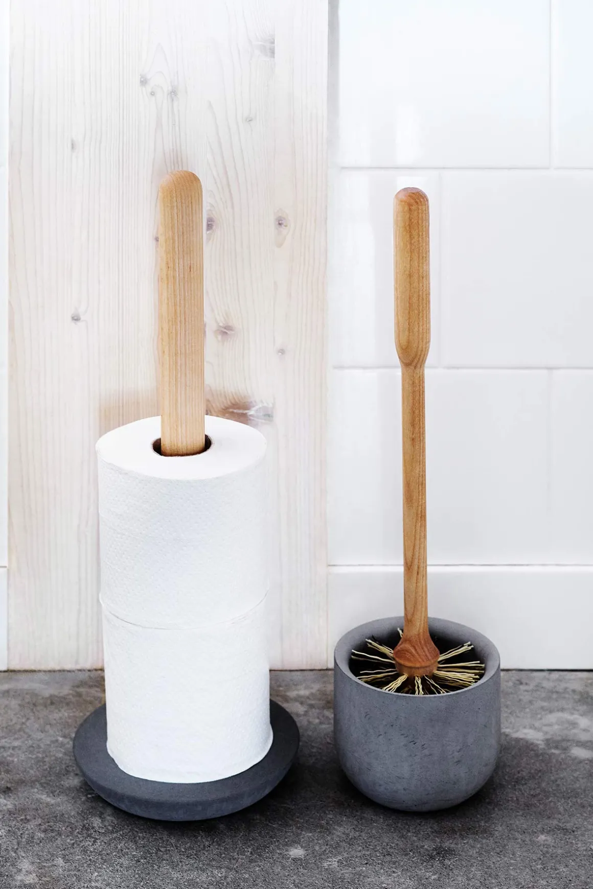 Toalettbørste fra svenske Iris Hantverk, med kopp av betong og børste i bjørk og polypropen. Betongen er blandet med plastikk, slik at den er hakket mer elastisk uten å bli for myk. Laget for hånd av svaksynte i Iris Hantverk’s fabrikk utenfor Stockholm.