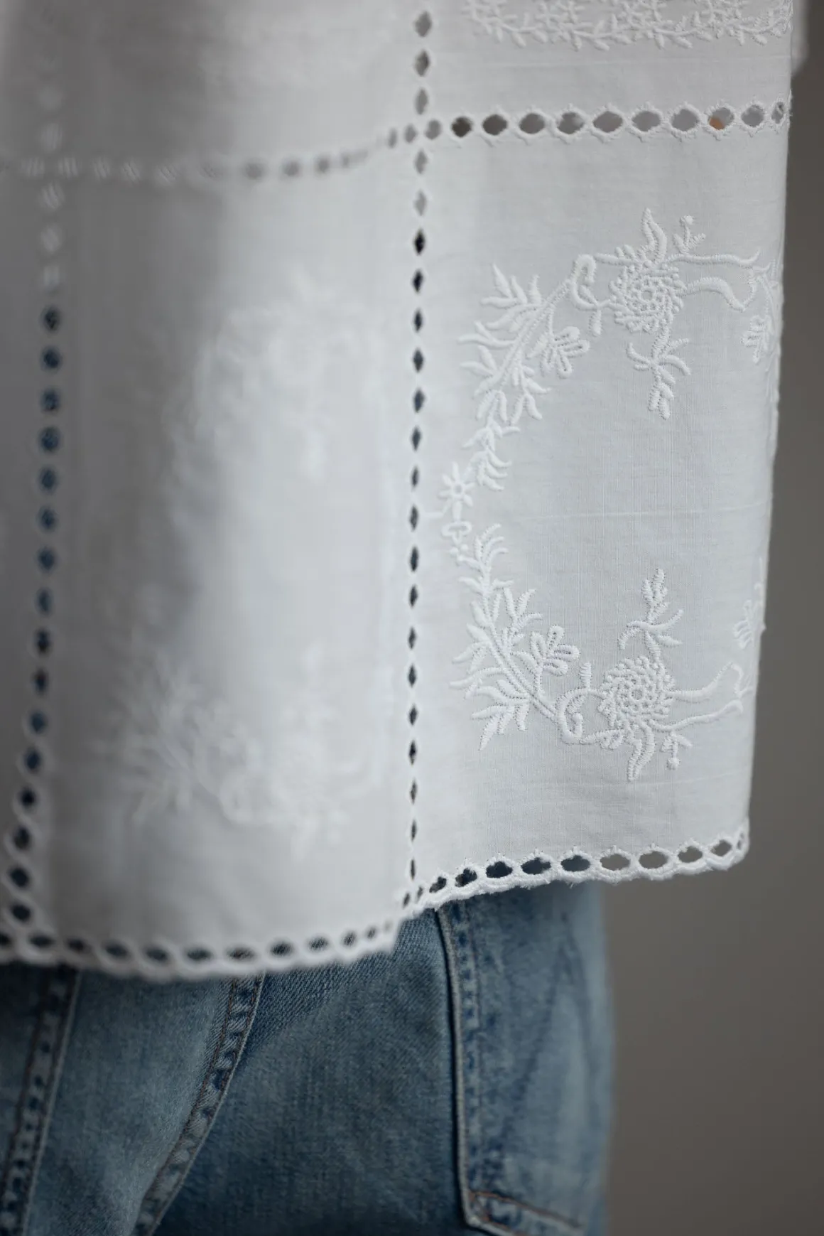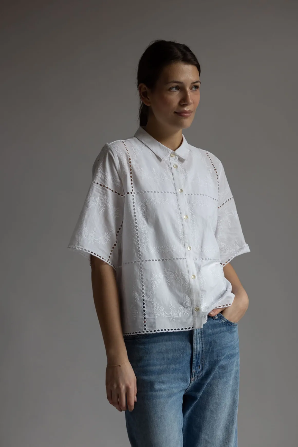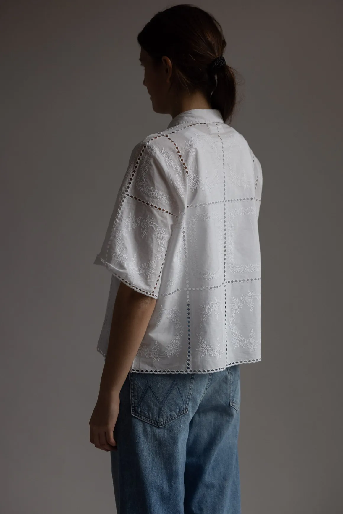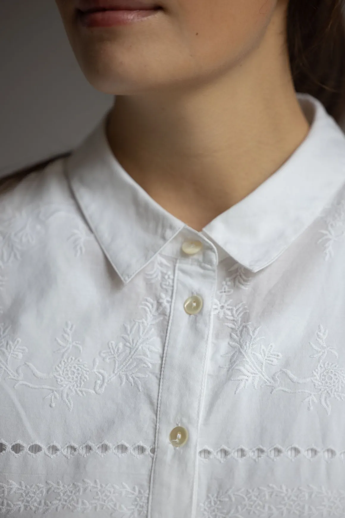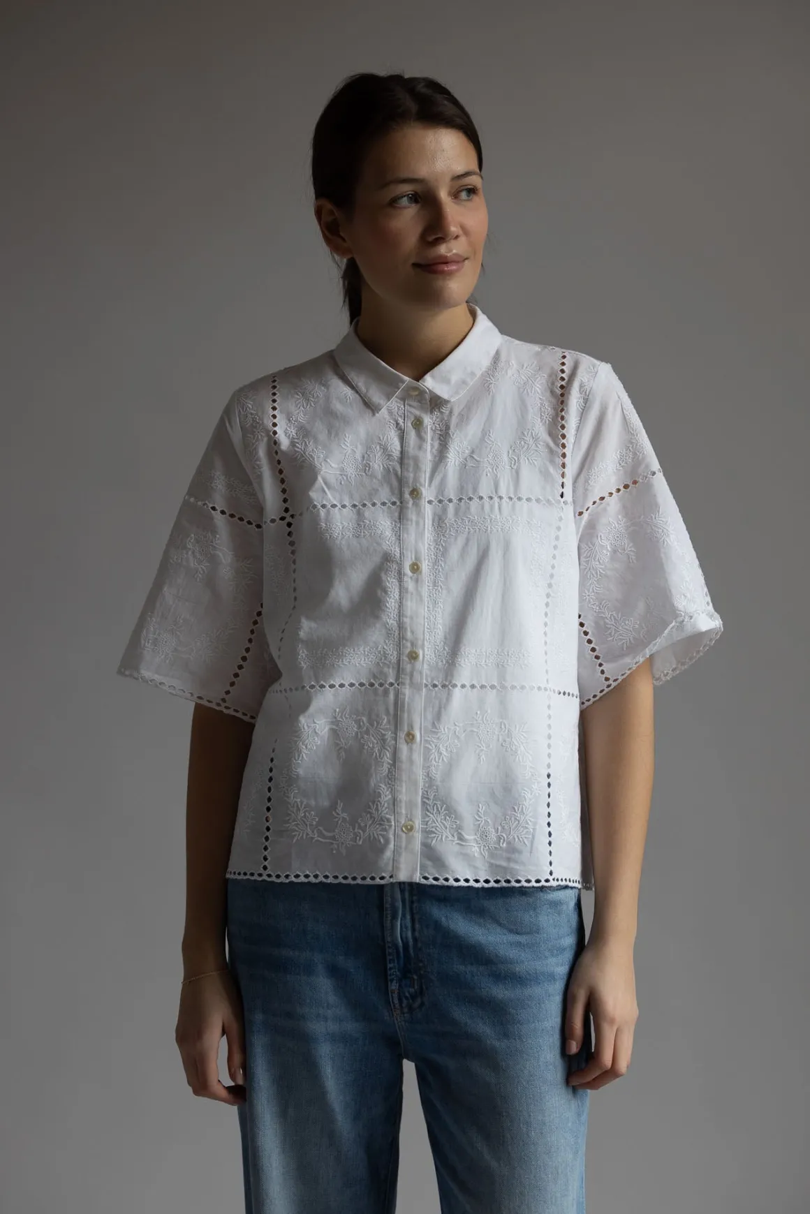 Anemone-skjorten fra Skall Studio er en skjorte med korte ermer og vakkert broderi, laget av økologisk bomull med blonder. Skjorten har en klassisk krage, t-skjorteermer med en diskret bølgekant og perlemorsknapper.