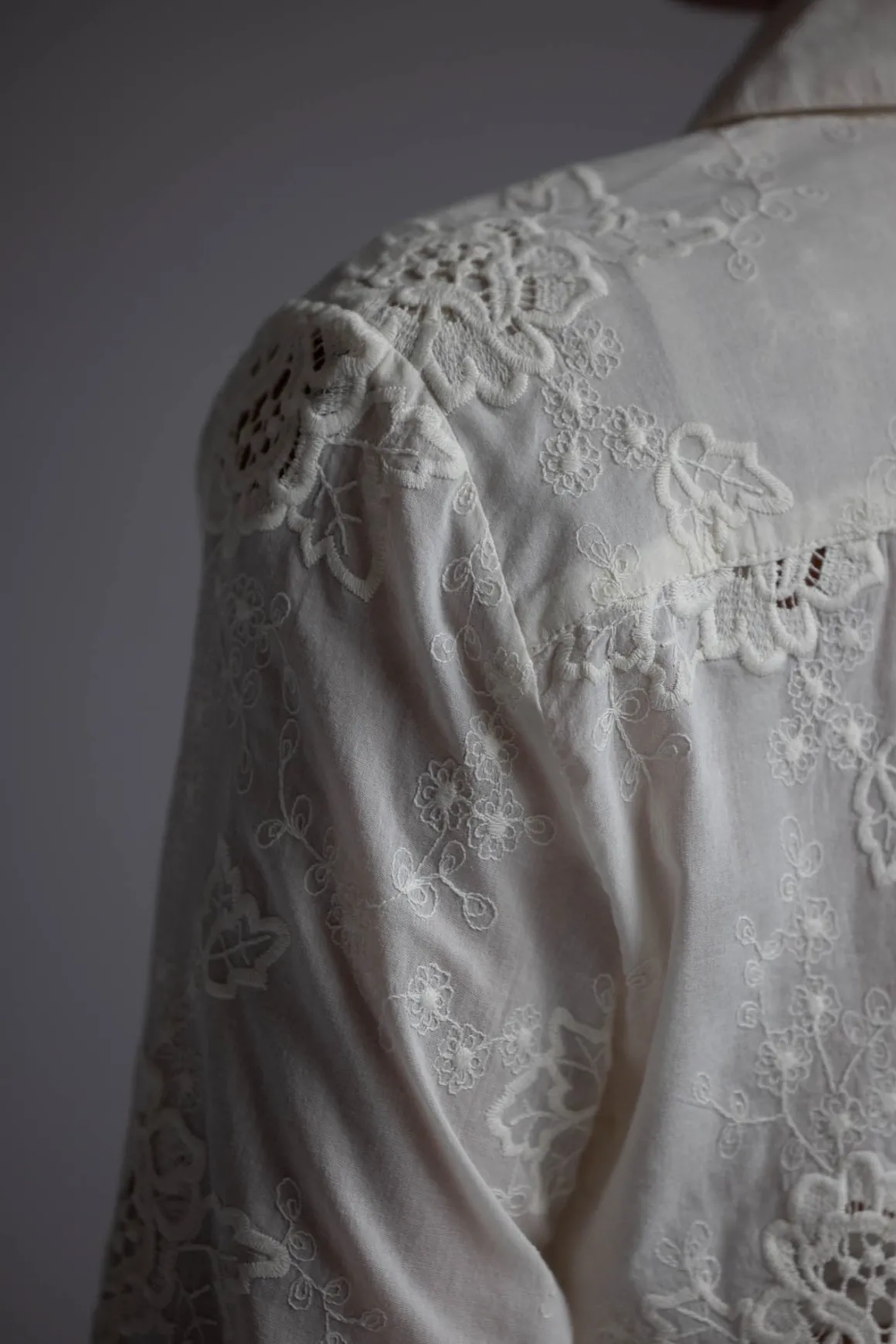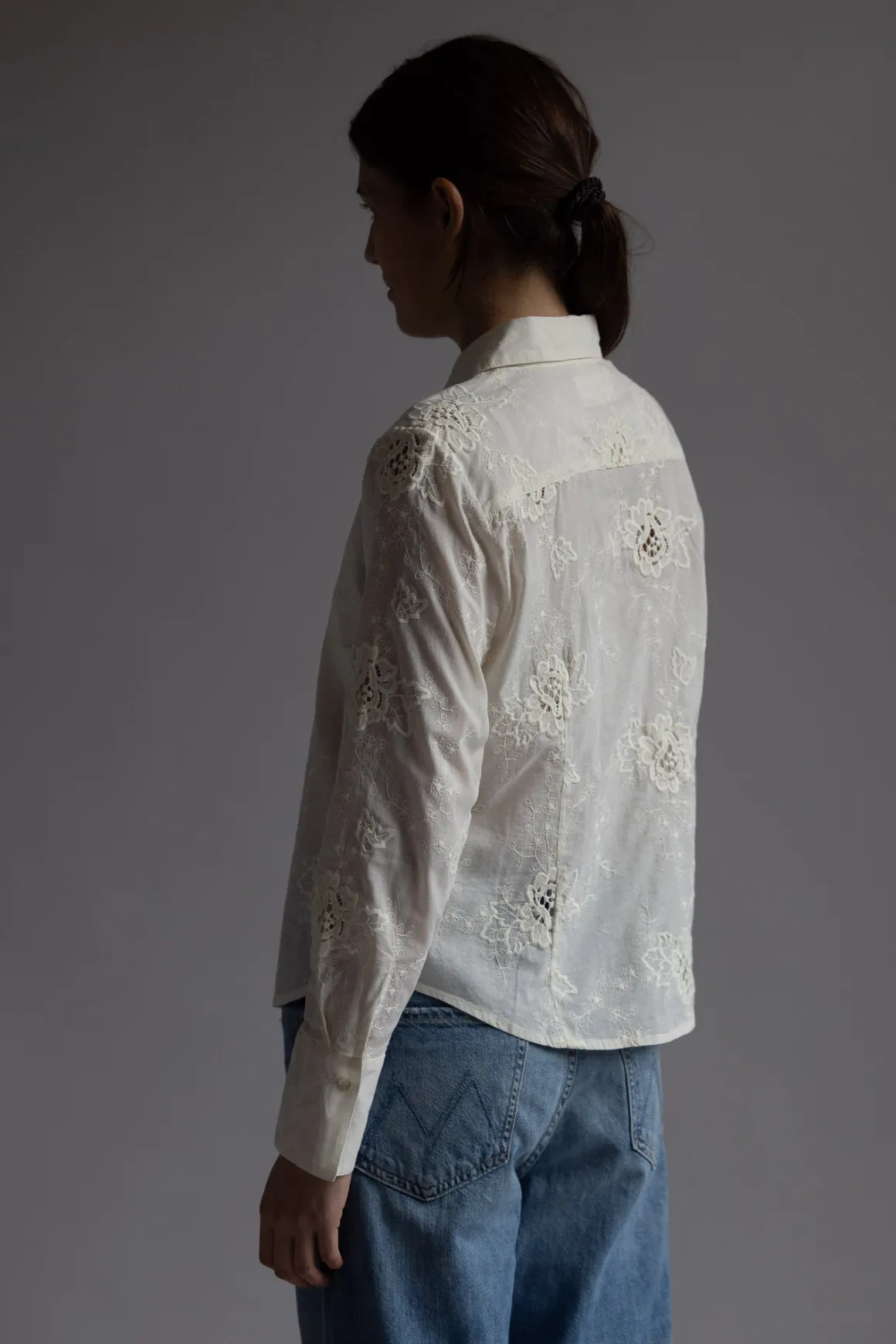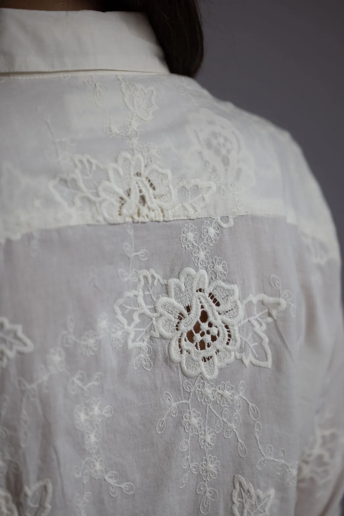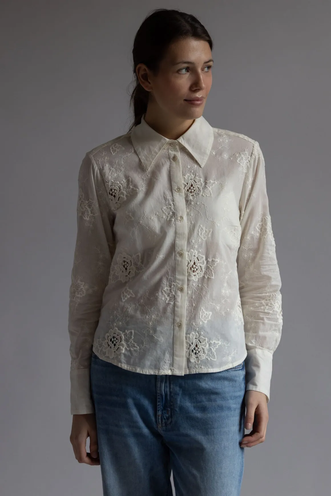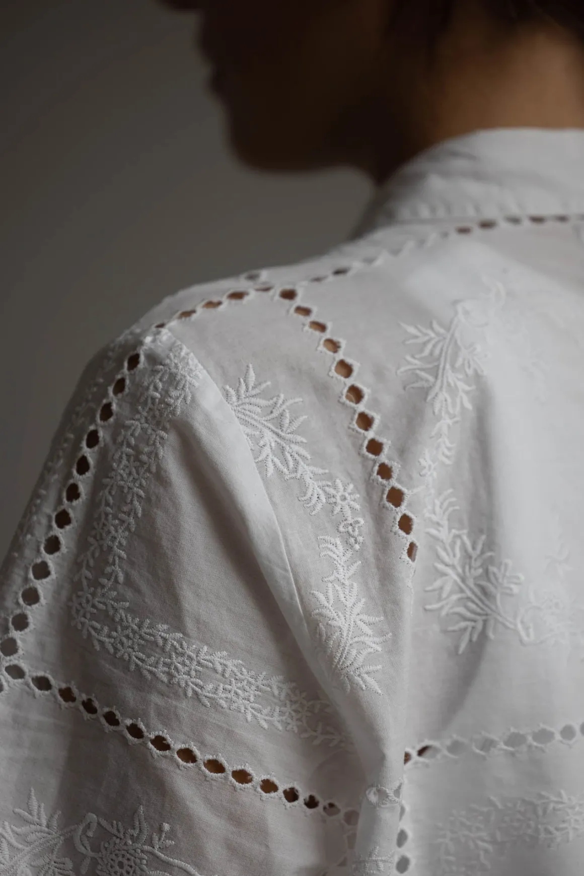 Anemone-skjorten fra Skall Studio er en skjorte med korte ermer og vakkert broderi, laget av økologisk bomull med blonder. Skjorten har en klassisk krage, t-skjorteermer med en diskret bølgekant og perlemorsknapper.