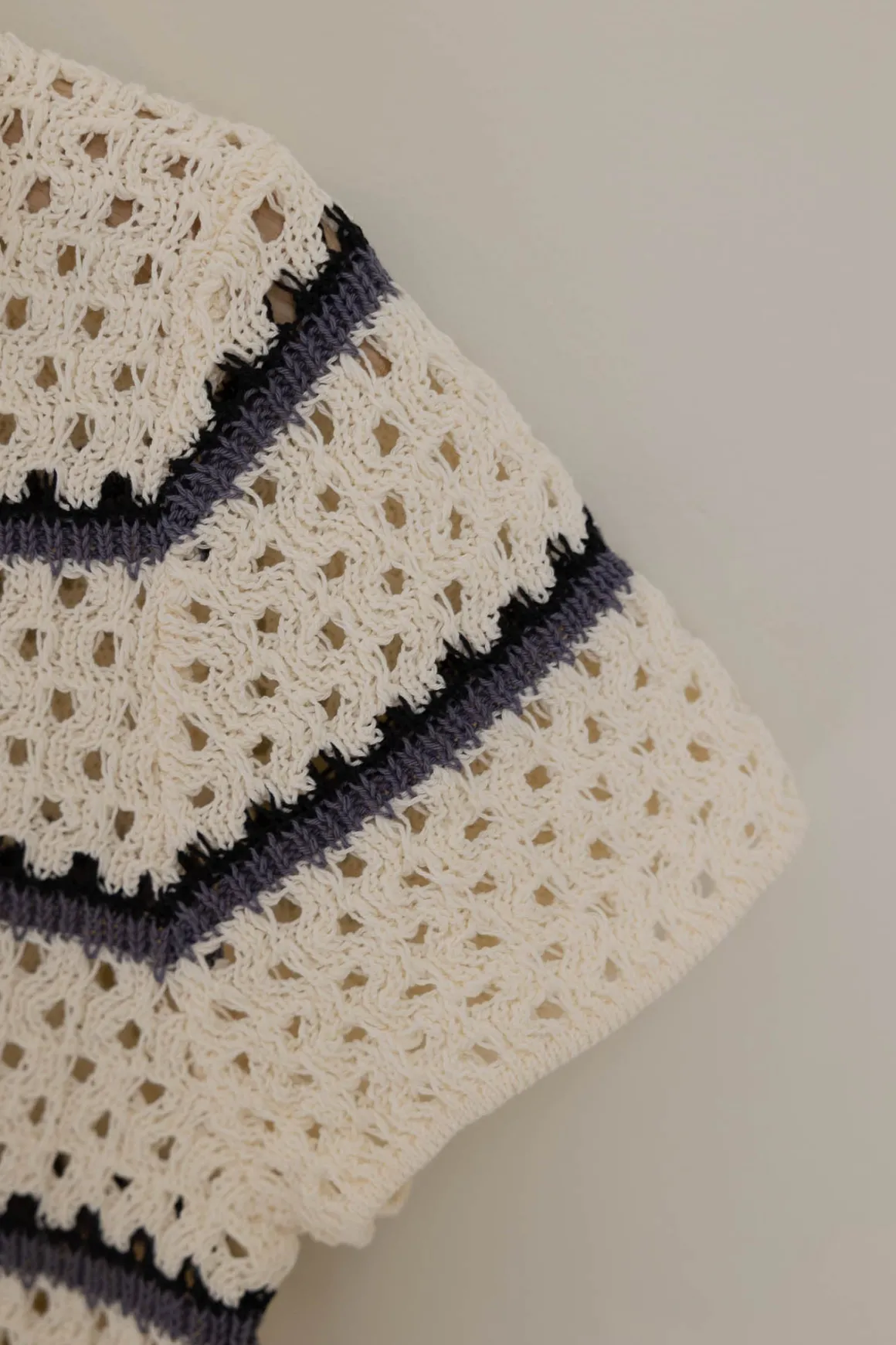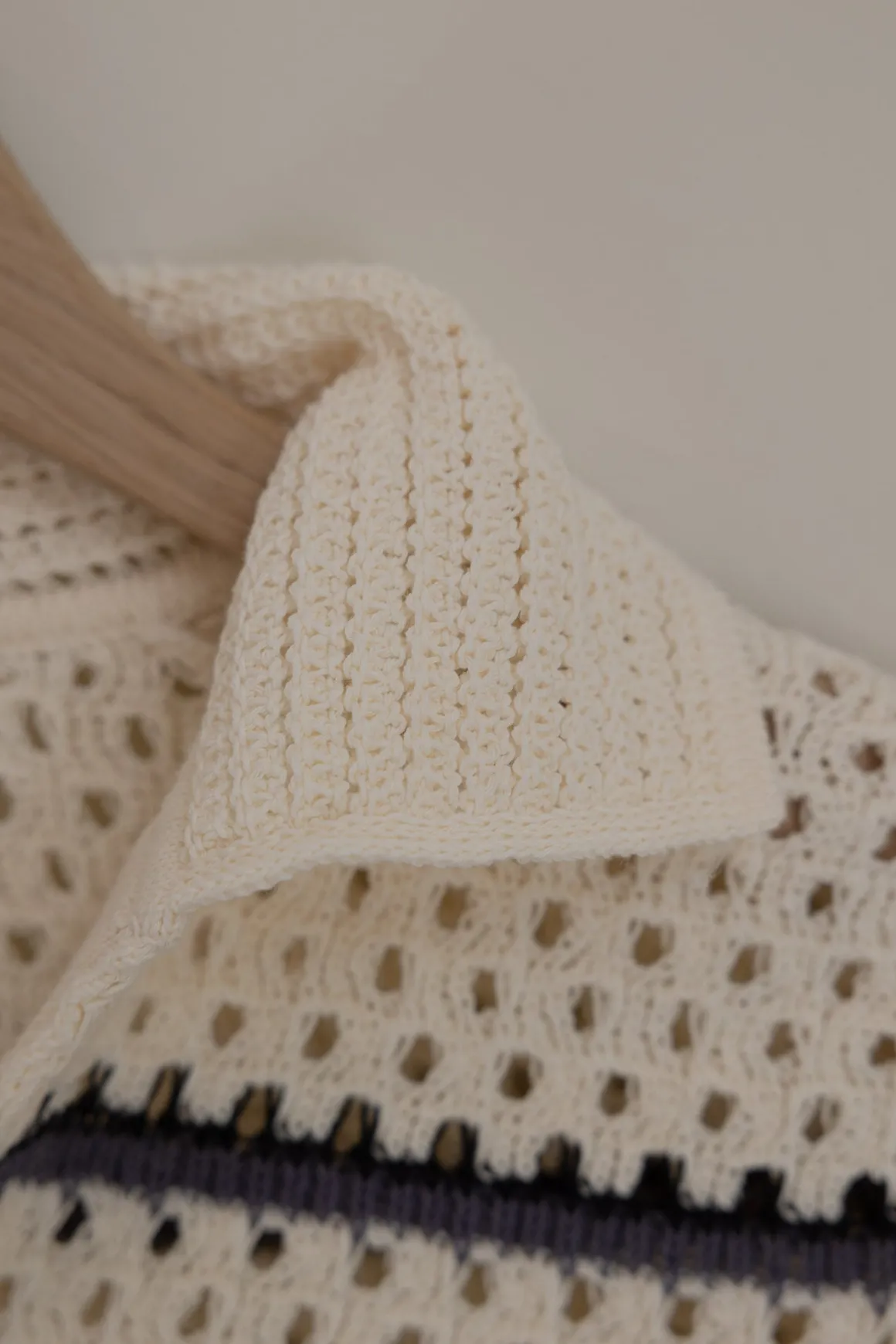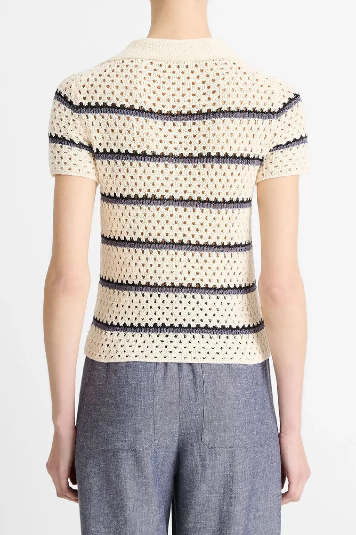 Strikket pologenser fra Vince i italiensk bomull med åpen macramé-struktur som gir letthet, luft og en spennende tekstur. De klassiske marineblå stripene mot kremfarget bunn skaper et tidløst uttrykk med sommerlig preg, mens kragen og den dype V-halsen tilfører en avslappet silhuett. Perfekt til alt fra linbukser og denim til shorts og skjørt – både på reise og til hverdags i byen.