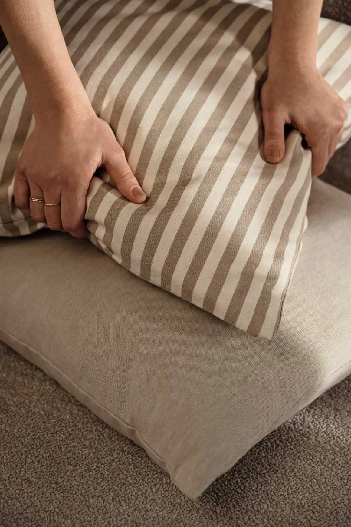 Bærekraftig utendørs pute fra Ferm Living i økologisk bomull fylt med resirkulert polyester. Infundert med vannavstøtende og UV-resistent behandling, er denne puten perfekt egnet for utendørs bruk.