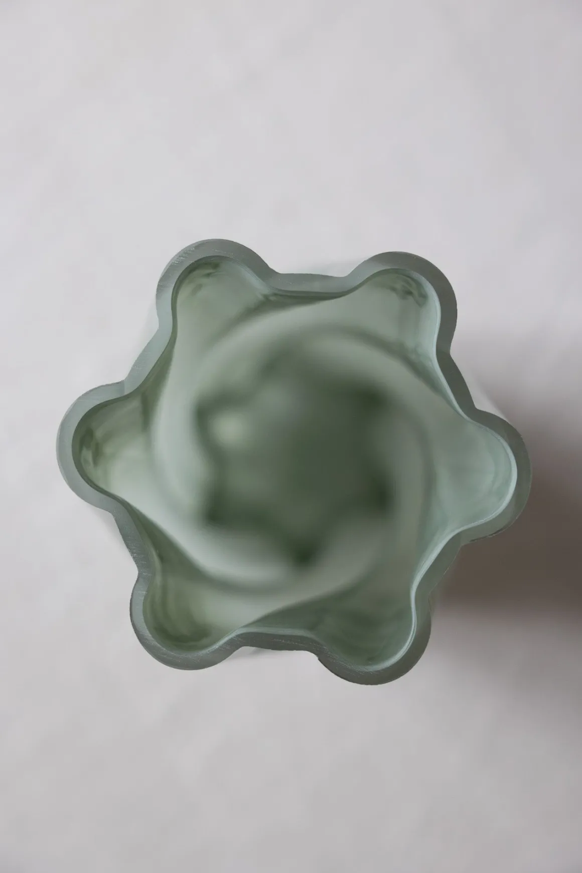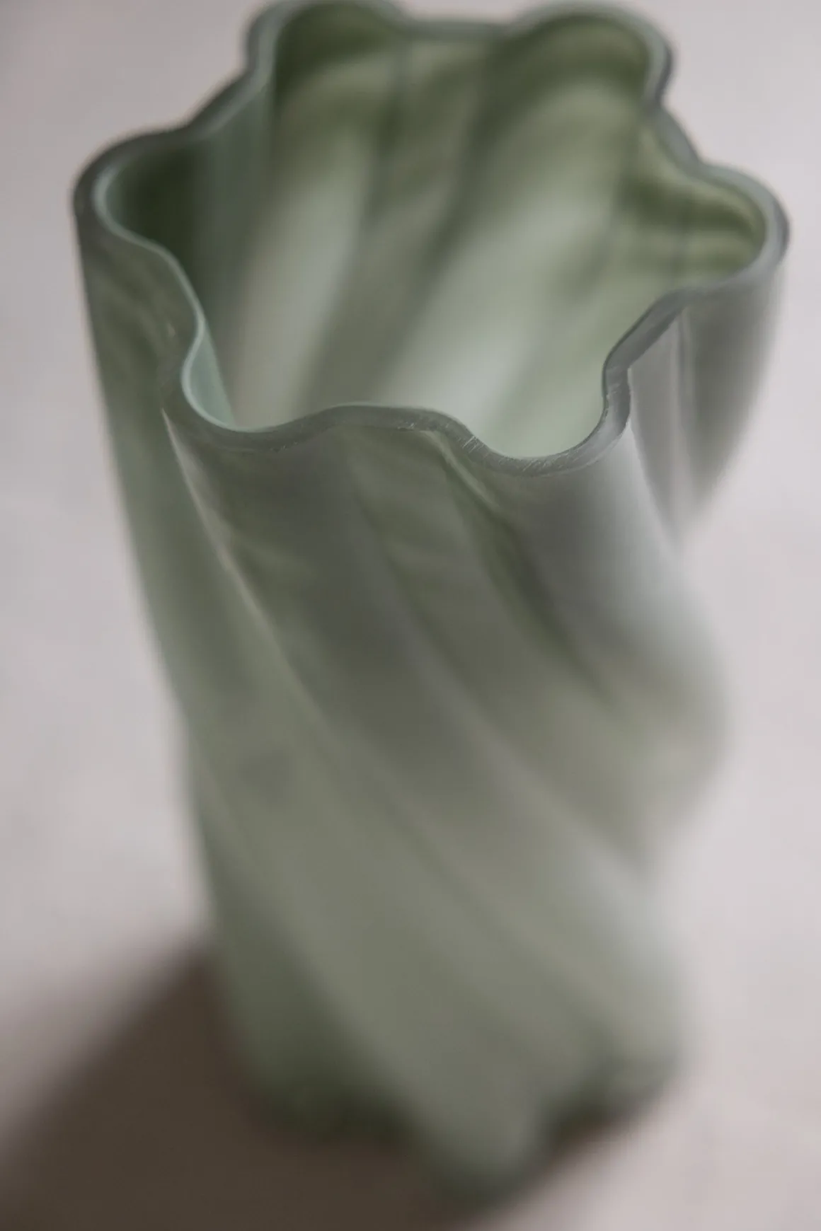 Vasen i grønt glass. Vasen har en slående vridd form som gir den en følelse av bevegelse og flyt. Den dype grønnfargen sammen med den vridde overflaten skaper et spennende og unikt uttrykk. Vasen er perfekt for større blomsteroppsatser eller som et dekorativt element som står alene, og fargen tilfører en naturlig og avslappet stemning til rommet.