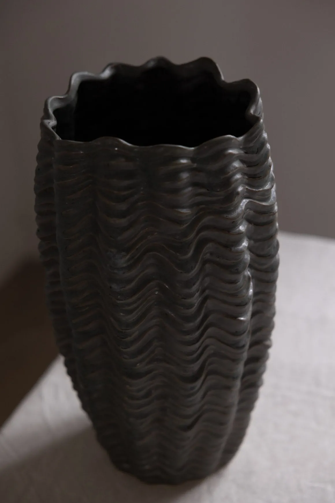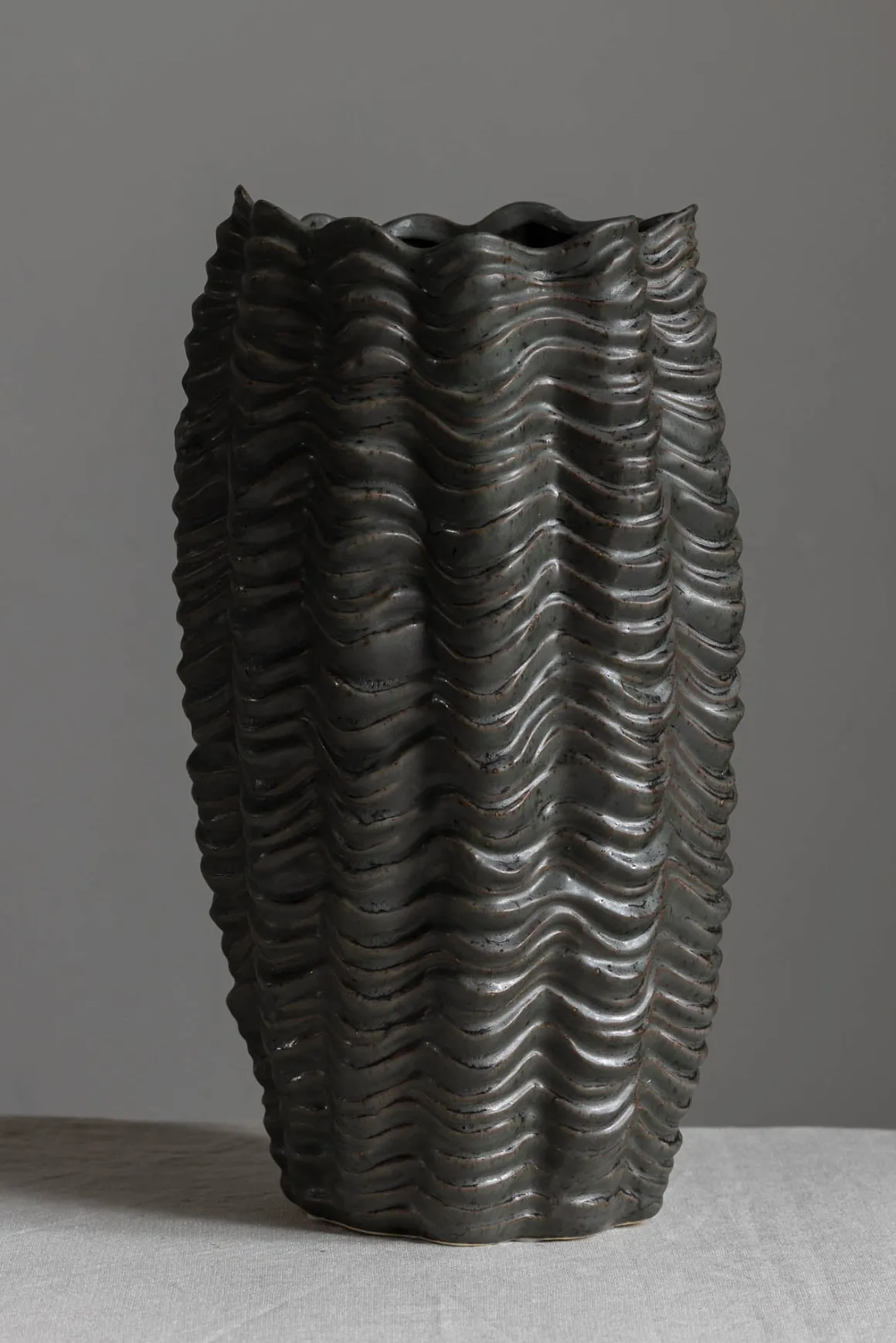 Grønn keramikkvase. Vasen har en unik, bølgende overflate som skaper en skulpturell effekt. Den dype grønne fargen og den keramiske finishen gir en rå, naturlig følelse som står i kontrast til strukturen. Vasen blir et iøynefallende element i rommet, enten den brukes til blomster eller som et dekorativt objekt i seg selv.