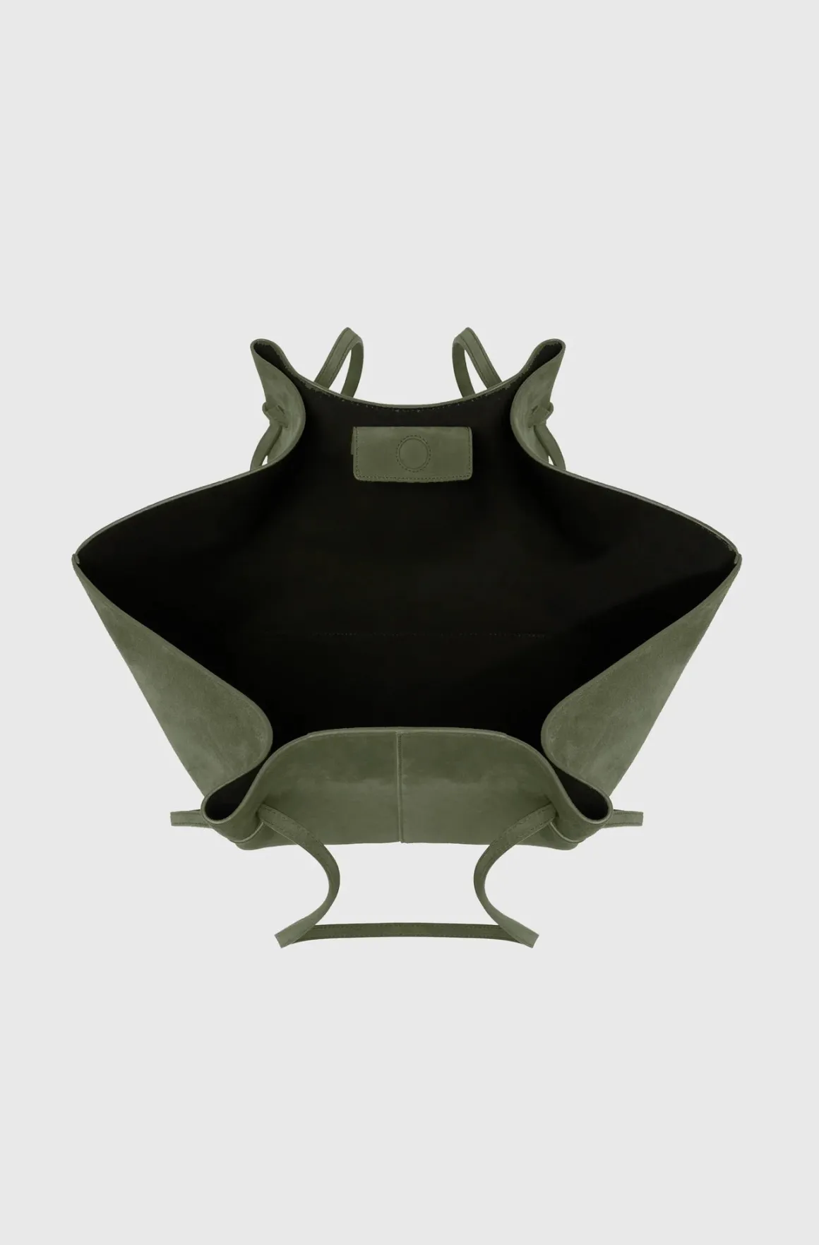 Mochi skulderveske i den største modellen i en nydelig grønnfarge – Birch. Den har de karakteristiske organiske formene, myke folder og knutedetaljer. Vesken er laget av eksklusiv italiensk semsket skinn, og har justerbare stropper som lar deg bære den i hånden eller over skulderen. Den lukkes enkelt med en magnet og har plass til alt du trenger i hverdagen.