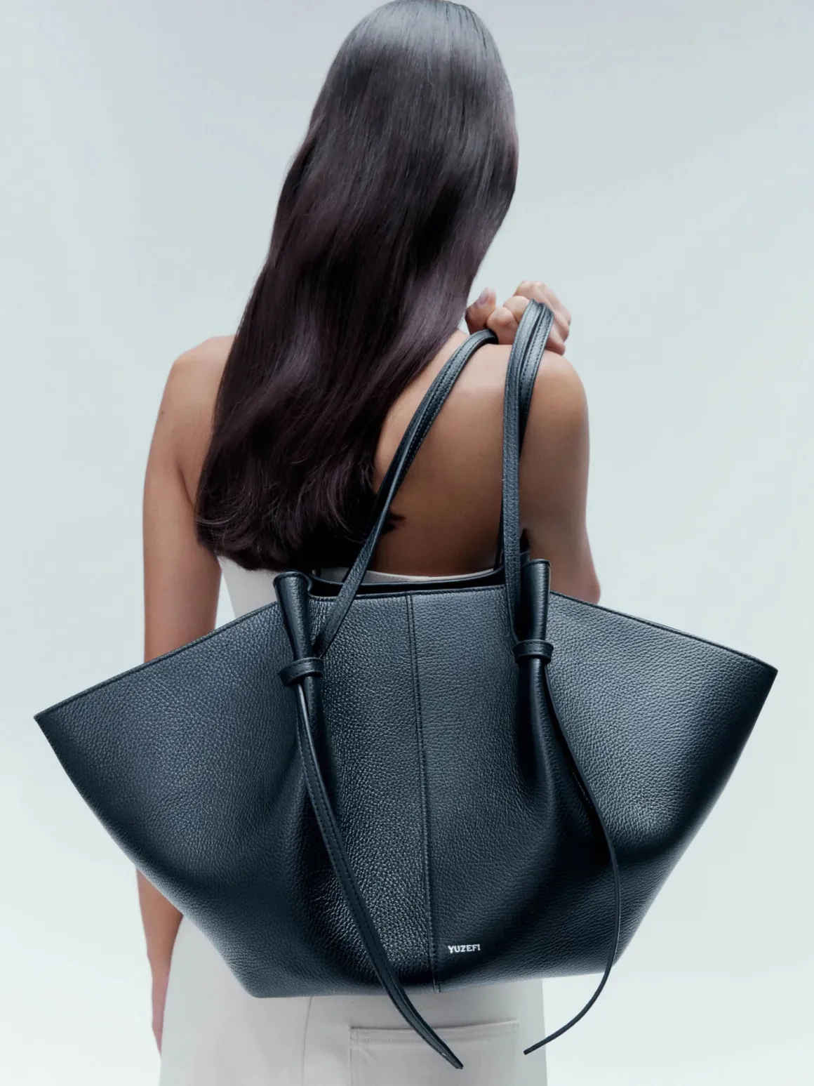 Mochi skulderveske i den største modellen i klassisk glatt sort skinn. Den har de karakteristiske organiske formene, myke folder og knutedetaljer. Vesken er laget av eksklusiv italiensk skinn, og har justerbare stropper som lar deg bære den i hånden eller over skulderen. Den lukkes enkelt med en magnet og har plass til alt du trenger i hverdagen.