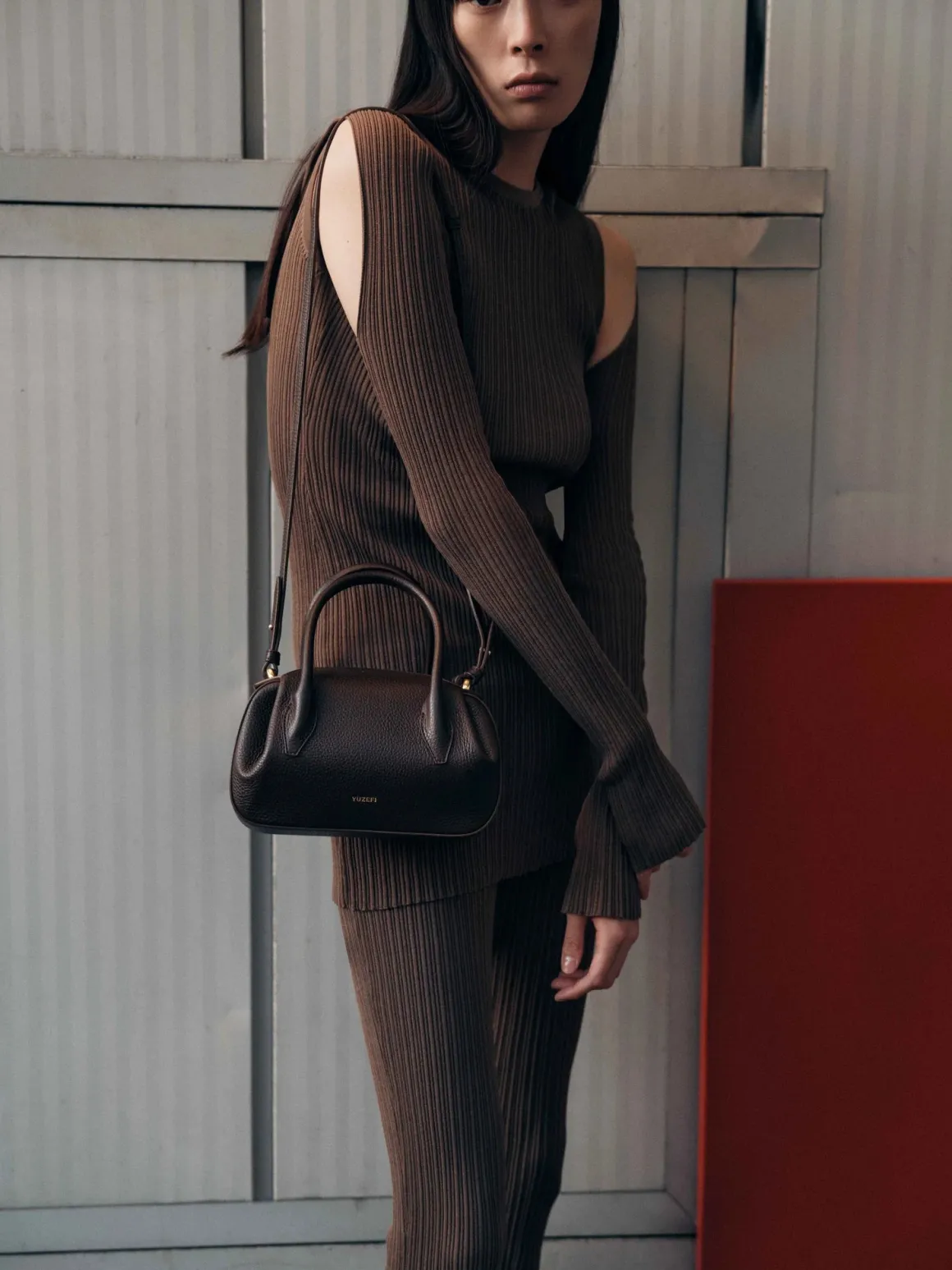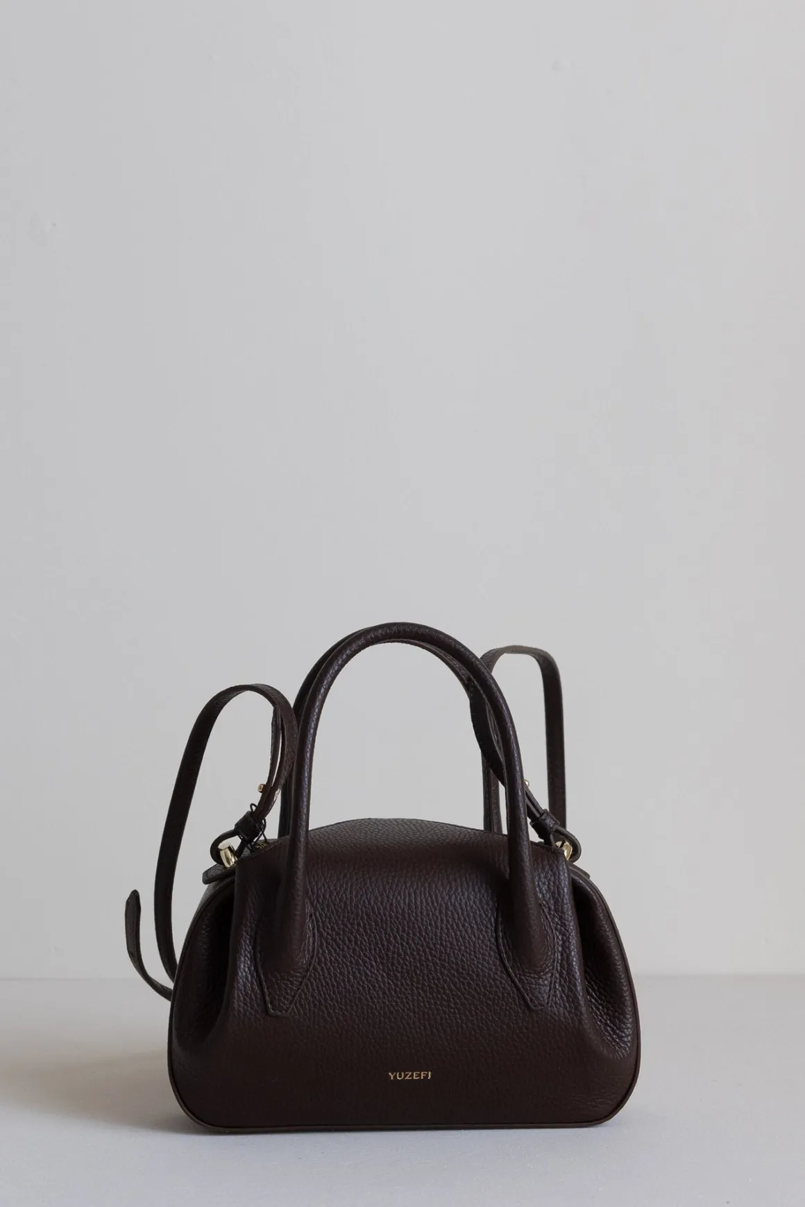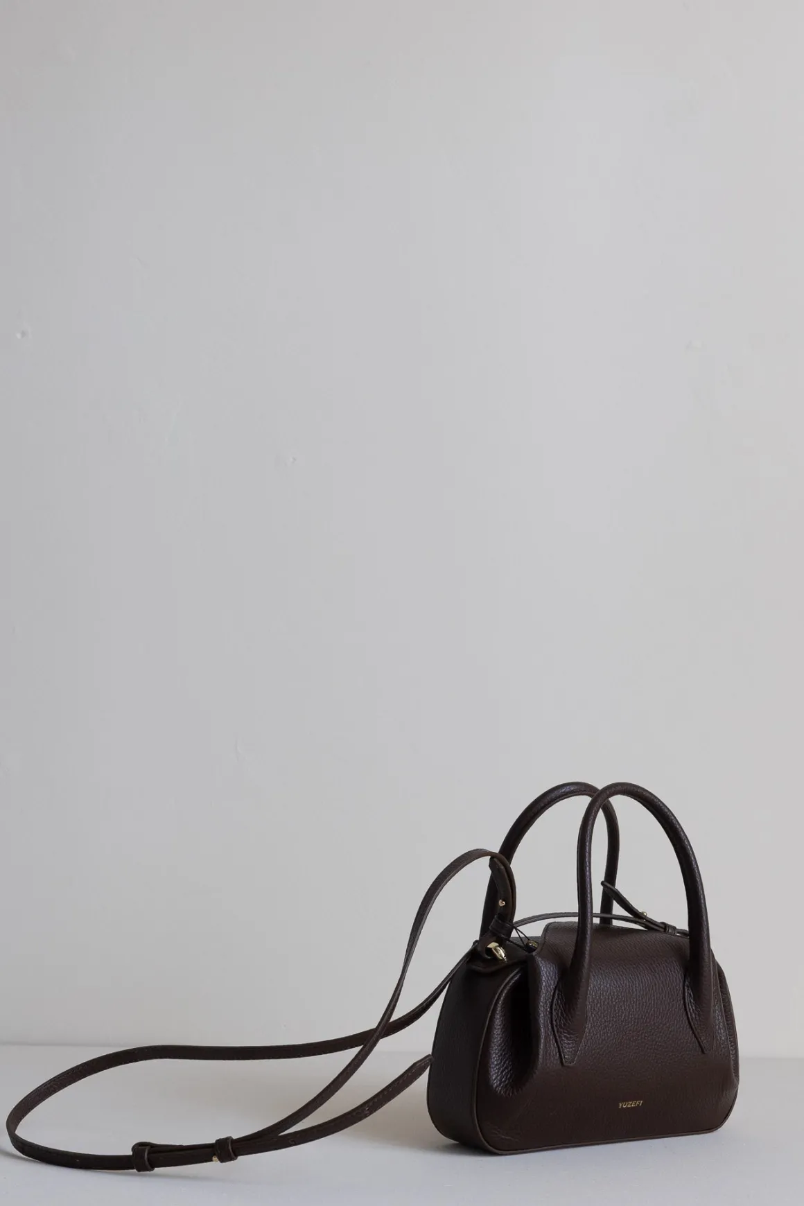 The Mini Oyster Duffle er laget av førsteklasses italiensk espressofarget skinn med pebble-grain tekstur. Vesken har et topphåndtak og en skinnrem som kan bæres crossbody. Den kompakte størrelsen gjør den perfekt til nødvendigheter, og den lukkes med en magnet.