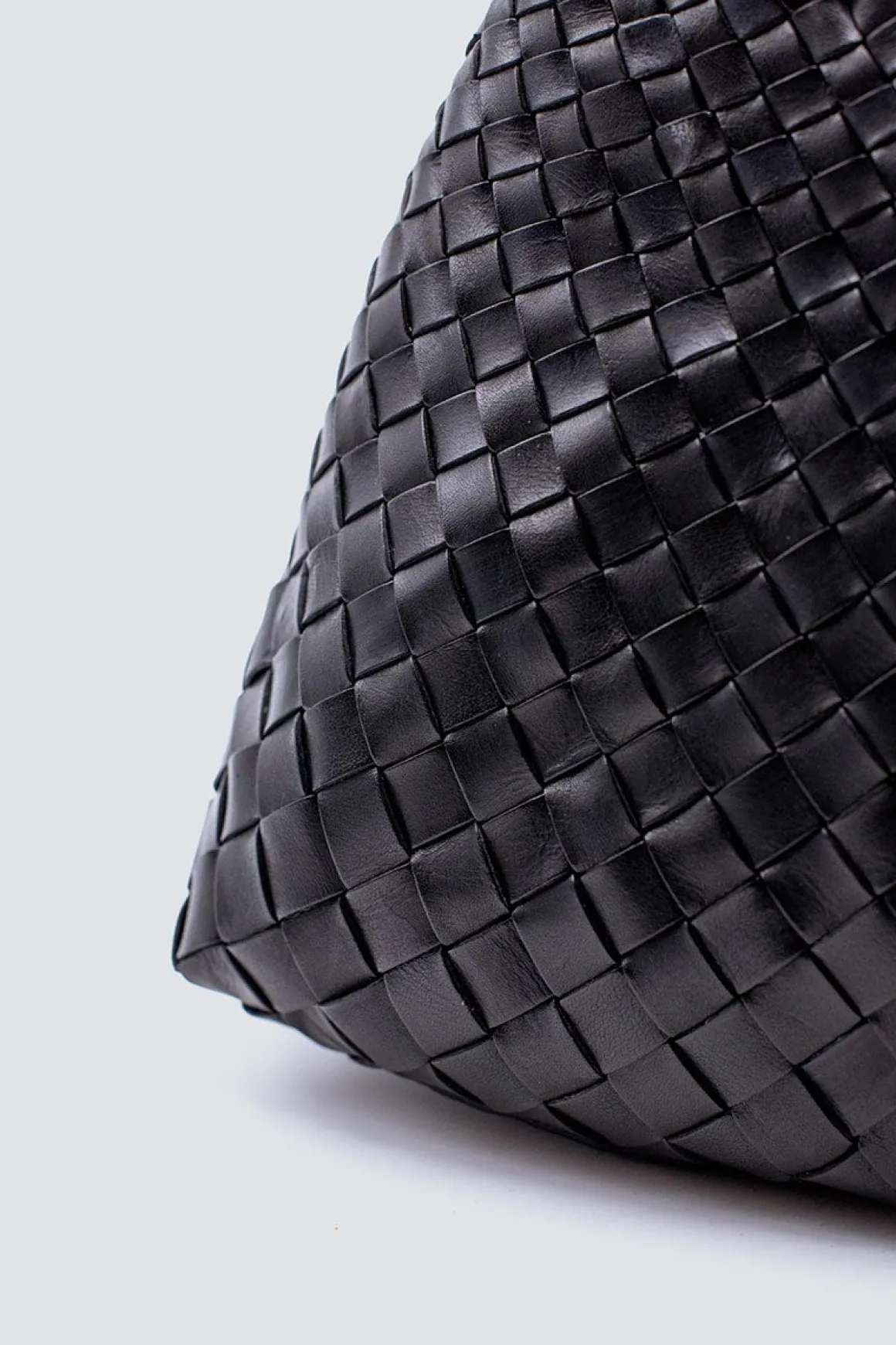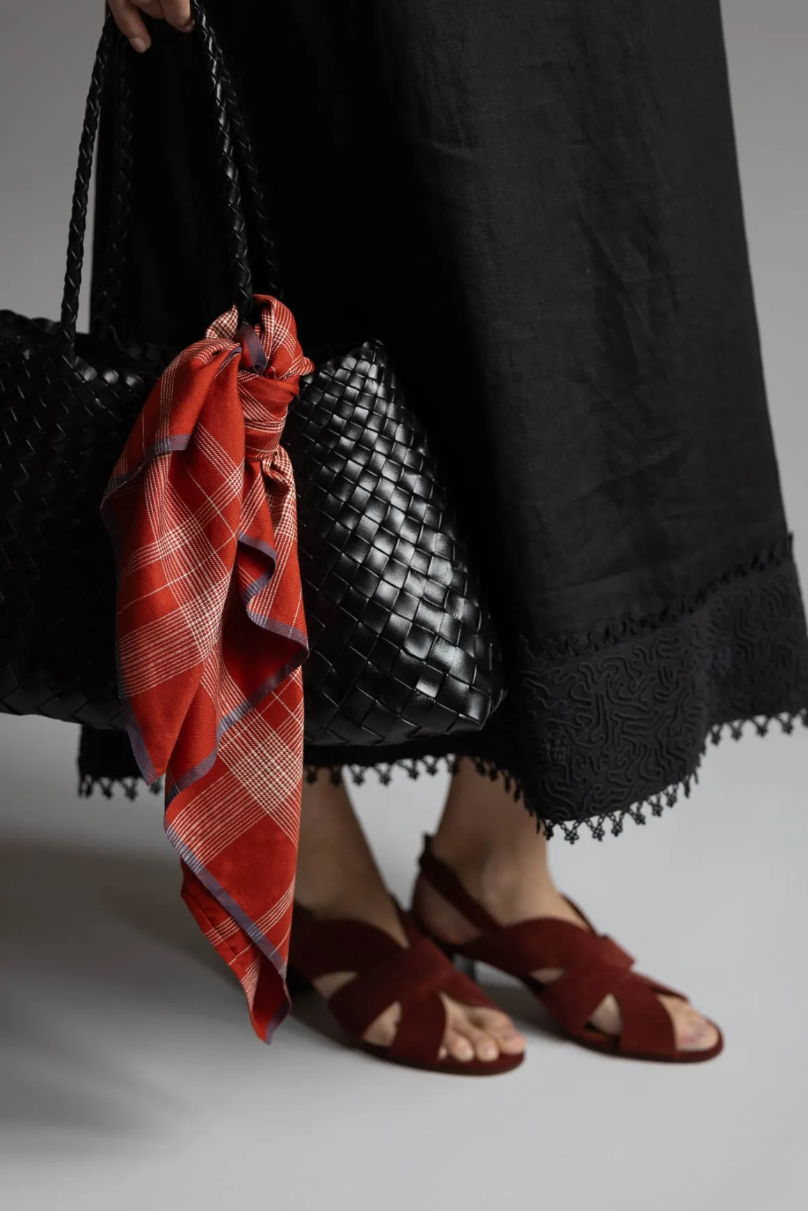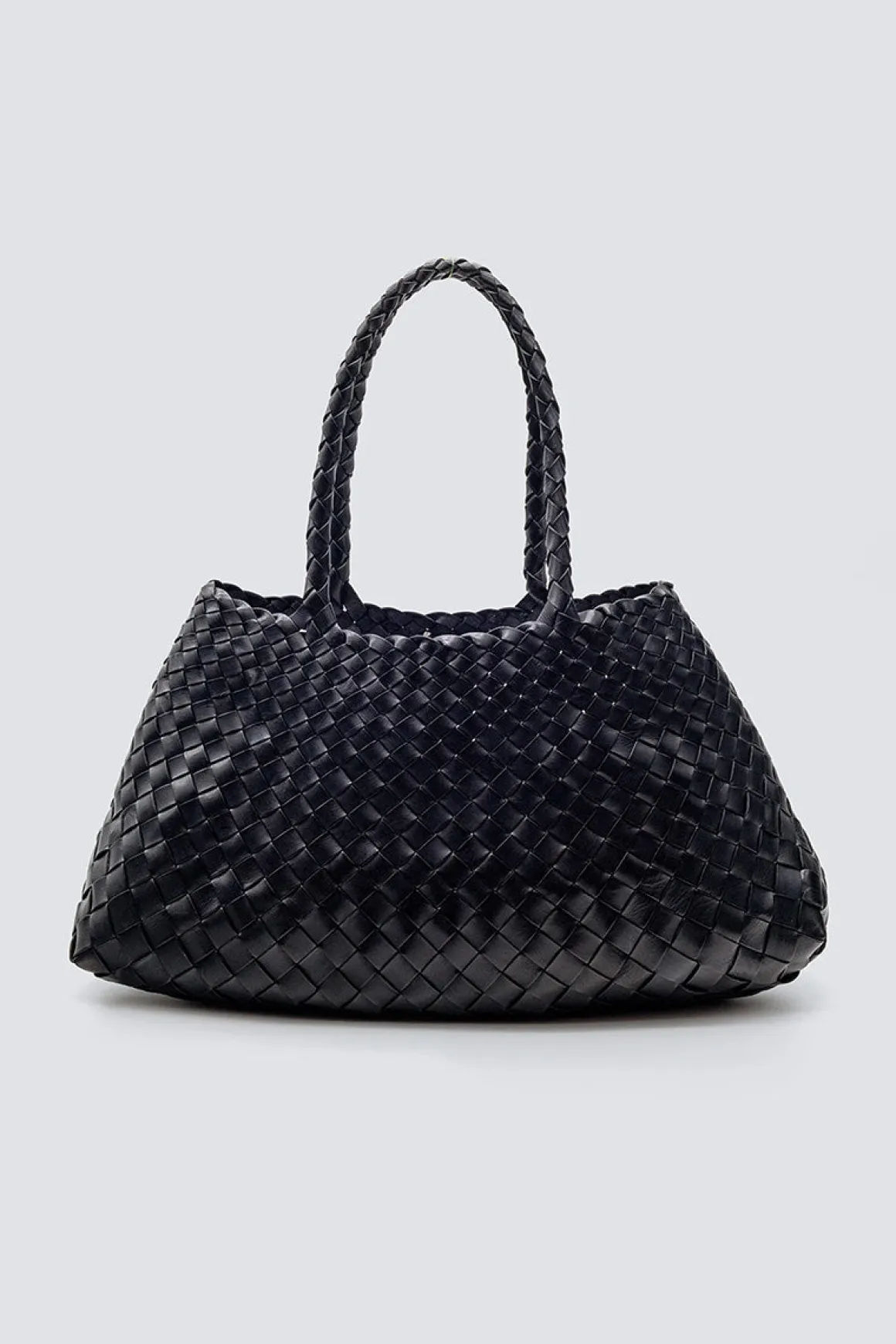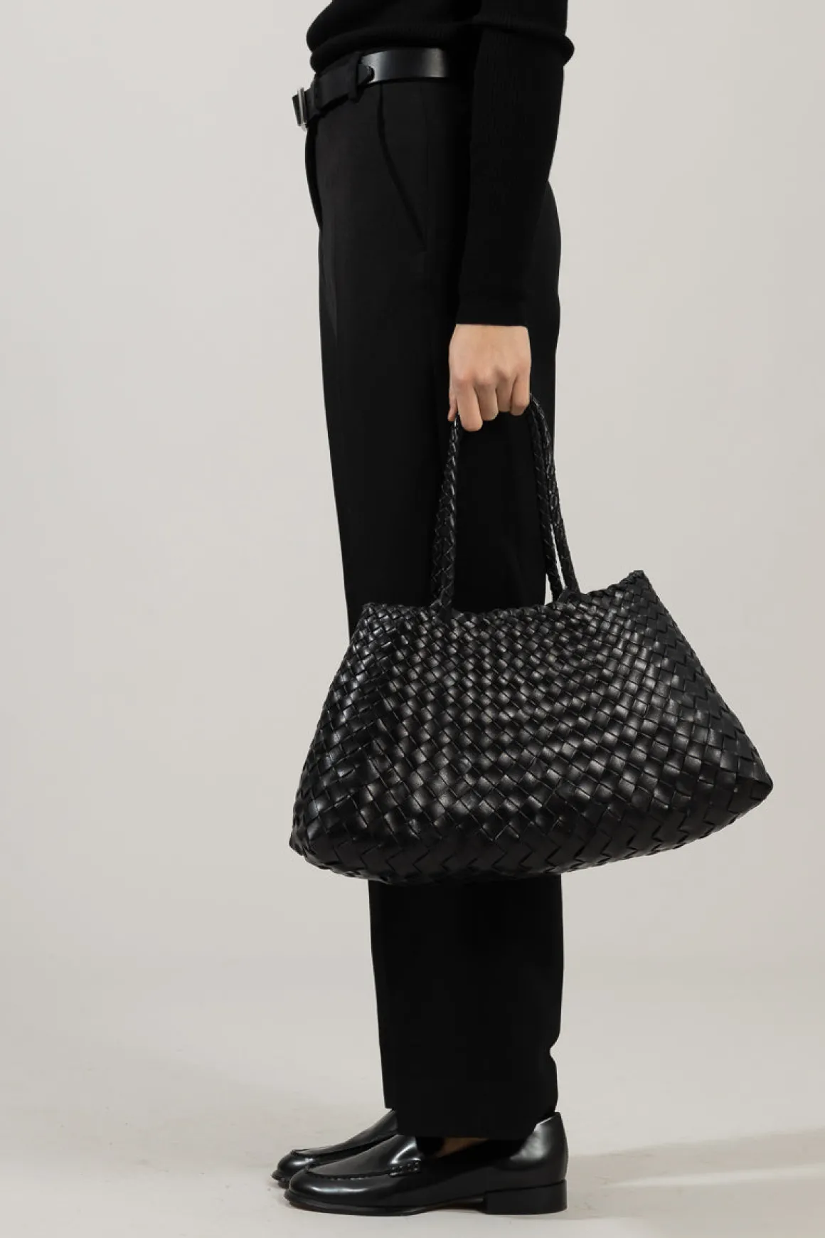 Santa Croce-vesken fra Dragon Diffusion er håndvevd av høykvalitetsskinn med uregelmessige stropper som smalner mot toppen, og skaper en praktisk veske som er perfekt for både hverdag og kveld. Vesken er laget med tradisjonelle kurvvevingsteknikker, har en åpen topp og er uforet, noe som gir et avslappet og tidløst uttrykk. Inne i hver veske er en påsydd antikk St. Christopher-medalje – et symbol på beskyttelse for den reisende og et unikt stempel for Dragon Diffusion.