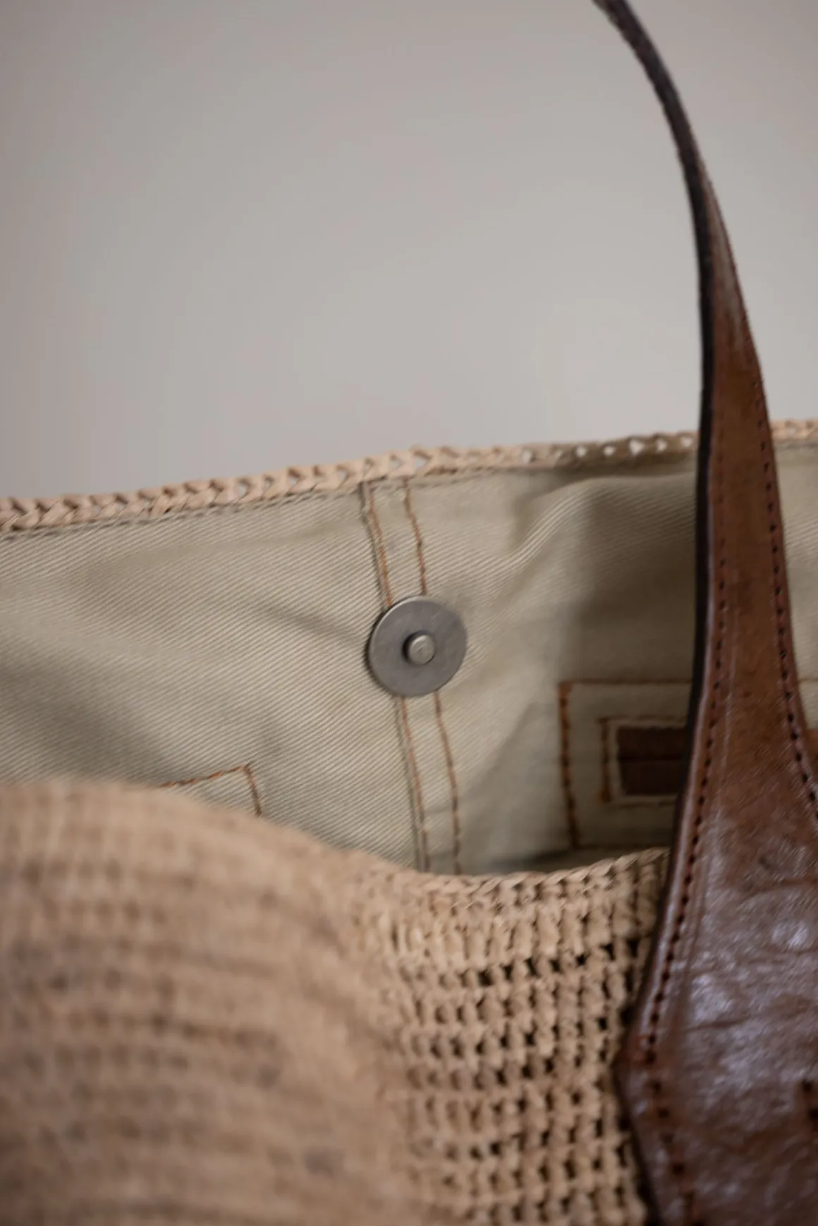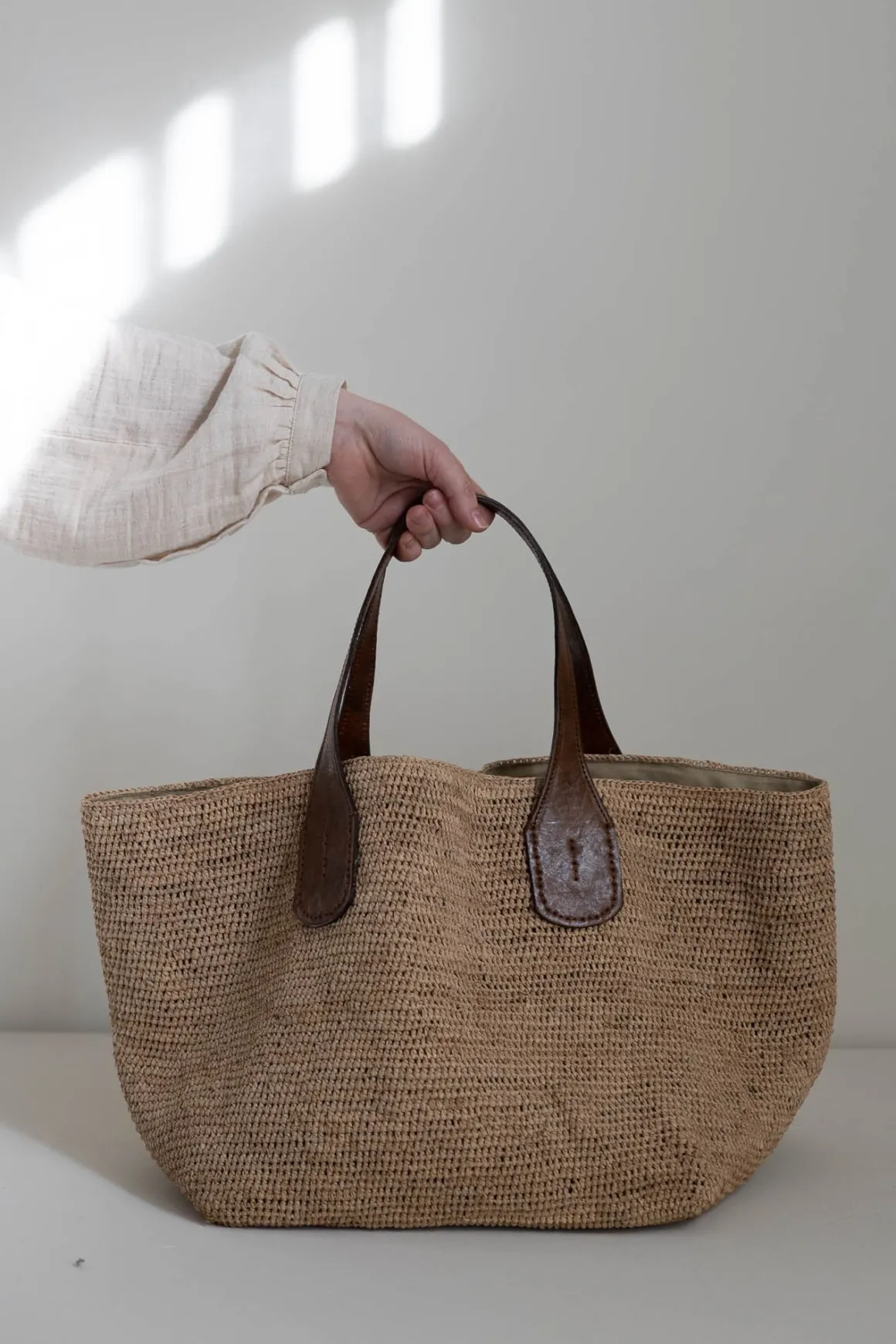 Tokyo II-vesken fra Ibeliv er en mellomstor håndlaget tote i naturraffia, designet for å være like praktisk som den er tidløs. Med sin romslige fasong og fire innvendige lommer får du både oversikt og plass til alt du trenger i løpet av dagen. Vesken er heklet for hånd på Madagaskar og fôret med økologisk bomull, mens de myke håndtakene i vegetabilsk garvet sebulær gir en behagelig bærefølelse. Den lukkes med en magnetknapp og kan bæres både i hånden og over skulderen. Tokyo II har et rent uttrykk som passer til både byliv og strand, og blir lett en fast følgesvenn til hverdagsantrekket. Hver veske er unik og bærer spor av ekte håndverk og naturlige materialer som holder lenge og blir finere med bruk.