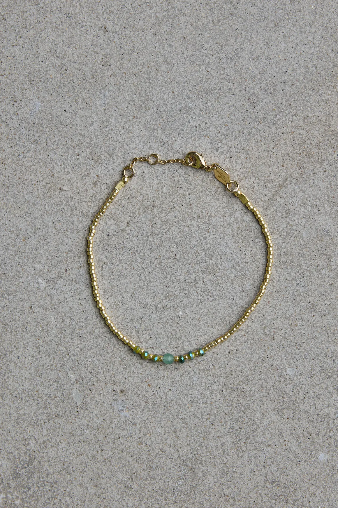 Bead u0026amp; Gem Sea Green-armbåndet fra Anni Lu’s nyeste kolleksjon, Riviera Dreams, er inspirert av rivieraens gullalder på 70-tallet, en tid da filmstjerner, forfattere og kongelige samlet seg i de solfylte kystbyene. Kolleksjonen gjenskaper essensen av denne perioden med elementer som rav, tie-dye-farger, marmorgrønt, små edelstener og rikelig med gull. Alle smykkene er designet for å kunne kombineres perfekt med hverandre.