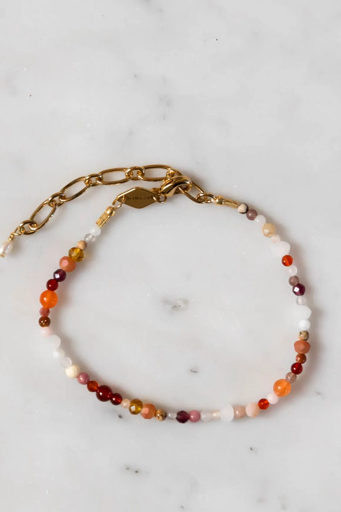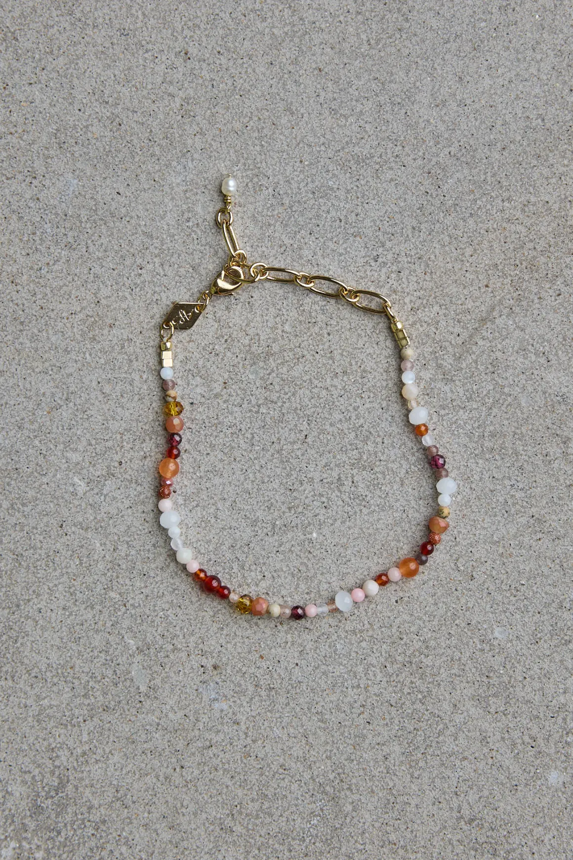 Flamingo Gold-armbåndet fra Anni Lu’s Sunseeker-kolleksjon er en del av en serie delikate smykker inspirert av soloppgangens farger og materialer. Kolleksjonen hyller de reisende som søker åndelige øyeblikk ved dagens første lys, og fanger essensen av nomader og eventyrere tiltrukket av soloppgangens unike atmosfære. Armbåndet er laget av små, fargerike glassperler i vakre naturtoner. Det er perfekt alene eller kombinert med andre armbånd fra Anni Lu.