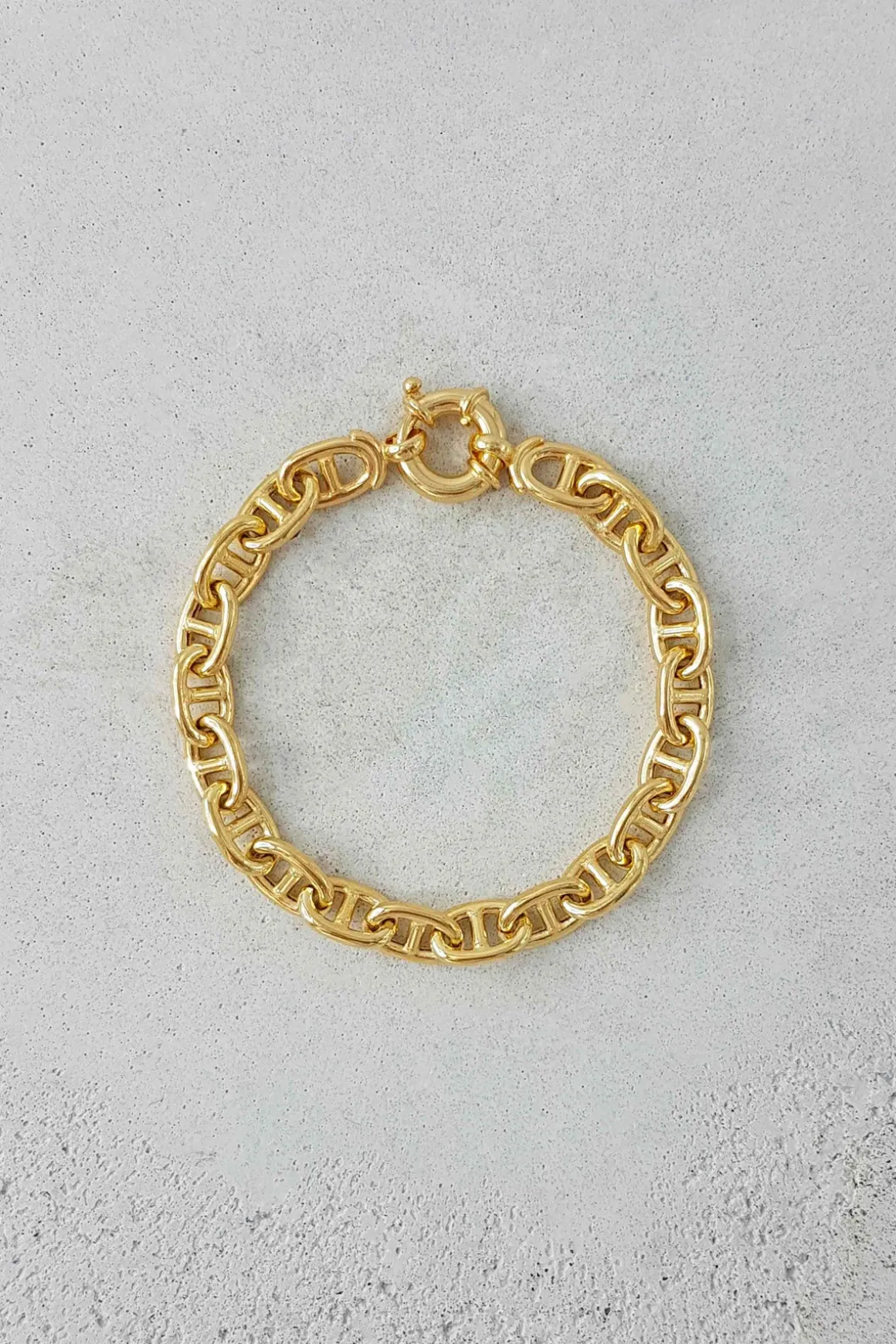 Nautical-armbånd i 18k gullbelagt sterlingsølv fra Romanin. Armbåndet er et iøyenfallende statement rundt håndleddet. Bruk det alene eller i kombinasjon med flere smykker fra samme merke. Formen på armbåndet er inspirert av lenken på et båt anker, og tar oss med til solfylte dager langs kysten.