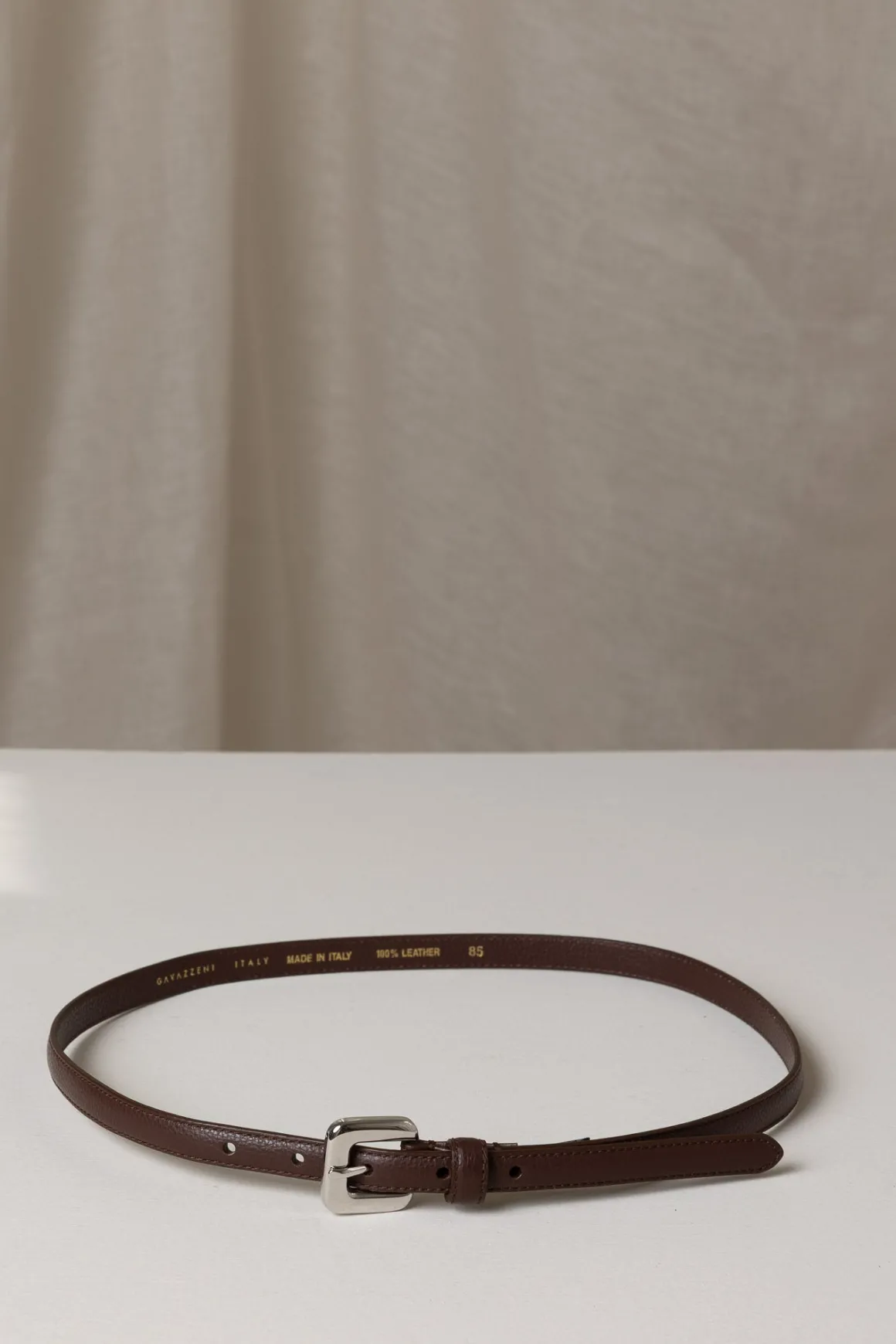 Smalt skinnbelte med sølvfarget spenne fra italienske Sergio Gavazzeni. Sergio Gavazzeni er kjent for sin høye kvalitet, og håndverket deres skiller seg ut ved å gi klassiske design en ny vri – noe som tydelig kommer frem i dette beltet. Gloriosa er allsidig og kan brukes både til jeans eller for å fremheve midjen over en kjole eller jakke. Dette er en investering som varer år etter år!