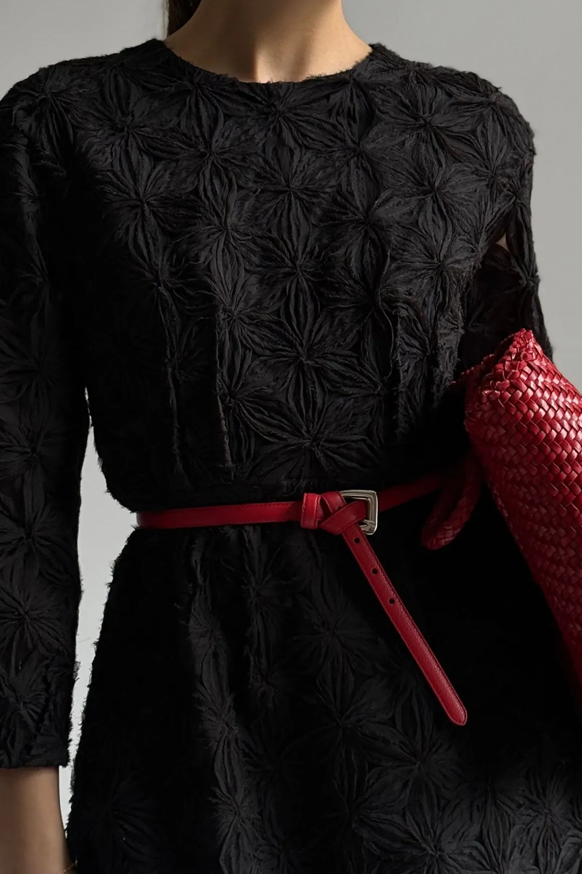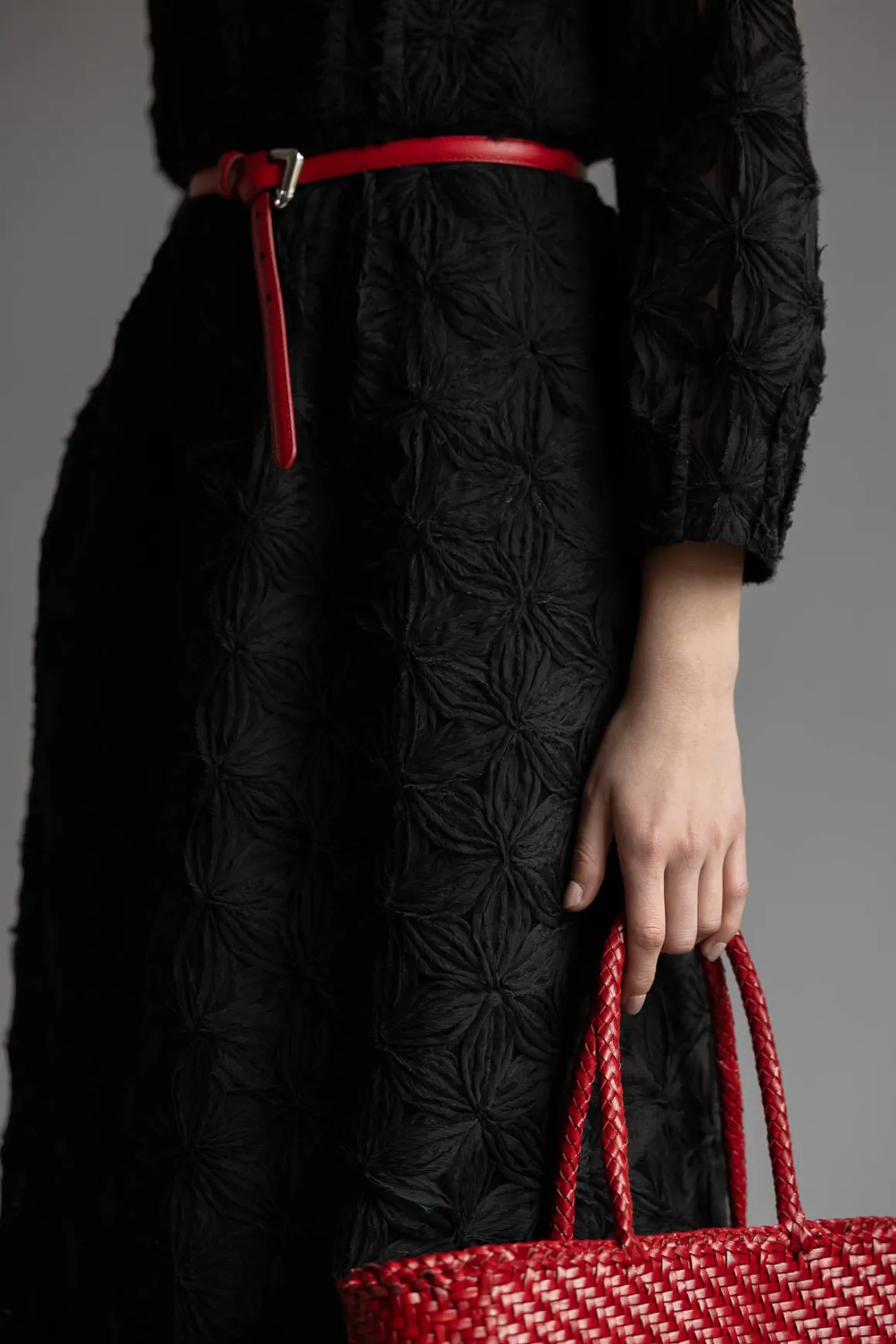 Smalt skinnbelte med sølvfarget spenne fra italienske Sergio Gavazzeni i en nydelig rubinrød farge. Sergio Gavazzeni er kjent for sin høye kvalitet, og håndverket deres skiller seg ut ved å gi klassiske design en ny vri – noe som tydelig kommer frem i dette beltet. Gloriosa er allsidig og kan brukes både til jeans eller for å fremheve midjen over en kjole eller jakke. Dette er en investering som varer år etter år!