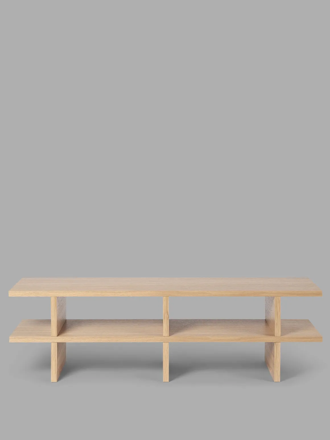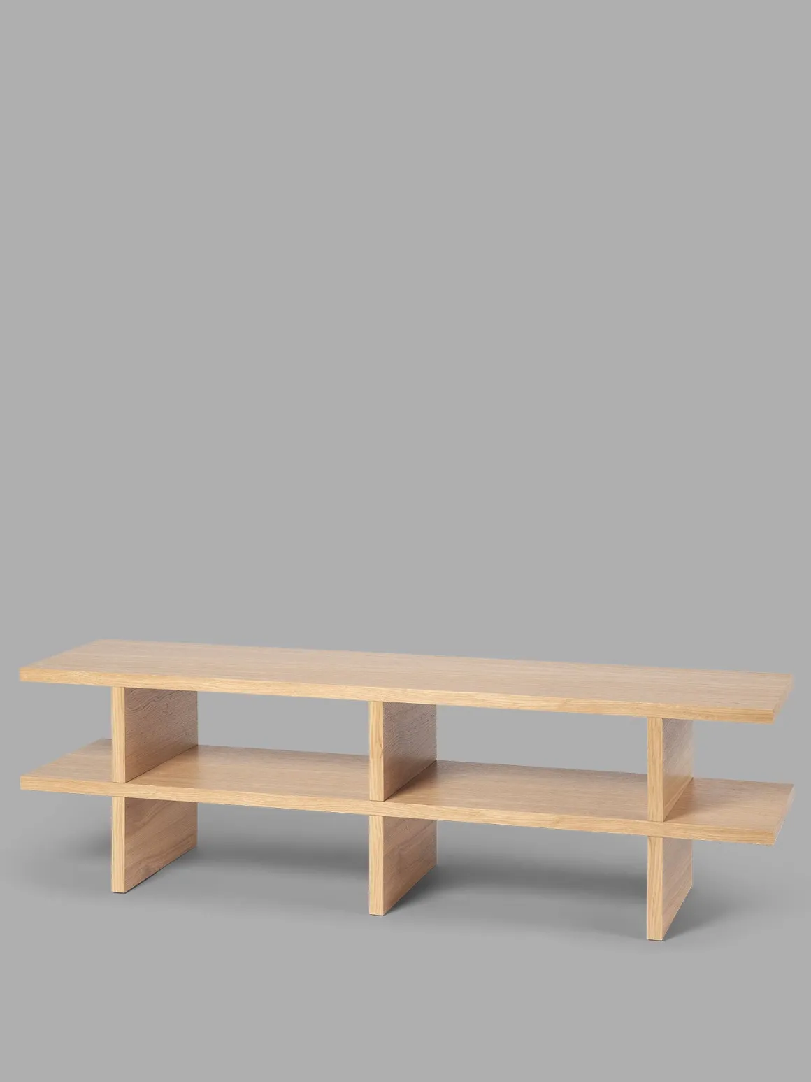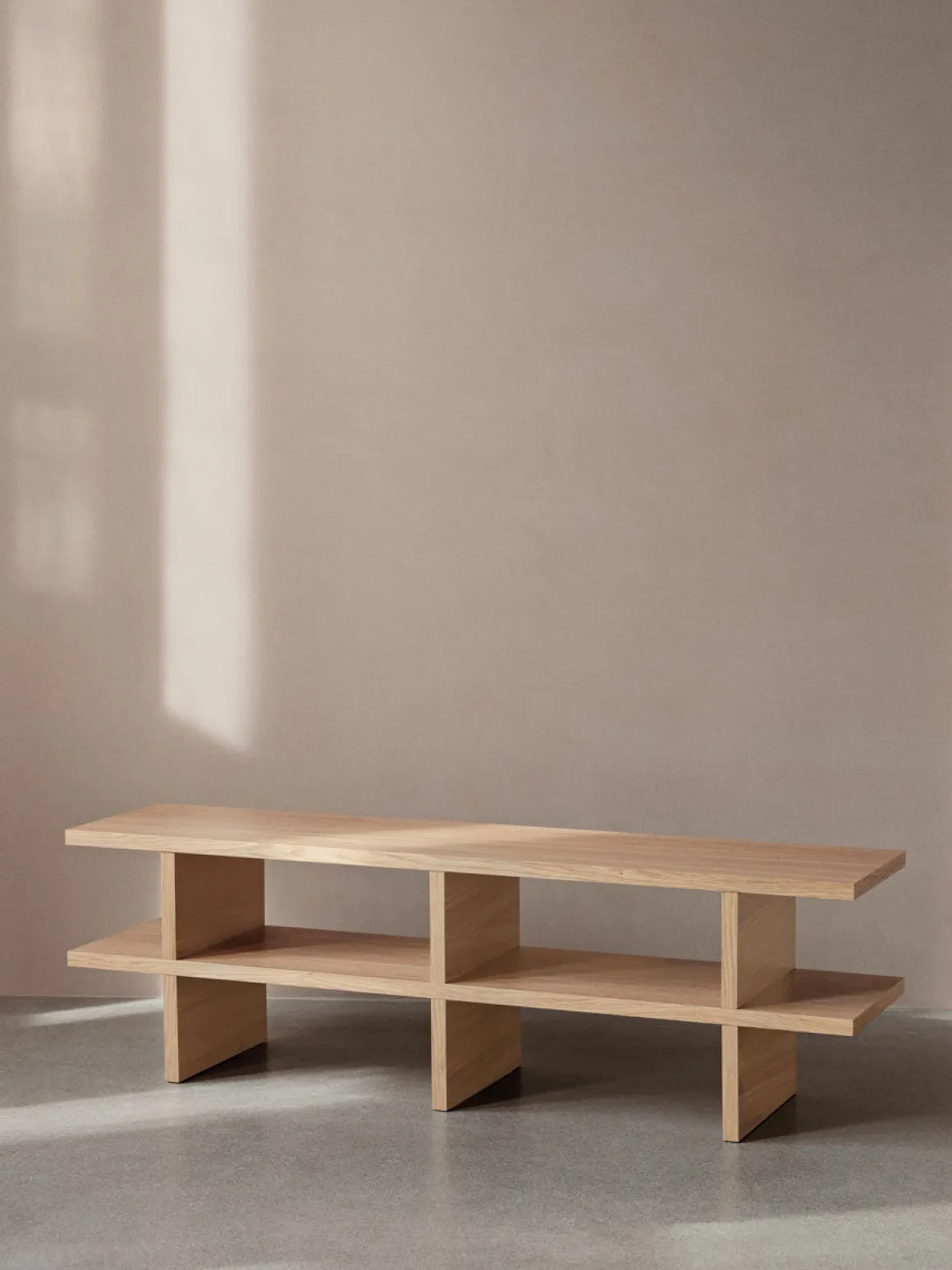 Kona-benken er en del av den utvidede Kona-familien fra Ferm Living. Kona er inspirert av Japandi-stilen som blander japansk minimalisme med skandinavisk funksjonalitet. Japandi kjennetegnes av rene linjer, naturlige materialer og en rolig, harmonisk fargepalett. Benken er FSC™-sertifisert og laget av eikefiner med MDF-kjerne. Den er både praktisk og allsidig, med åpen oppbevaring under sitteflaten som passer perfekt til bøker i stuen, sko i gangen, eller som en hyggelig oppbevaringsløsning ved fotenden av sengen.