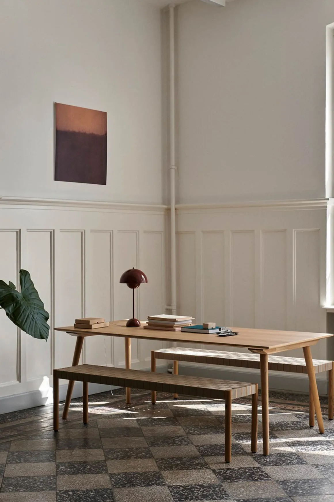 TK5-benken fra u0026amp;Tradition er oppkalt etter Betty Nansen-teatret i København og er designet av Jakob Thau og Sami Kallio. Benken er laget av lakkert heltre med sete av håndvevde, brede linbånd av naturlige linfibre. Eikerammen i massivt tre er tilgjengelig i tre finisher: Svartlakkert ask, rødbrunlakkert ask og lakkert, massiv eik med naturlig, flettet lin, samt en versjon i svartlakkert ask med svartfarget lin. Benken er også tilgjengelig i to lengder: 105cm og 157cm. Betty er en nett og taktil benk i naturlige, varige materialer som kan brukes både hjemme og på hytta. Bruk den i gangen, på kjøkkenet, soverommet eller på barnerommet.