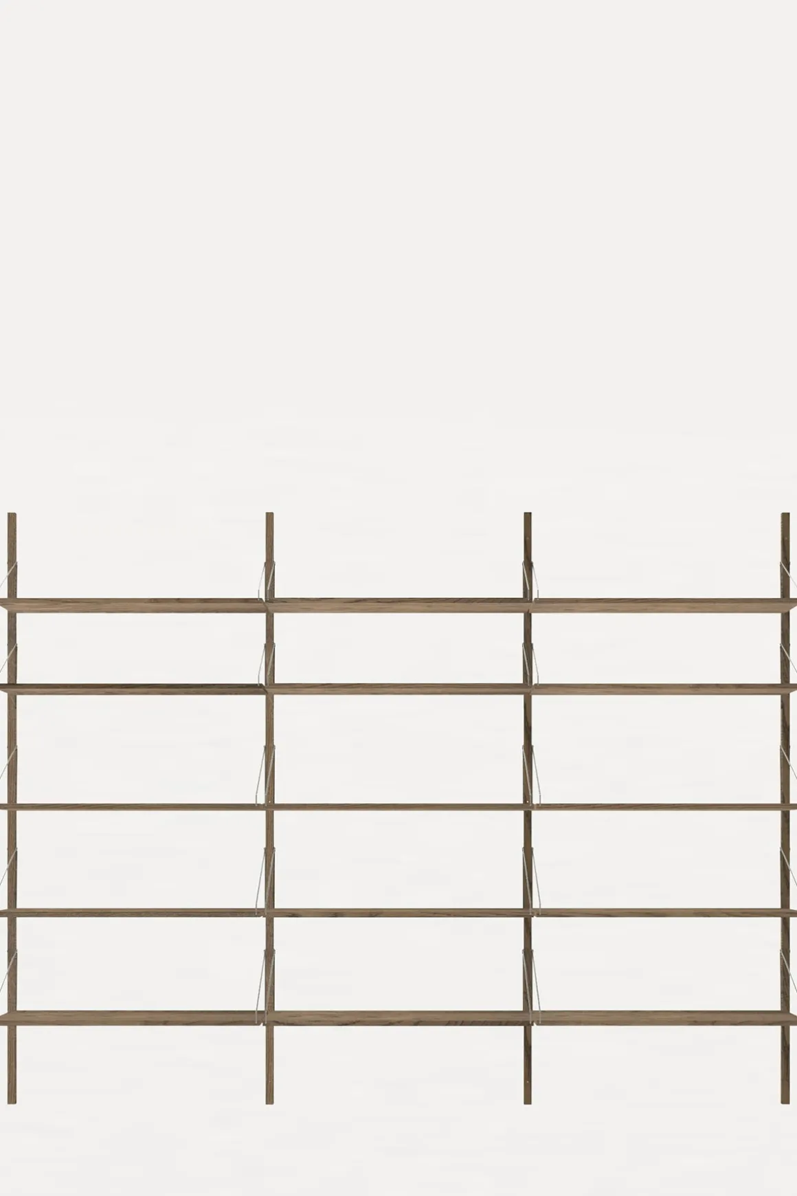 Velkjente Library Shelf komplett hyllesystem fra Frama i vakker, mørkoljet, heltre eik. Karakterisert av et modulært system og festet med solide stålskruer-og braketter på solide skinner i eik, kan hyllene enkelt plasseres og styles om på en rekke måter. Dette allsidige hyllesystemet egner seg til ethvert rom med sitt minimalistiske og stramme design, og kombinasjonen av rustfritt stål og lun, mørkoljet eik passer perfekt inn i de skandinaviske hjem. Library Shelf er enkel å montere, og hver enkelt hylle kan holde ca. 15 kg (avhengig av veggmateriale og montering). Systemet er svært fleksibelt, og hver hylle kan flyttes rundt og tilpasses med tilleggsprodukter fra samme serie.