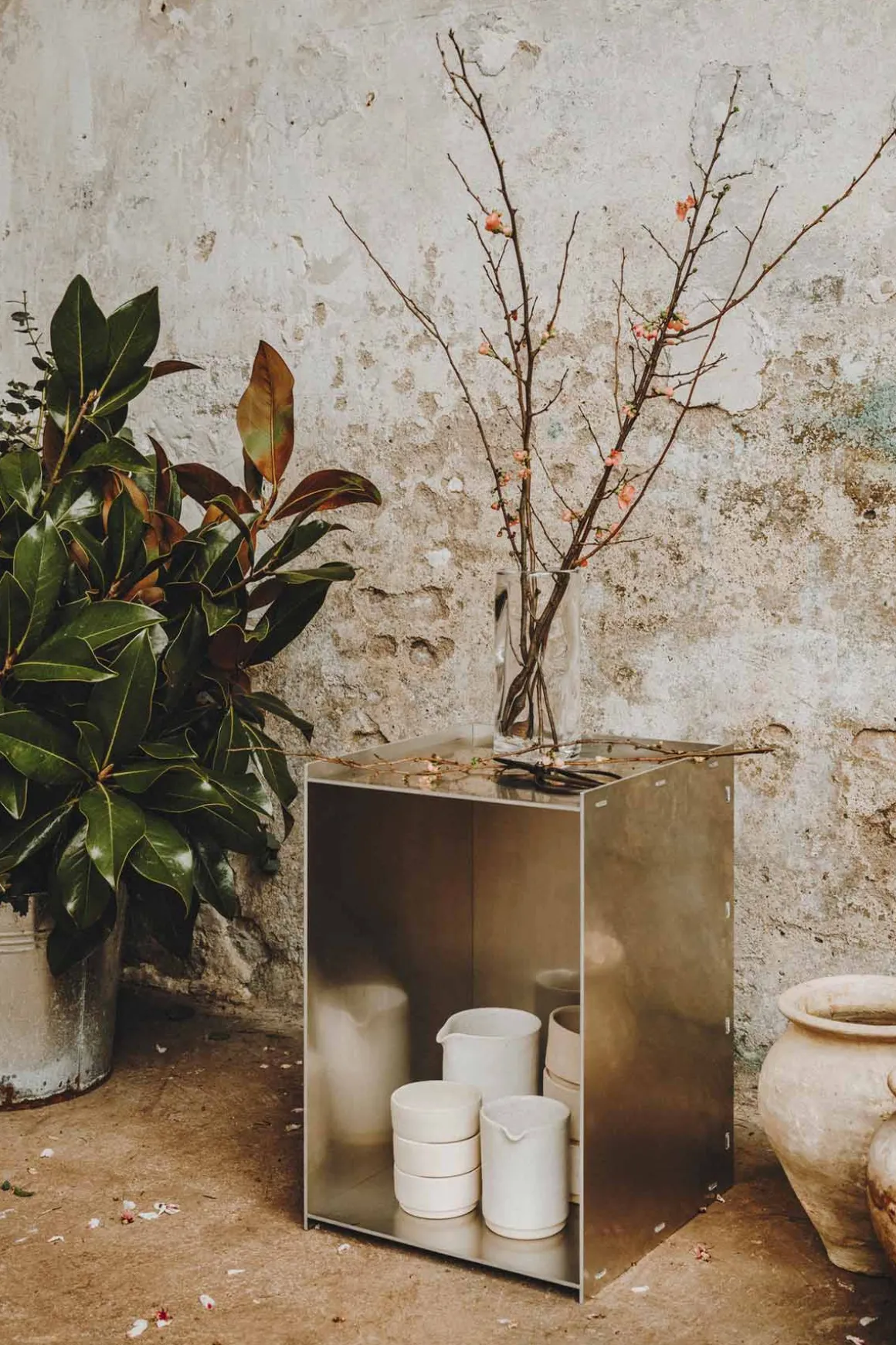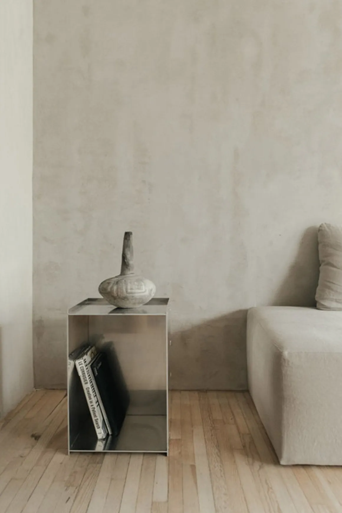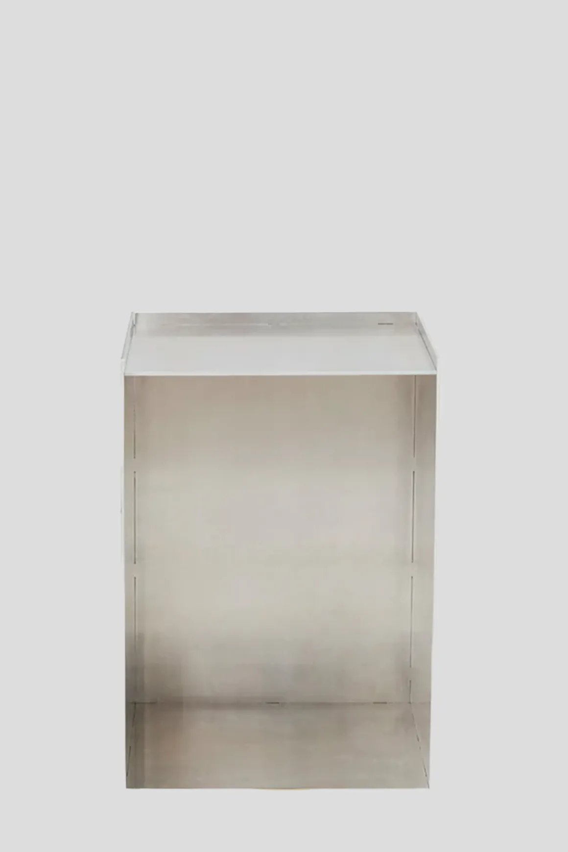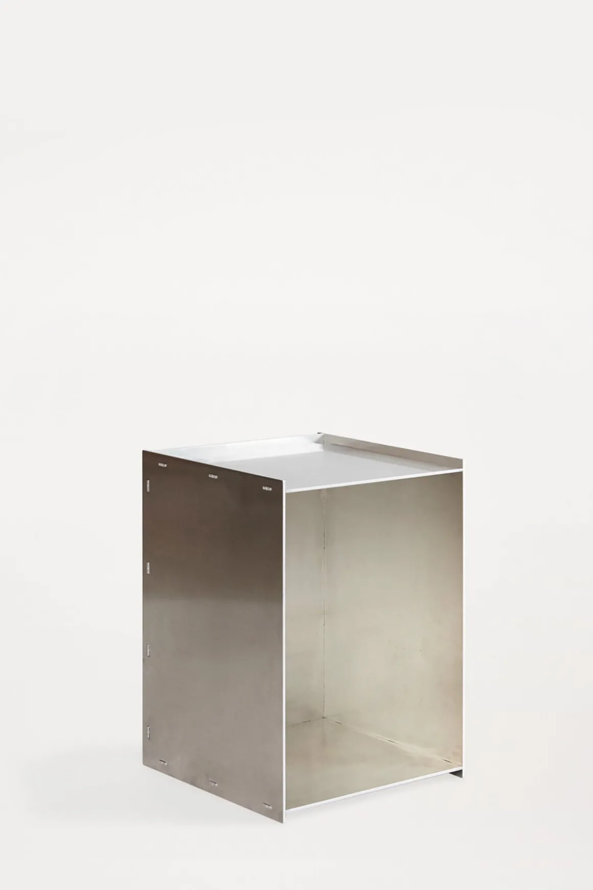 Rivet oppbevaringsboks/sidebord i ubehandlet aluminium fra Frama. Boksen er en del av Rivet-serien, basert på tradisjonelle håndverksteknikker. Produktene er laget av laserkuttede råaluminiumsplater som deretter blir sammenføyd for hånd ved hjelp av en hammer. Boksen er enkel og allsidig og kan brukes som sidebord, nattbord eller til oppbevaring og ustilling av dine favorittbøker for eksempel. Boksen kan brukes både stående og liggende og har et rått og industrielt uttrykk som får en vakker patina etter bruk.