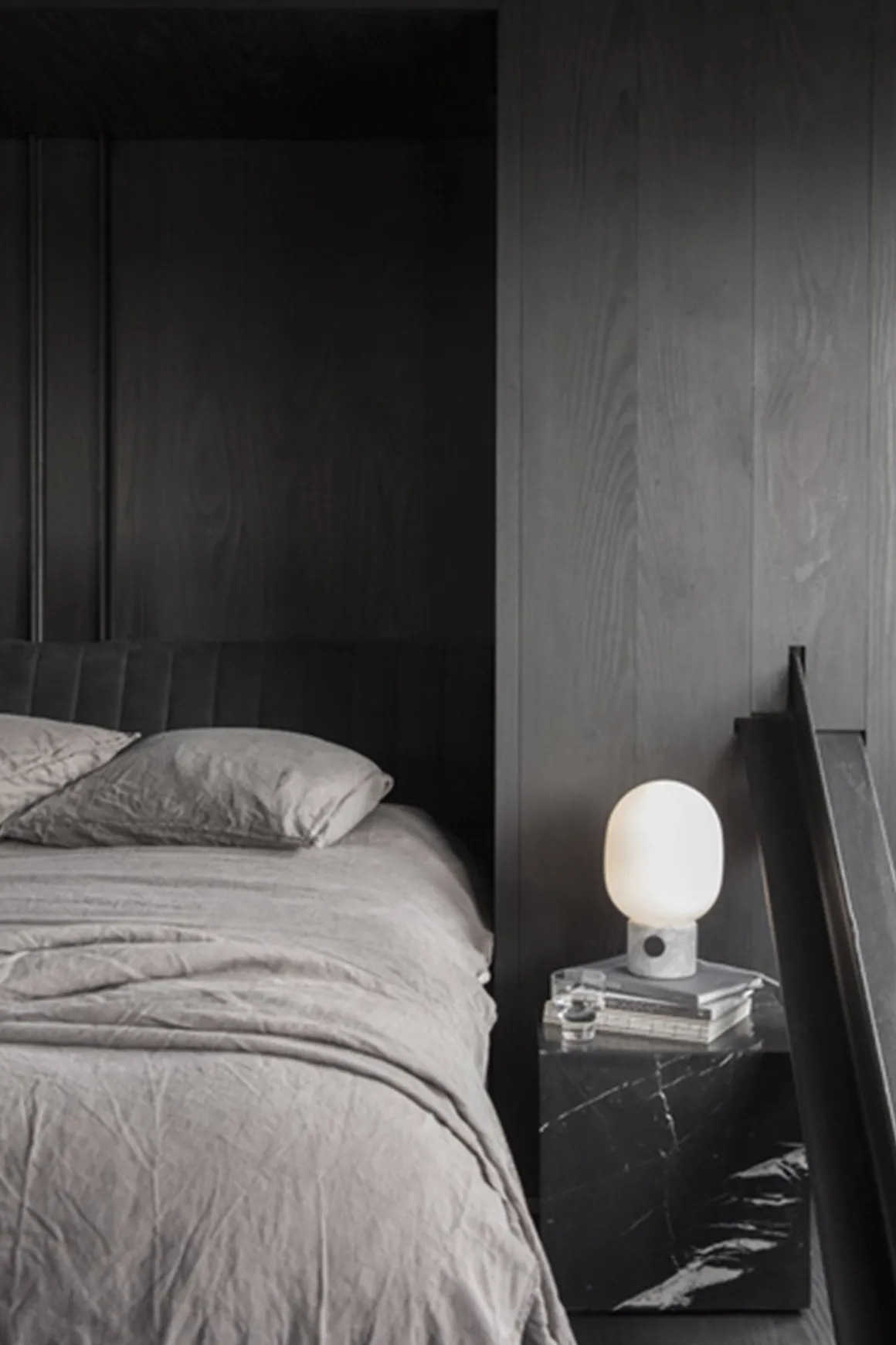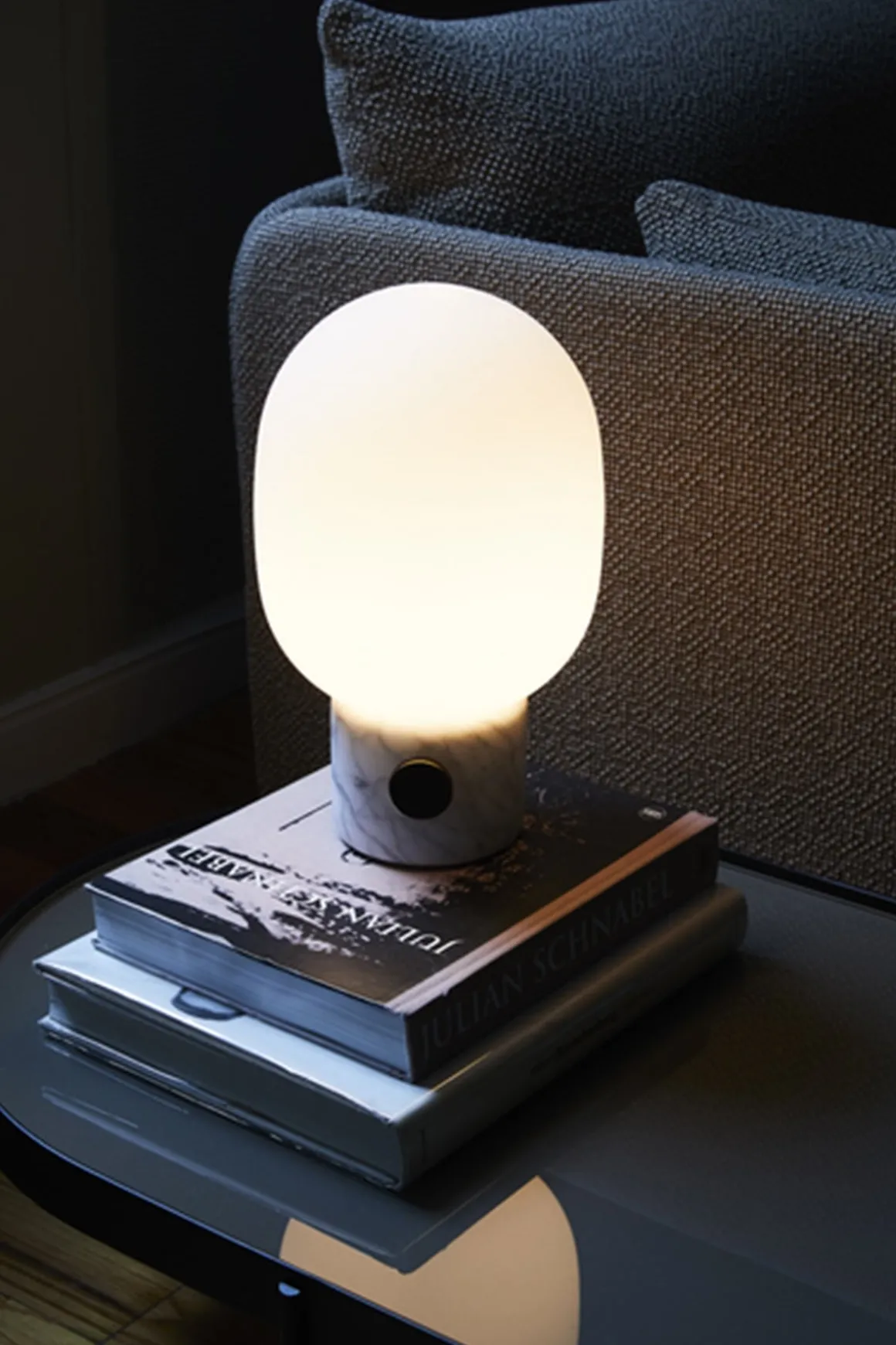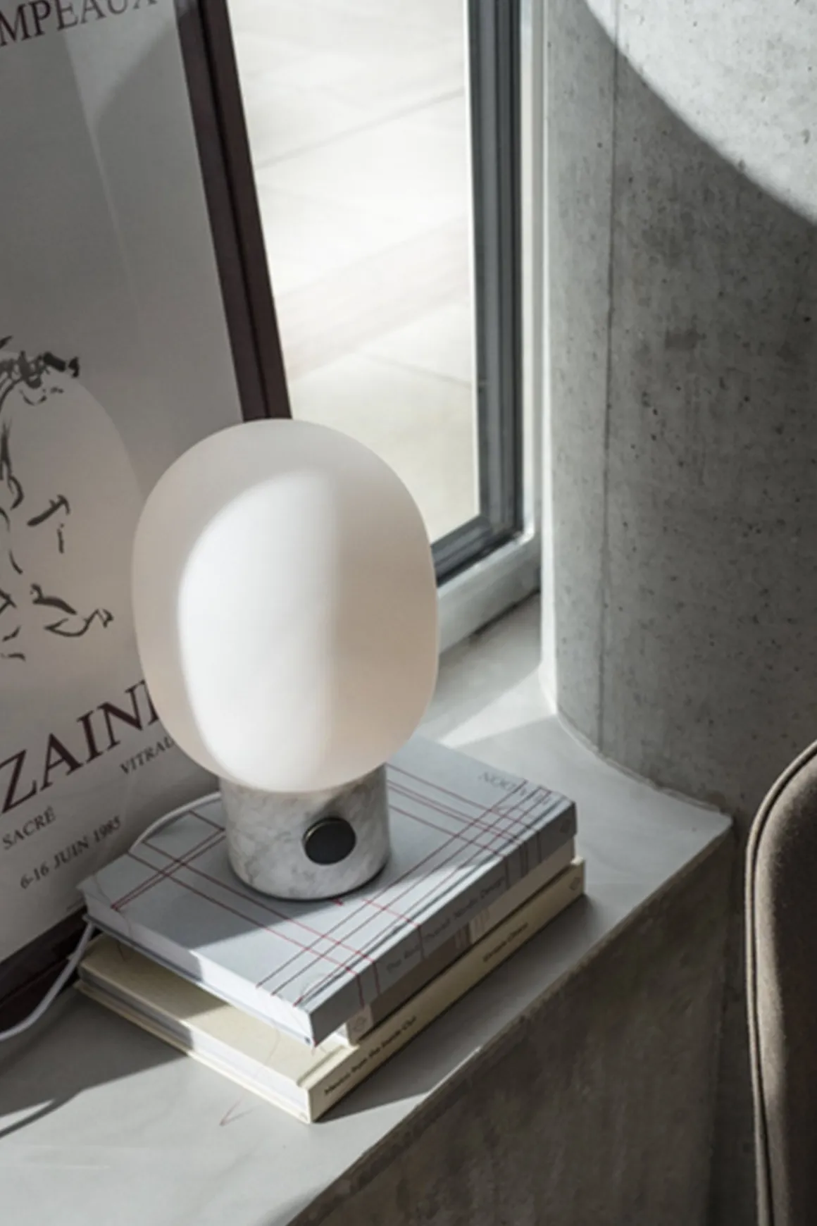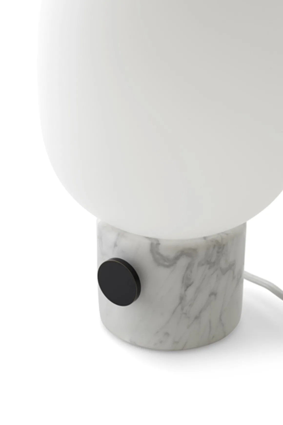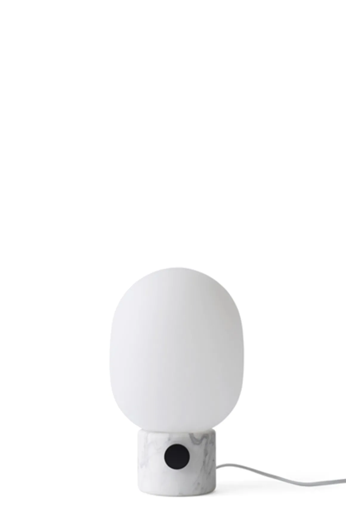 Stilfull og minimalistisk bordlampe designet av Jonas Wagell, bestående av en glasskuppel i opalglass og base av hvit Carrara marmor. Lampen har en industriell bryter i sort metall med dimmer, mens den ovale kuppelen bidrar til et mykt lys som passer godt på både bord og skrivebord, på kommode, bokhylle og i vinduskarmen. Den har en 2 meter lang, hvit tekstilledning som følger med, lyspære må kjøpes utenom.