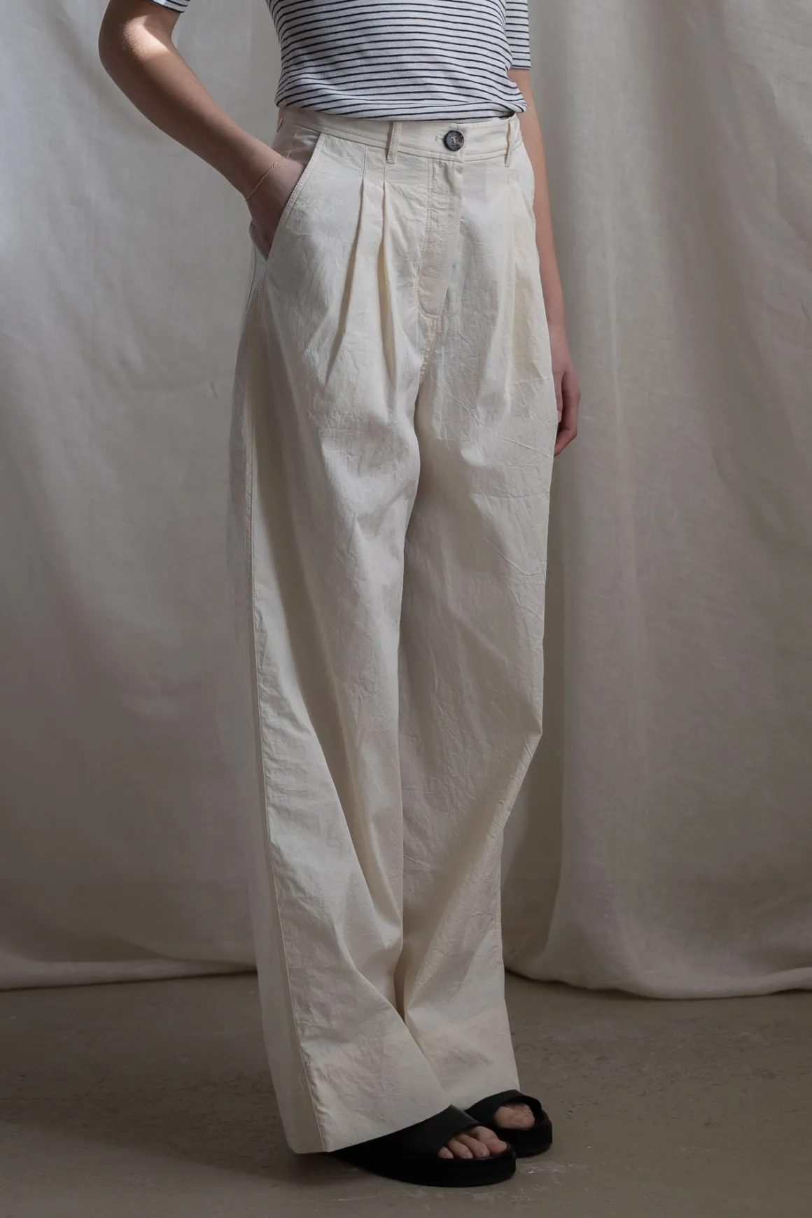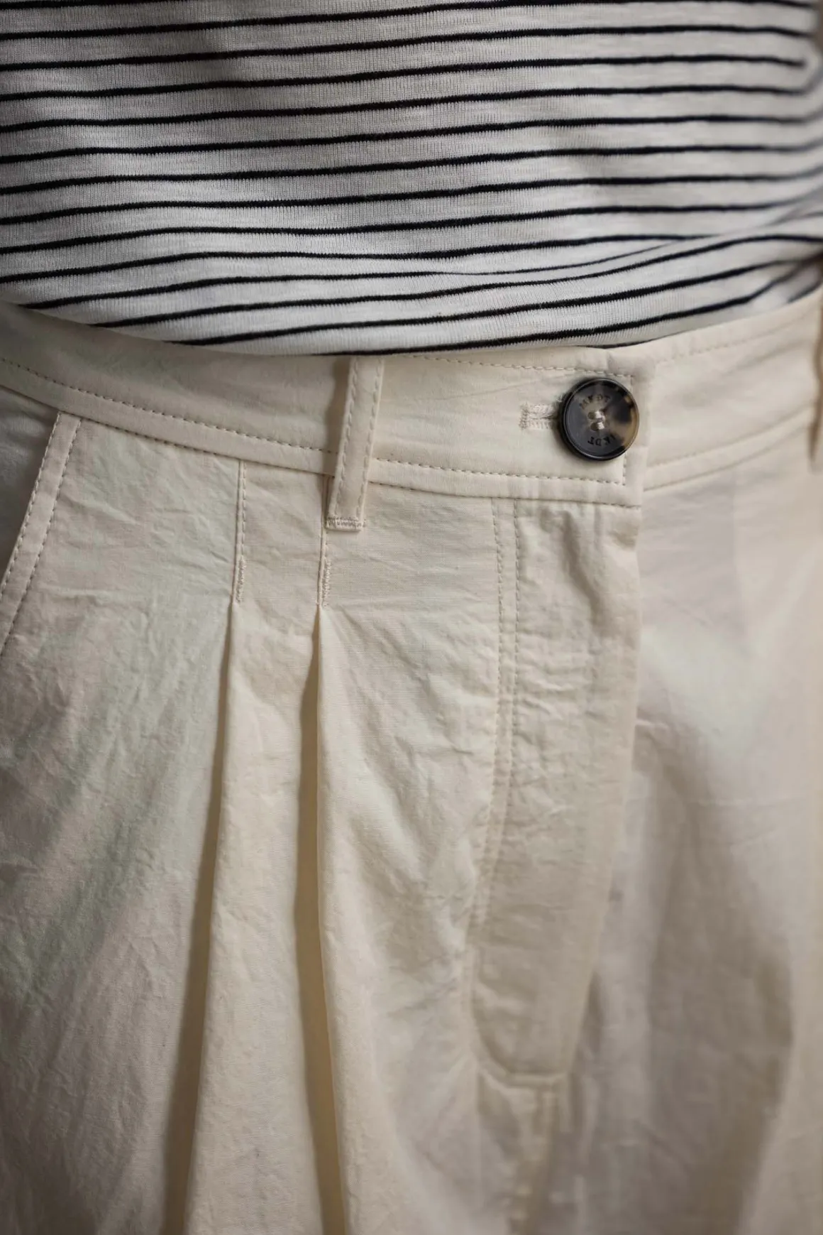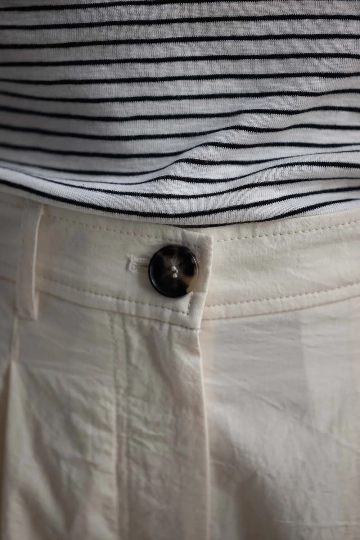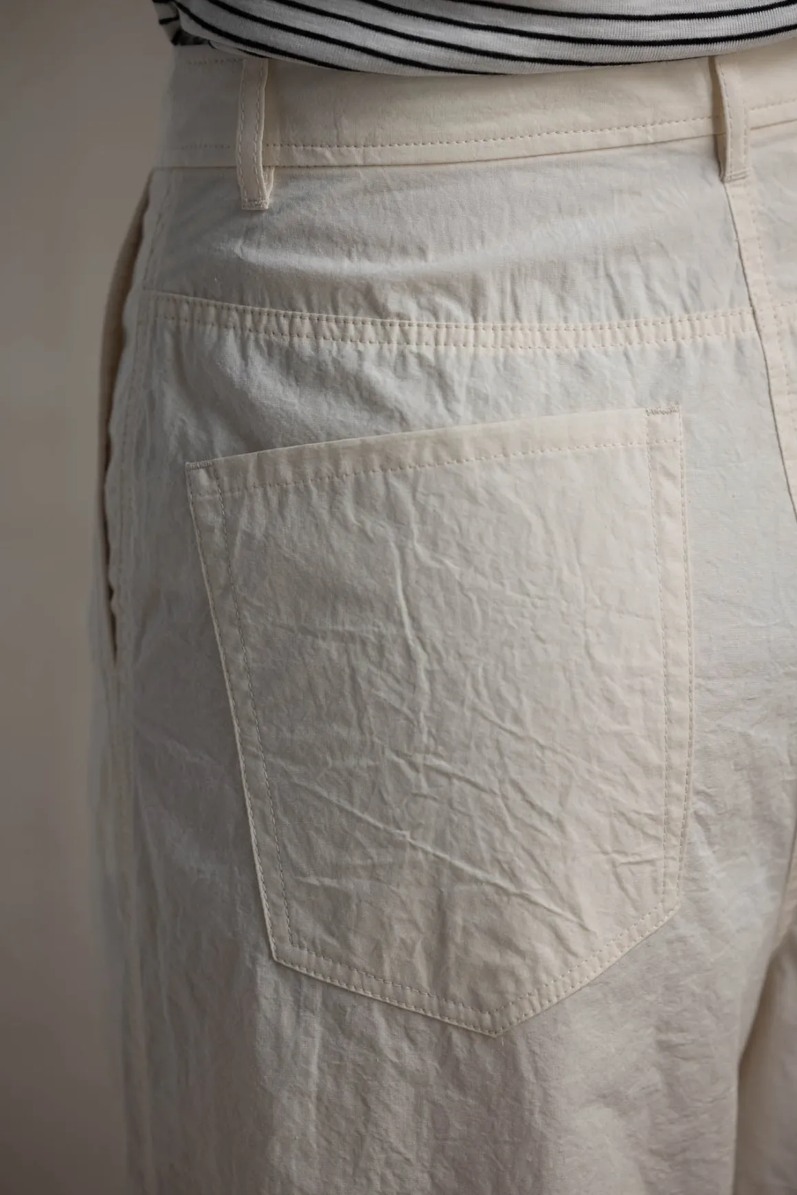 Prairie-buksen fra MKDT er en vid og lett bukse med nedsydde legg foran og en myk, strukturert overflate som gir et avslappet, men gjennomarbeidet uttrykk. Den har sidelommer, store påsydde baklommer og fast linning med beltehemper. Nederst er buksebeina sydd opp for å gi ekstra tyngde og bidra til et pent fall. En behagelig bukse med tydelig silhuett og rene detaljer.
