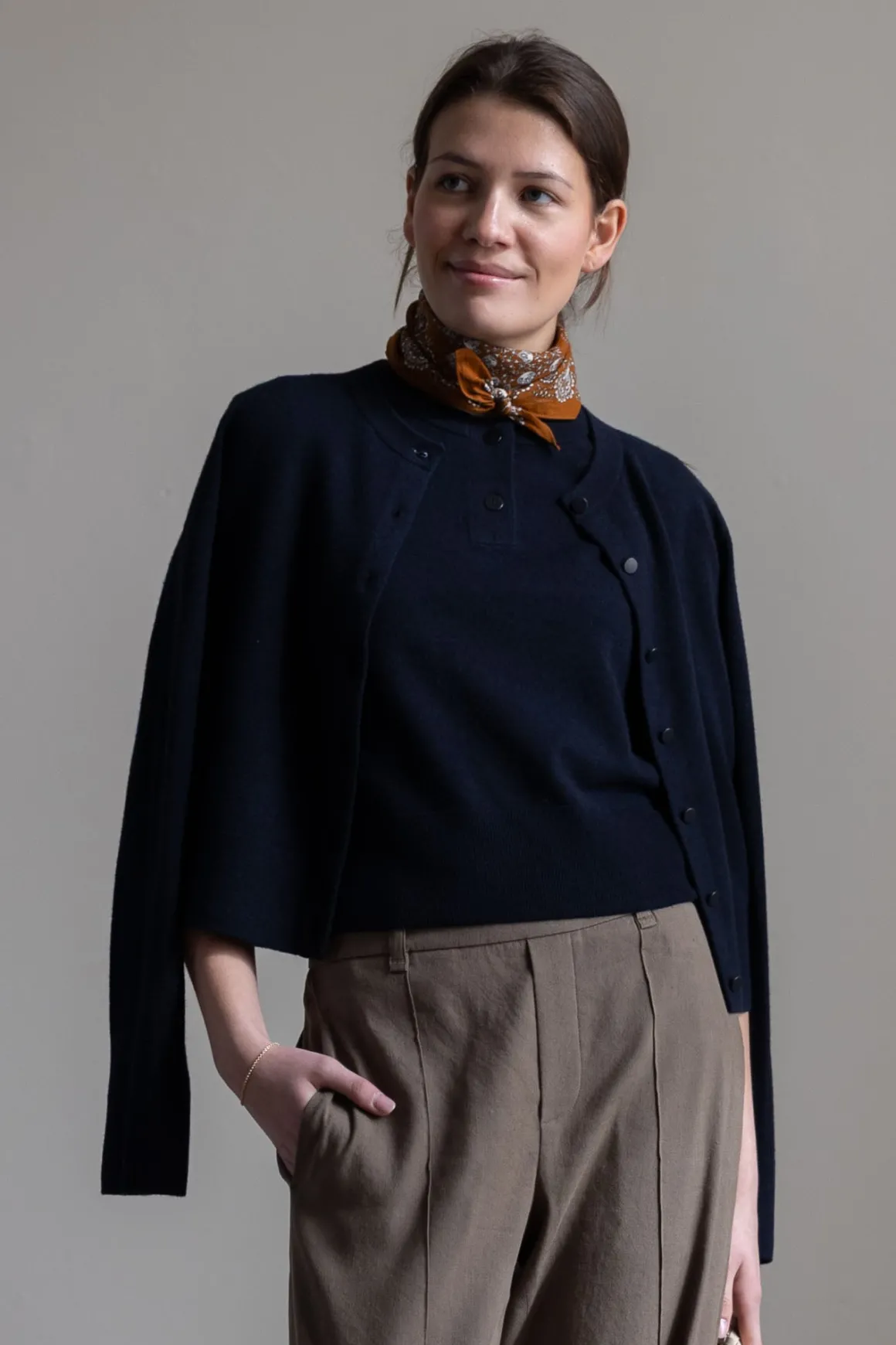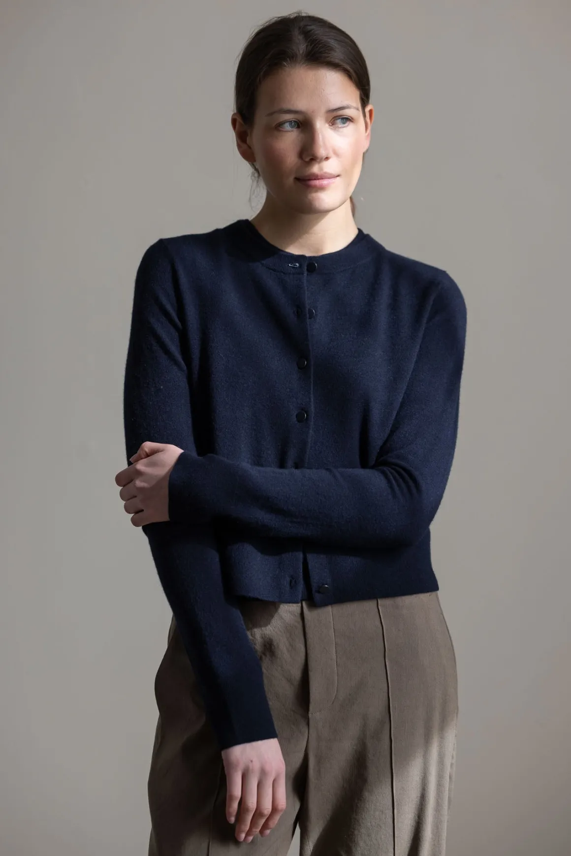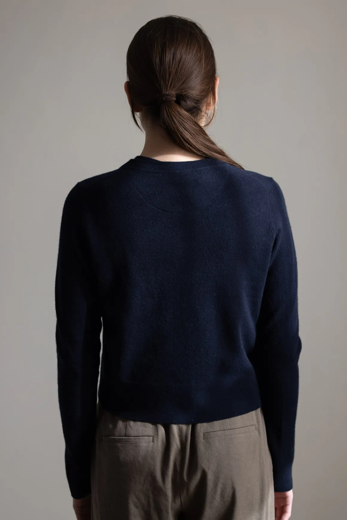 Cardigan fra Vince i en kompakt og myk ullblanding med kashmir. Den har en klassisk, rett passform med rund hals og dekorative shank-knapper foran. En liten kontrastdetalj i nakken – en halvmåneformet innfelling i hvitt – gir et diskret fargeinnslag og en uventet vri. Ribbestrikkede kanter rammer inn uttrykket, og materialet gir både komfort og struktur.