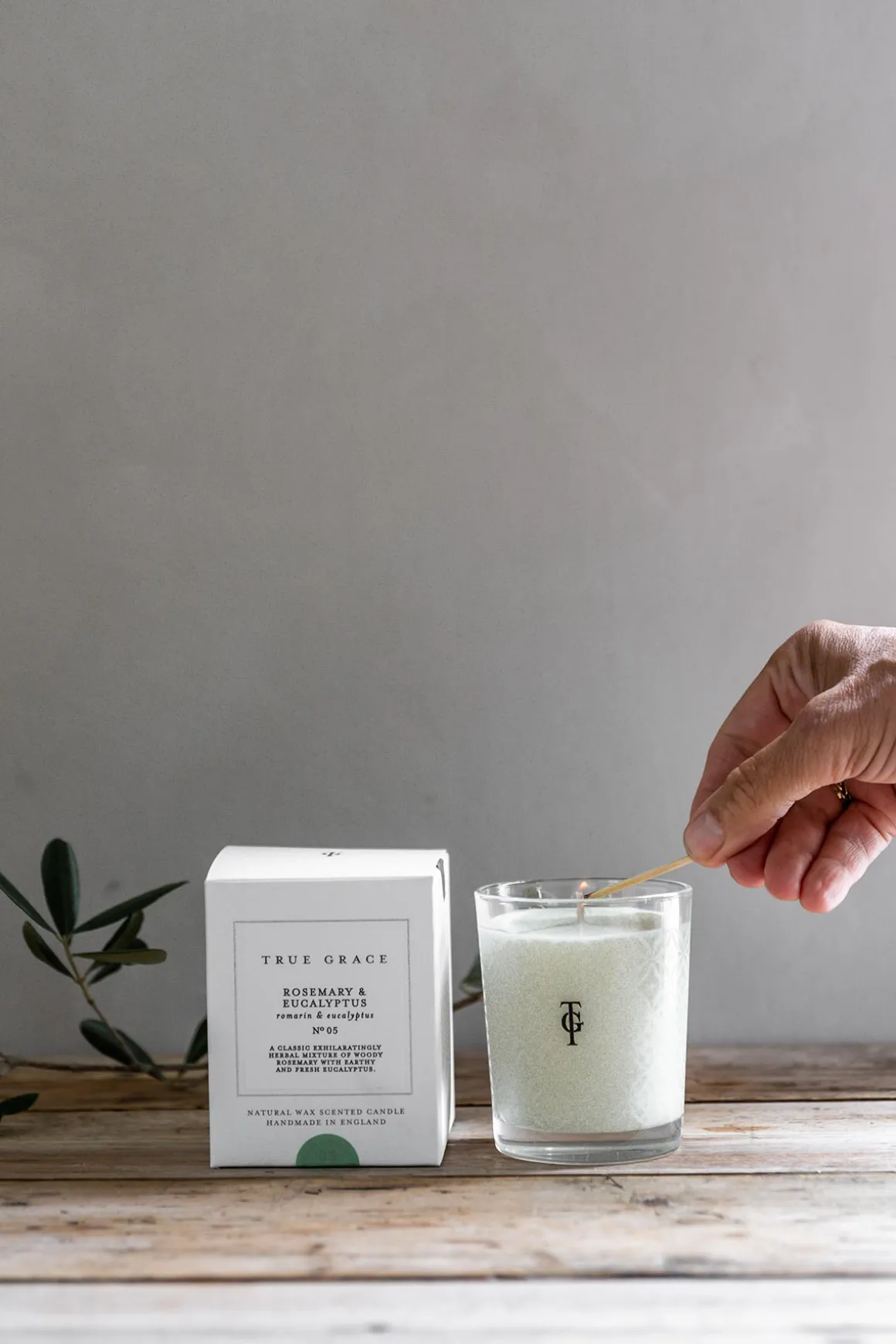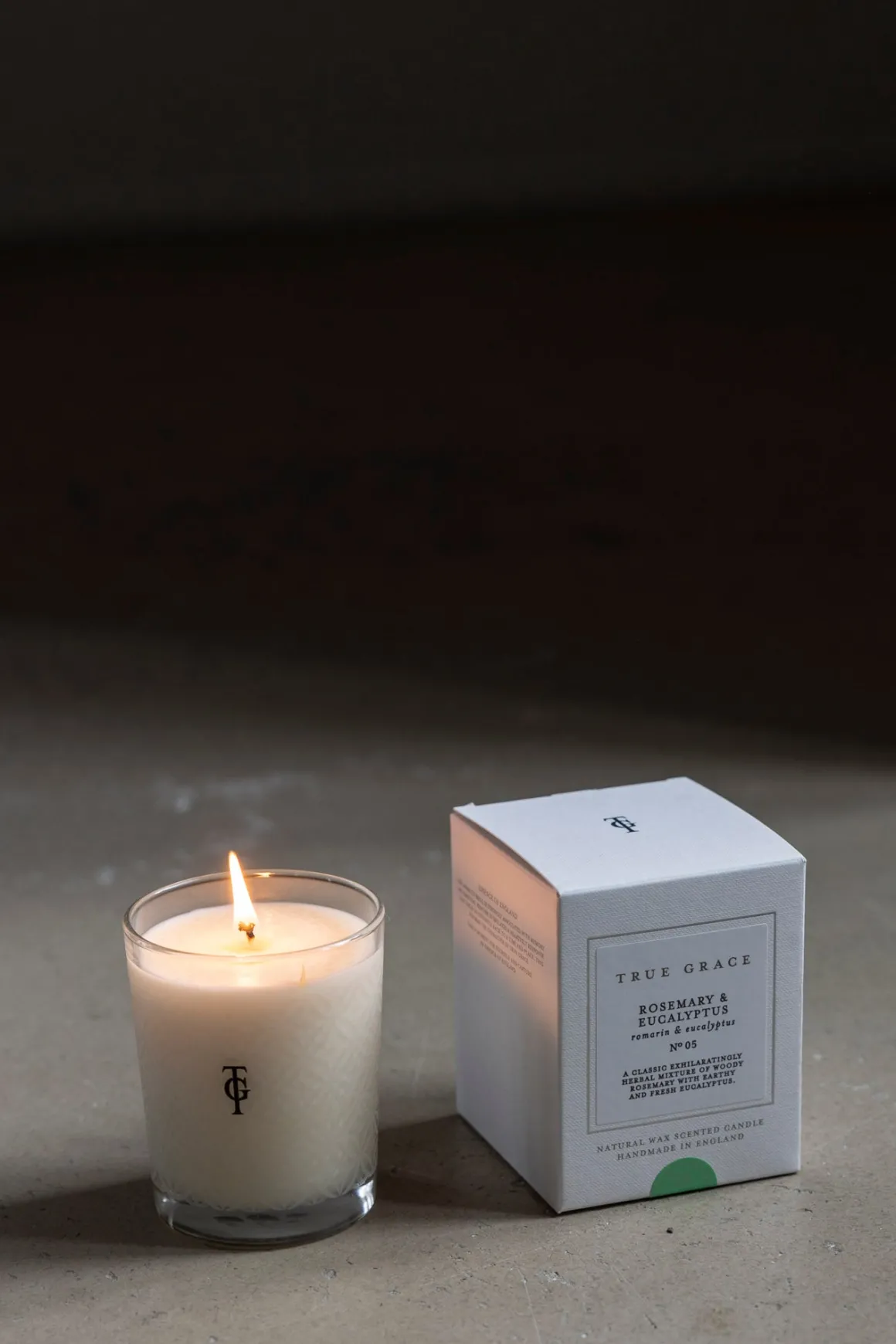 Klassisk, håndlaget duftlys fra engelske True Grace. Rosemary u0026amp; Eucalyptus er inspirert av livet på landet og er en del av deres «Village»-serie. Duftlyset er 100% naturlig og laget av en unik blanding av fornybar vegetabilsk voks og naturlig voks, med veke i ren bomull. Duftlyset kommer i en vakker glasskrukke med luksuriøs emballasje. Dette friske og urteduftende lyset har noter av røkelse, rosmarin og eukalyptus, og er vel det nærmeste man kommer en «Bolina-duft» da denne har vært fast inventar i mange år allerede, og nærmest sitter i veggene. Siden lysene kun er laget på naturlig voks, gir de ikke hodepine slik andre (rimeligere) varianter har en tendens til å gjøre. Lysene brenner i hele 40 timer. Vårt tips er å brenne lyset kun til duften har satt seg i rommet, slukk deretter flammen, så varer lyset enda lenger. Husk å trimme veken etter bruk slik at den ikke er lenger enn 0,5 cm, så unngår man sot inni glasset. True Grace har vært på Bolina i en årrekke og er en favoritt blant oss og våre kunder.