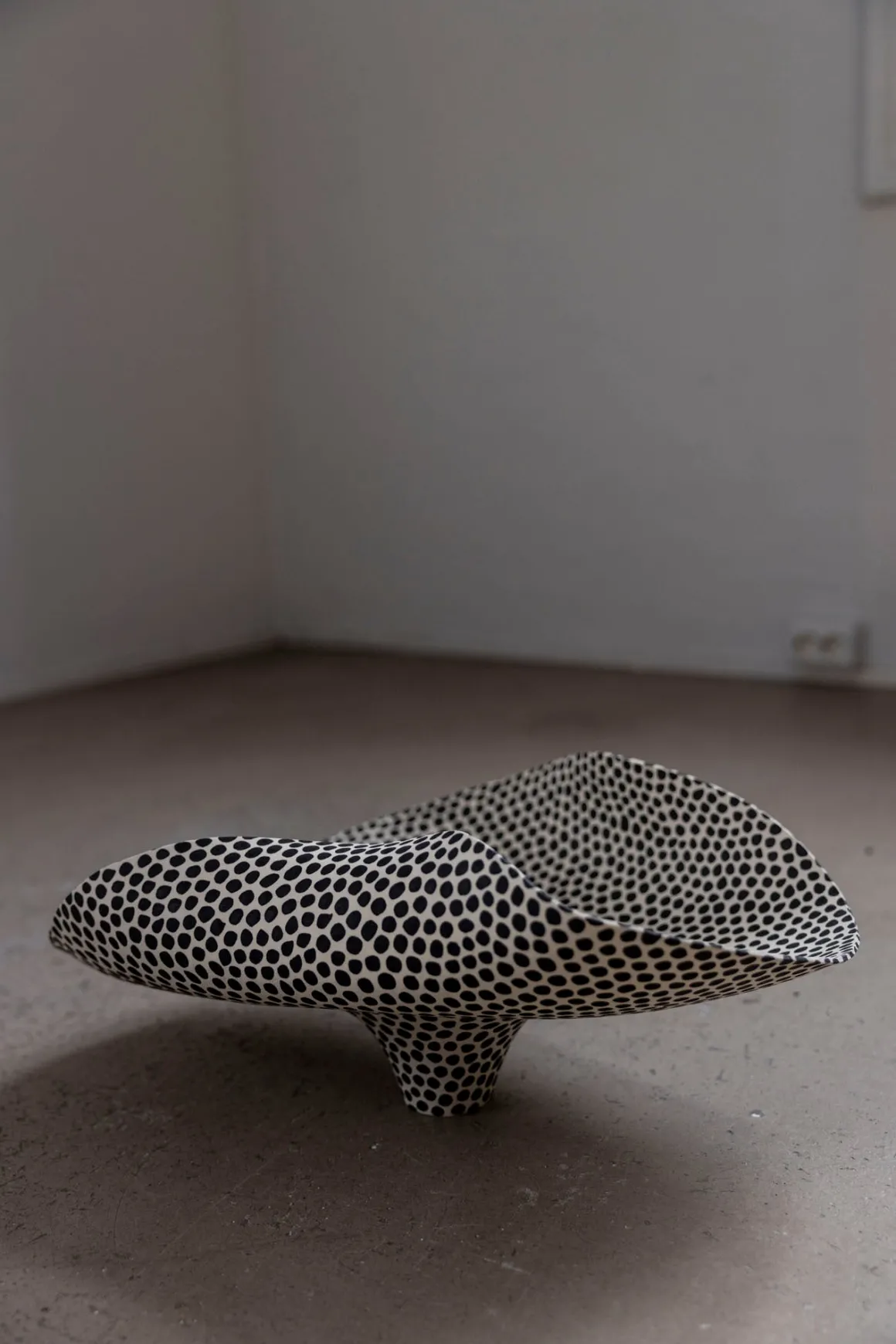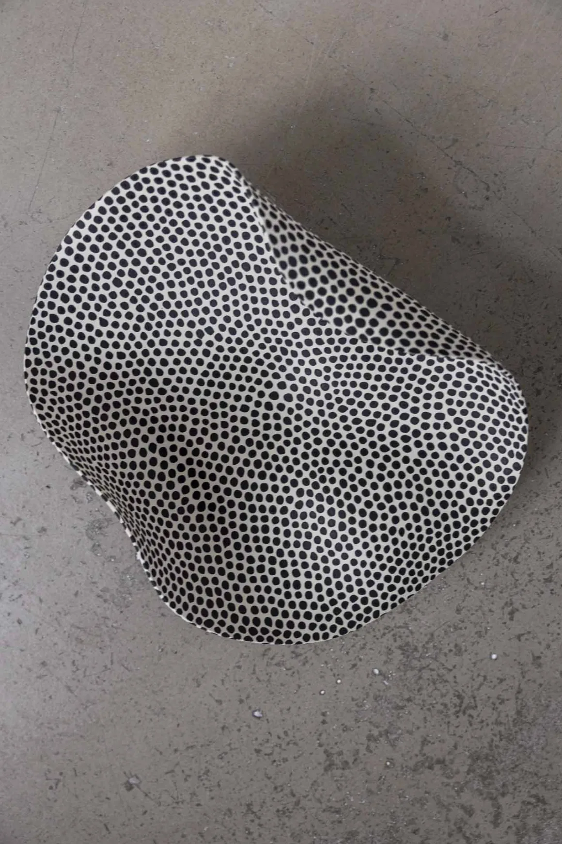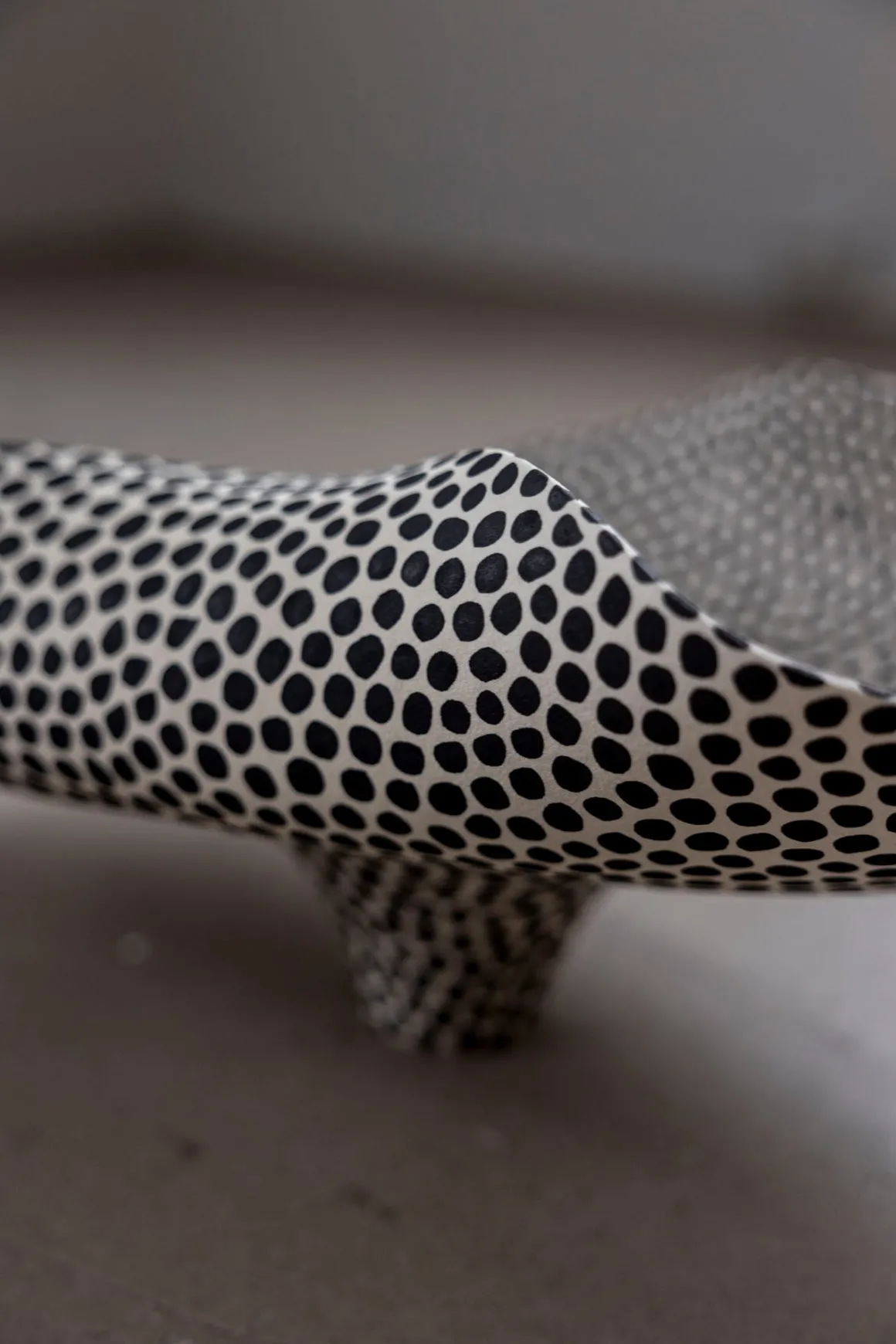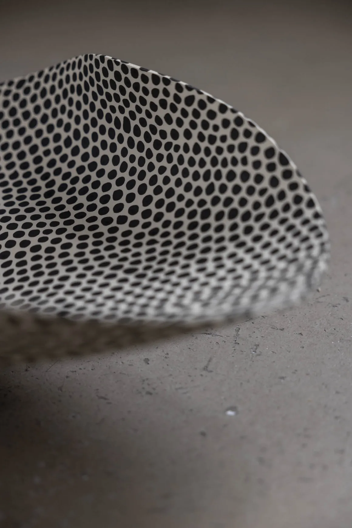 Unikt, håndlaget fat i hvitt med sorte prikker fra norske Jossolini. Jossolini er grunnlagt og drevet av Johanne Birkeland, en norsk keramiker med stor kjærlighet for leire og dens karakteristiske uttrykk. Dette gjenspeiles i Jossolinis fantastiske, fargerike produkter, der alt er designet, laget og brent i hennes verksted på Tjøme og i Oslo.