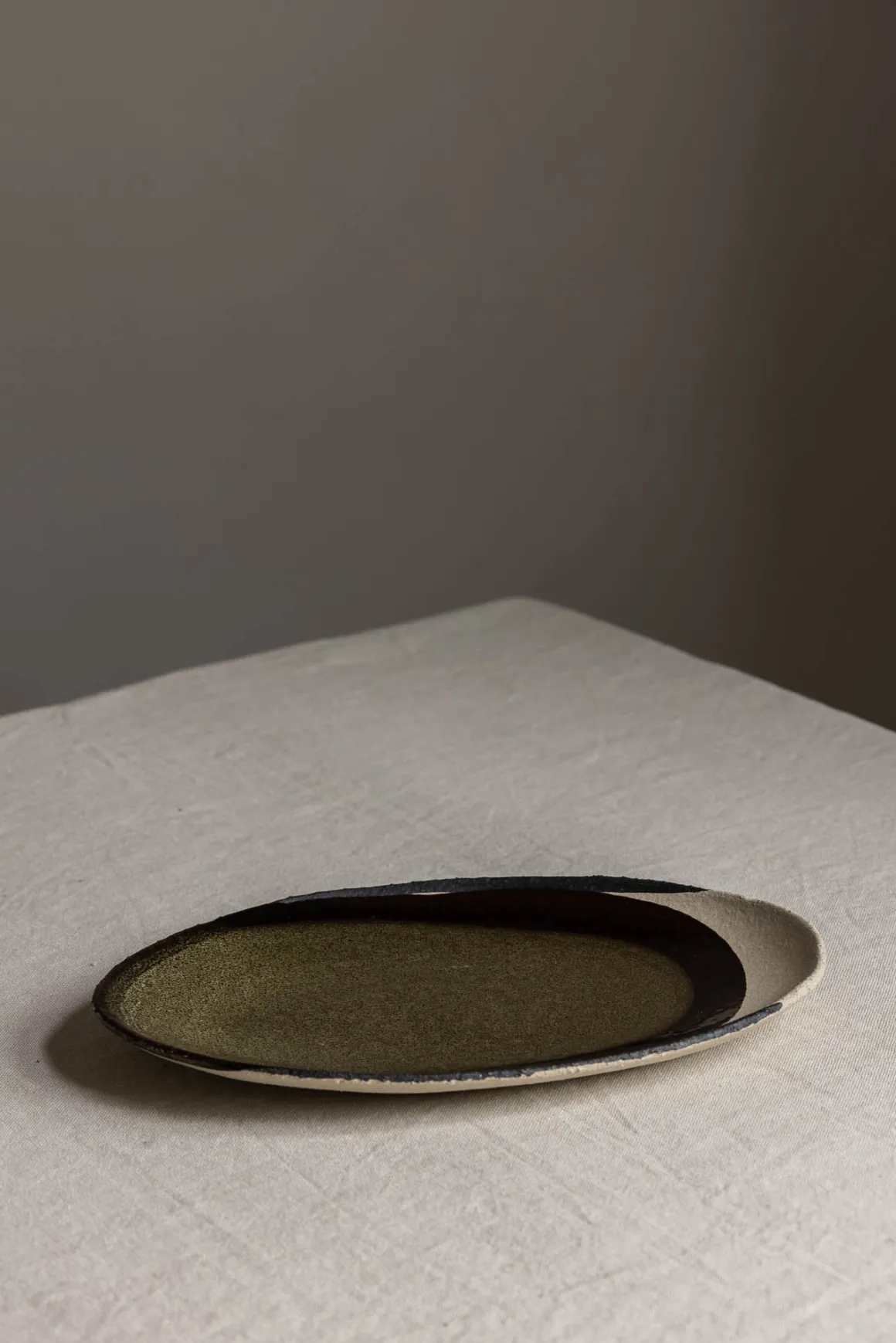 Dette ovale serveringsfatet fra Jars Céramistes er et uttrykk for skjønnheten i ufullkommenhet, inspirert av den japanske Wabi Sabi-filosofien. Fatet hyller håndverkets enkelhet og renhet, med et rustikt og teksturert uttrykk som føles både naturlig og tidløst. Laget av grogleire, der små biter av knust, brent leire er blandet inn, gir det fatet en rå og jordnær følelse. Seidou-glassuren gir en spennende kontrast mellom dype grønn- og svarttoner, noe som skaper et iøynefallende og unikt uttrykk. Glasuren er påført for hånd, med flere lag aske som er fordelt med øse eller pensel for å oppnå de spesielle effektene som kjennetegner dette fatet. Hvert fat er laget med en dyp respekt for håndverkstradisjoner, og ingen to fat er helt like.