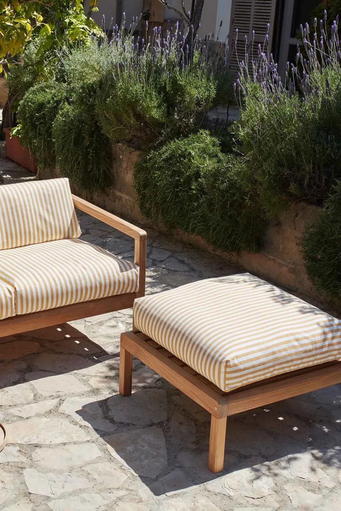 Fotskammel i teak fra serien Virkelyst, designet av SAYS WHO for Skagerak. Perfekt å hvile bena på eller som en ekstra sitteplass med sin tykke og myke pute. Puten tåler vind og vær, og gir ekstra komfort slik at du kan bli sittende å spise, snakke og kose deg i timesvis. Puten er polstret i eksklusivt Agora Panama-stoff som er et øko-tex-sertifisert og farget akrylstoff. Akrylfiberen skaper et syntetisk, men bomullslignende stoff med funksjoner i verdensklasse for utendørs bruk, noe som gjør det både svært farge-og lysfast, vann-og smussavvisende, muggbestandig og er samtidig fri for skadelige stoffer. Puten er fylt med det unike materialet fossflakes; hypoallergenisk, lett å vedlikeholde og opprettholder putens volum og form over lang tid. Rammen er laget av solid og vakker teak. Kombiner gjerne med andre møbler fra Virkelyst-serien for en komplett look.