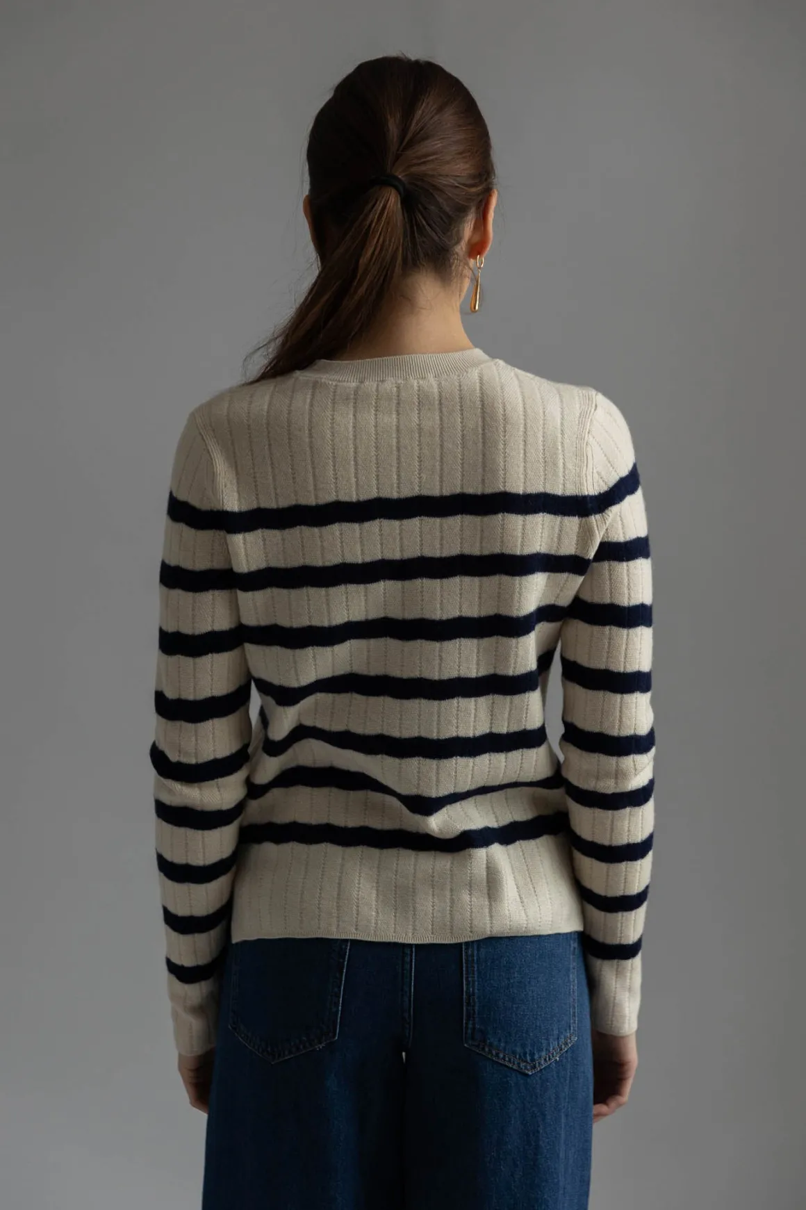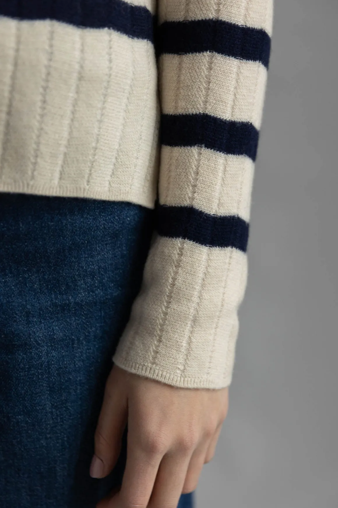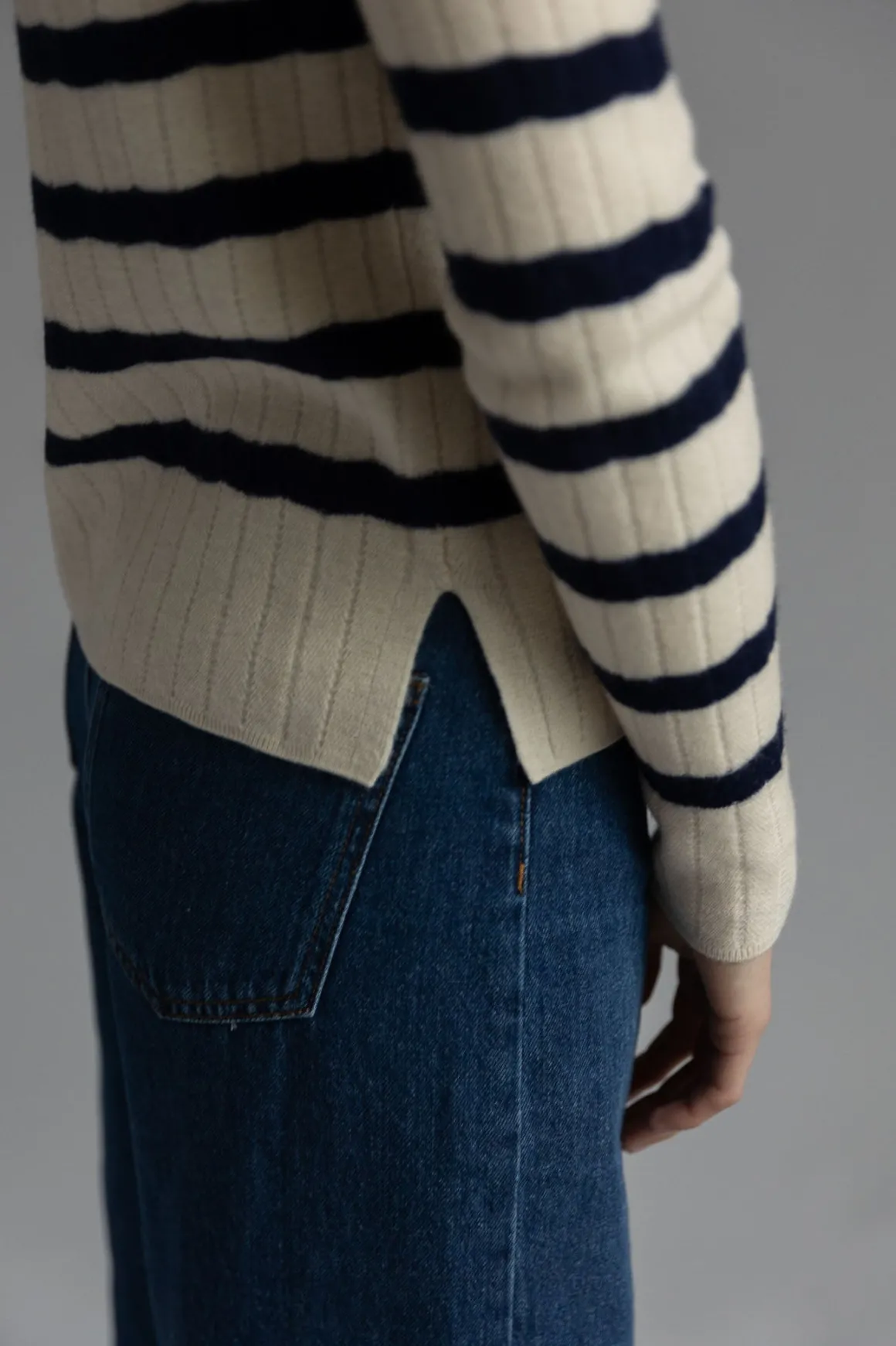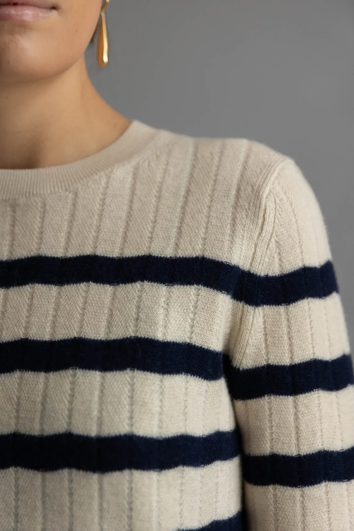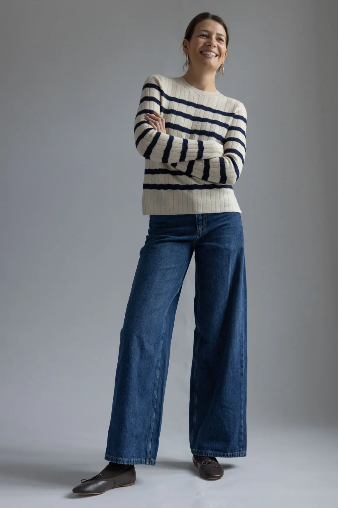 Estelle-genseren fra Vanessa Bruno er strikket i myk og eksklusiv merinoull som passer perfekt til sesongens behov. Genseren har et klassisk stripemønster i ecru og marineblått som gir et maritimt uttrykk. Den figurnære passformen med en lett utsvinget midje skaper en feminin silhuett, og genseren kan enkelt styles med både skjørt og jeans for et tidløst uttrykk. Ribbestrikkede detaljer langs hals, ermer og kant setter prikken over i-en.