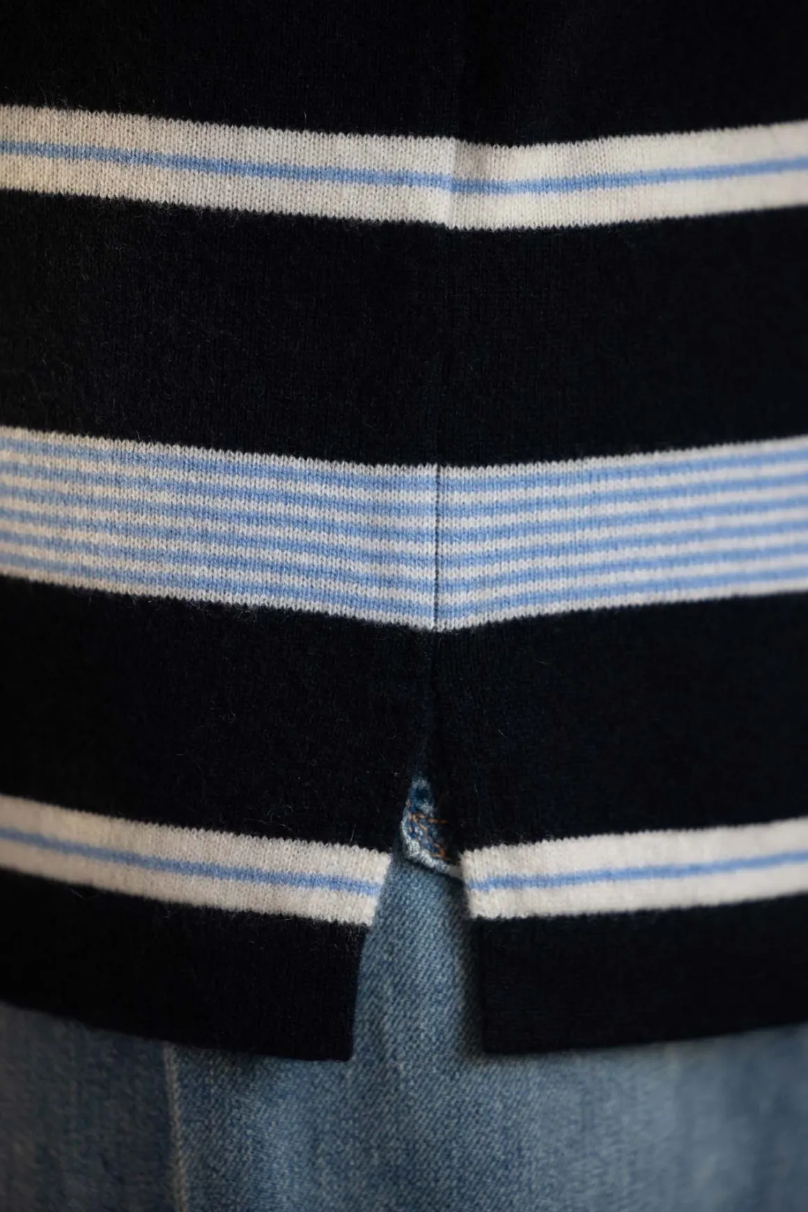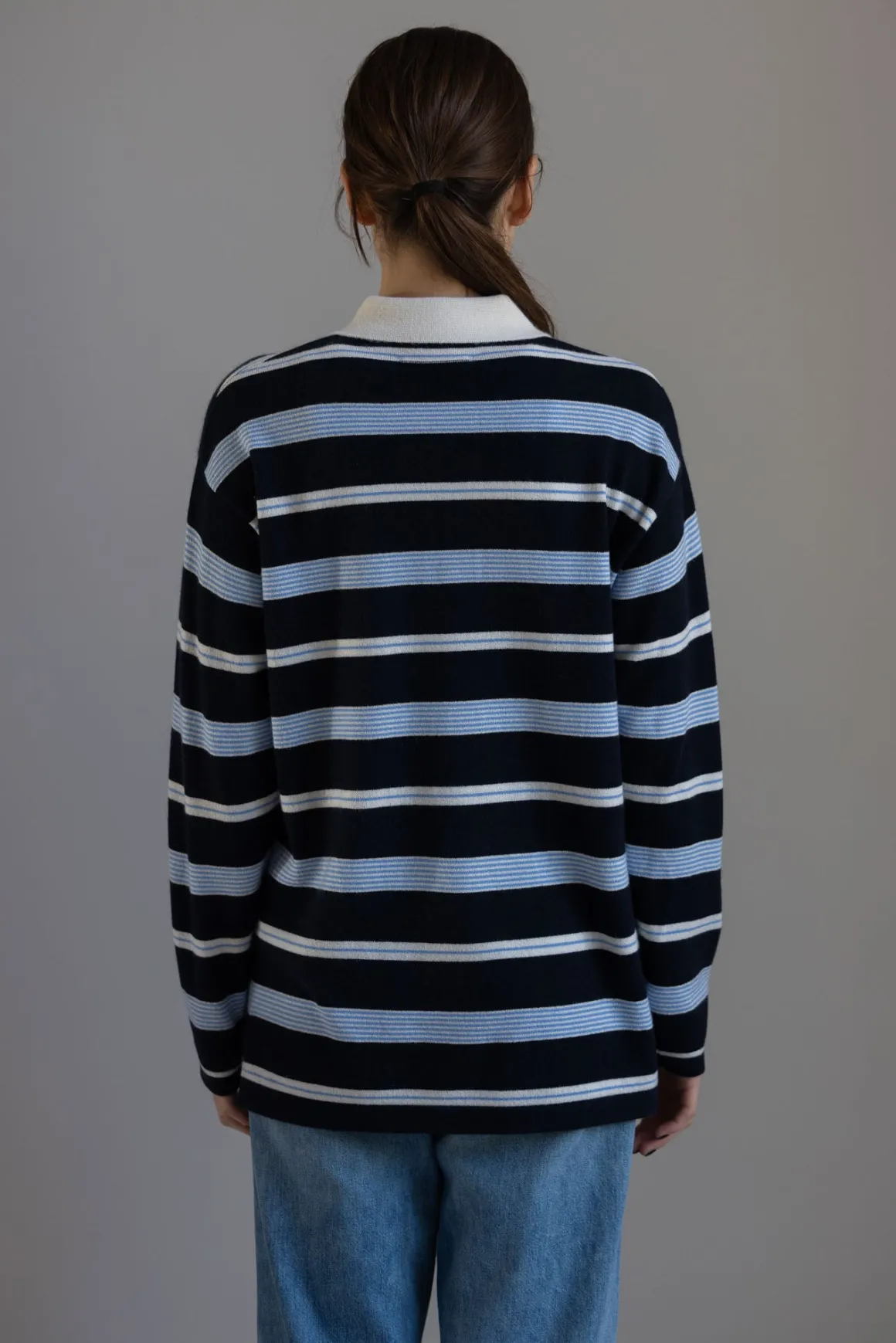 Klassisk rugby-genser fra Guest in Residence har raskt blitt et kjennetegn for merket, med inspirasjon hentet fra den klassiske rugbytrøyen. De ikoniske stripene gir et retro uttrykk, mens den romslige passformen gir den en avslappet følelse. Rugby-genseren er supermyk og føles luksuriøs mot huden. Genseren har en krage med skjult tre-knapps lukking og små sidesplitter nederst. Laget av kasjmir av førsteklasses kvalitet, er dette en genser du alltid vil føle deg vel i. Like kul til fest og morro som til hverdags.