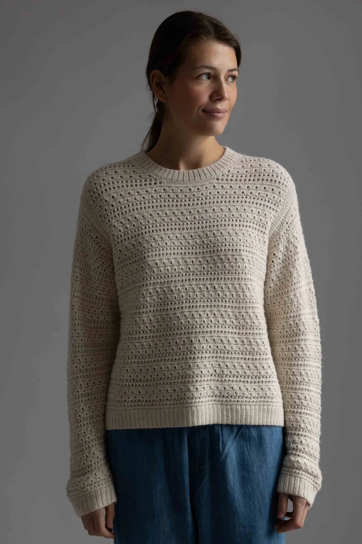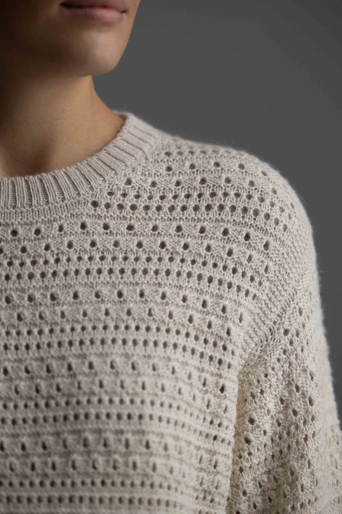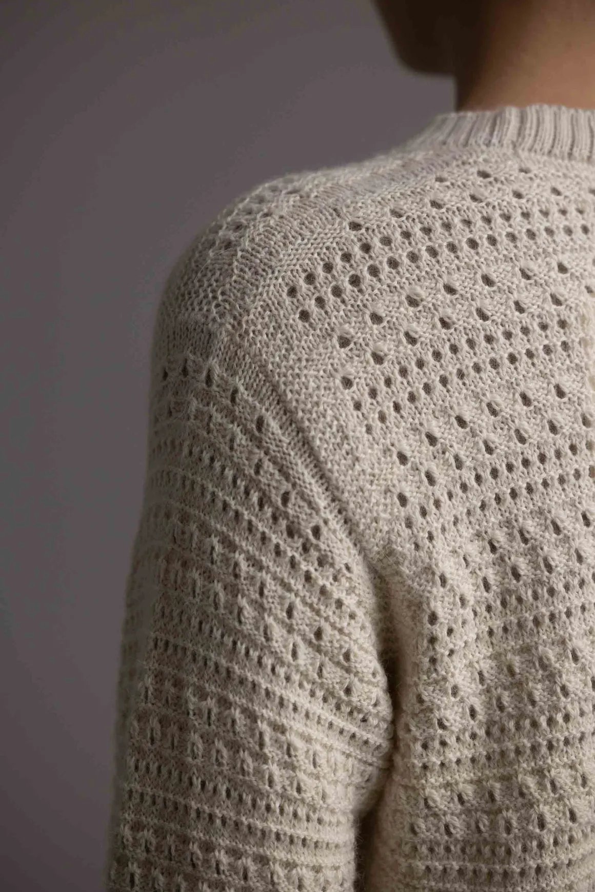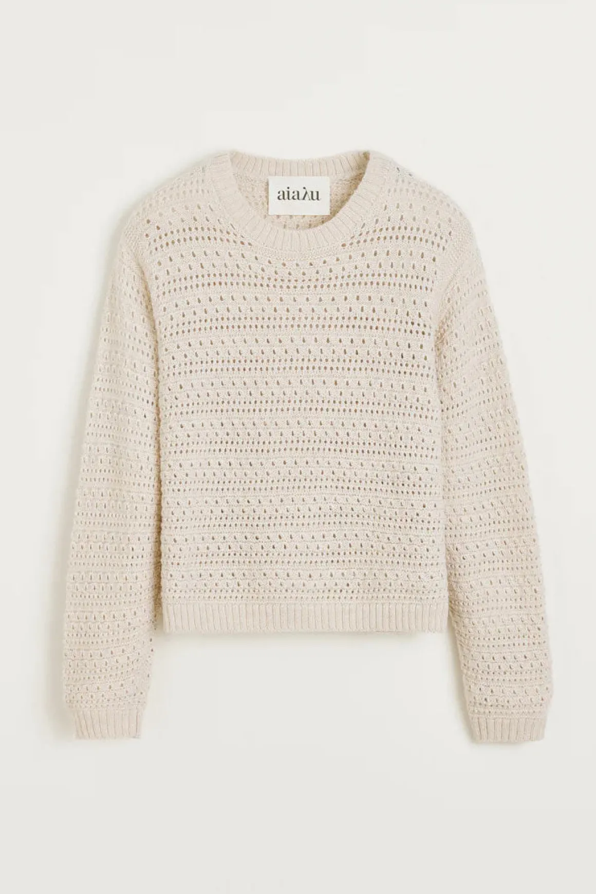 Tamaya-genseren fra Aiayu er en klassisk genser laget av myk og luksuriøs lamafiber. Genseren er strikket i et delikat hullmønster og har gjennomtenkte detaljer som rund hals, dropped shoulders og ribbestrikkede kanter. En tidløs favoritt som kombinerer kvalitet og unikt design, perfekt for lag-på-lag styling eller alene på kjølige dager.