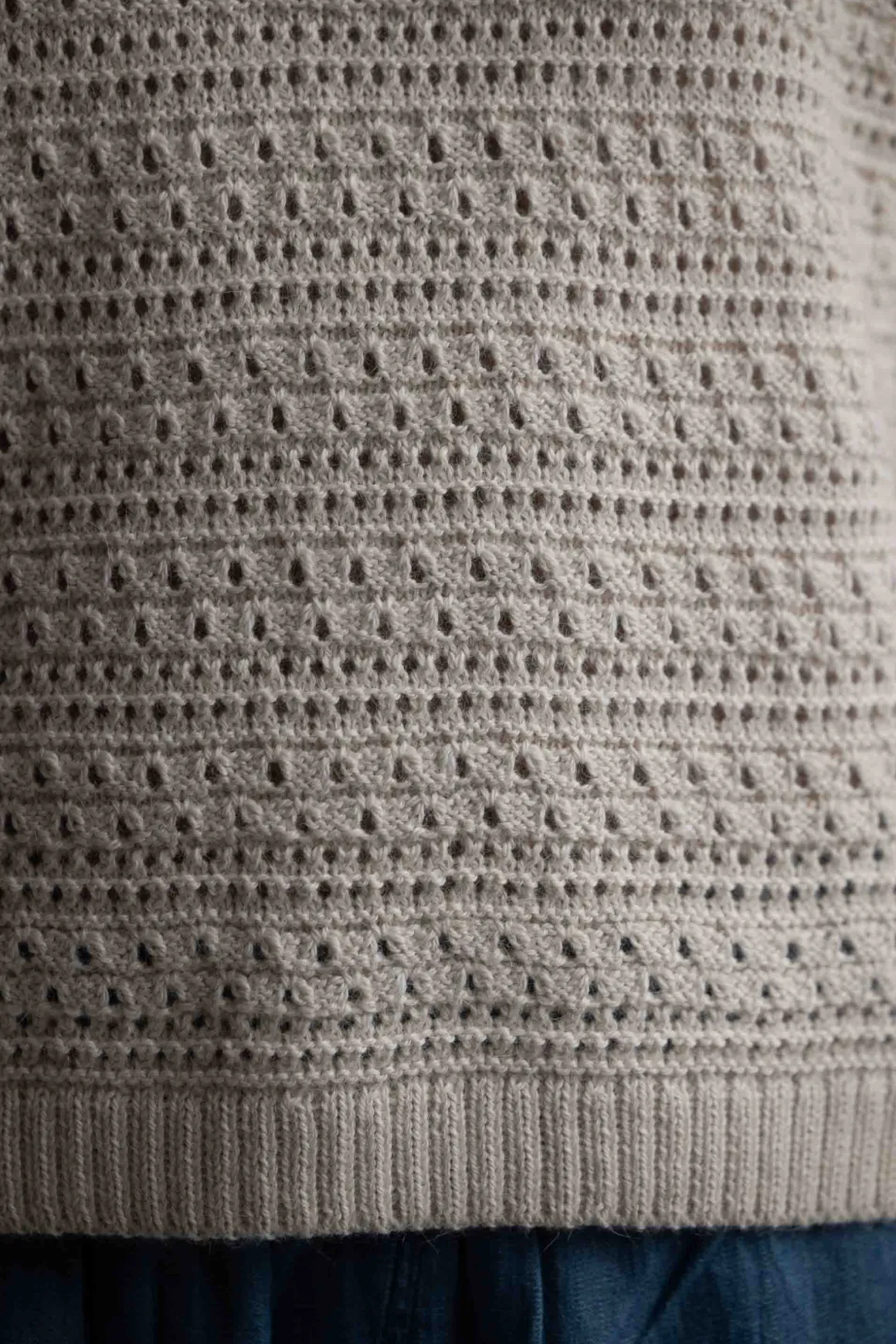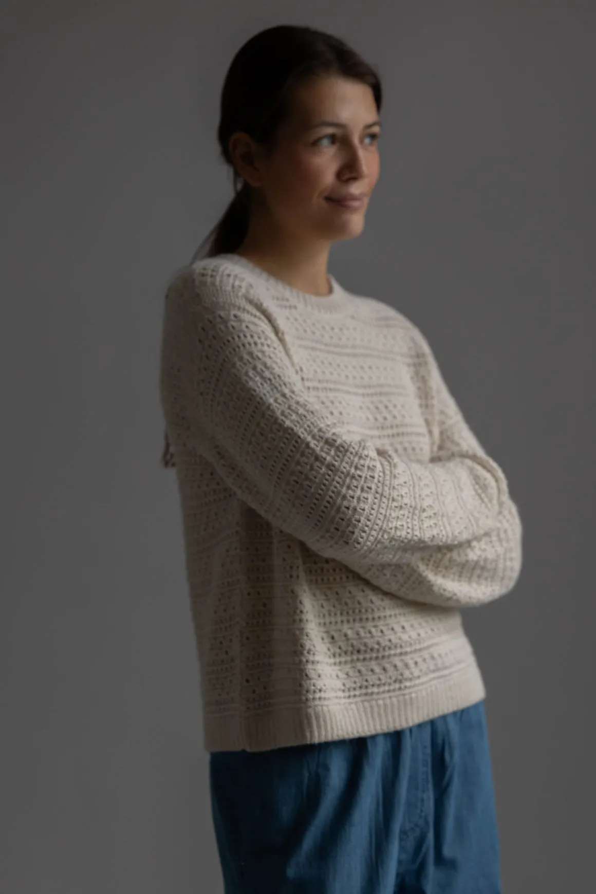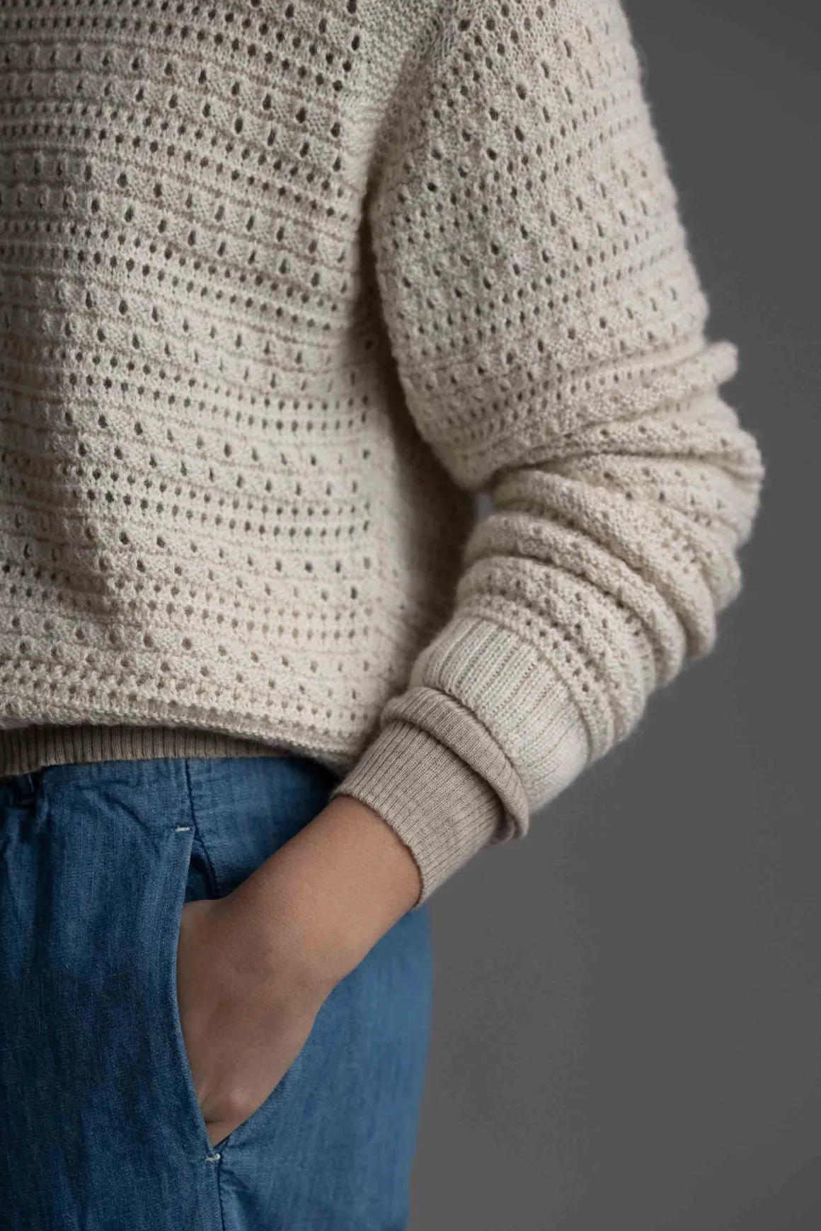 Tamaya-genseren fra Aiayu er en klassisk genser laget av myk og luksuriøs lamafiber. Genseren er strikket i et delikat hullmønster og har gjennomtenkte detaljer som rund hals, dropped shoulders og ribbestrikkede kanter. En tidløs favoritt som kombinerer kvalitet og unikt design, perfekt for lag-på-lag styling eller alene på kjølige dager.