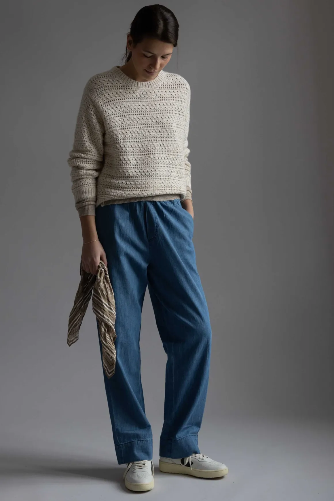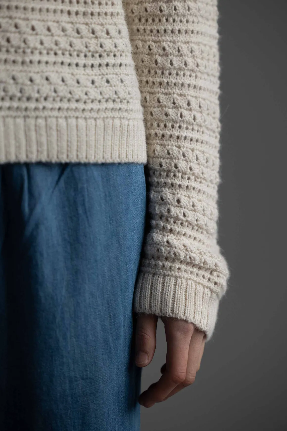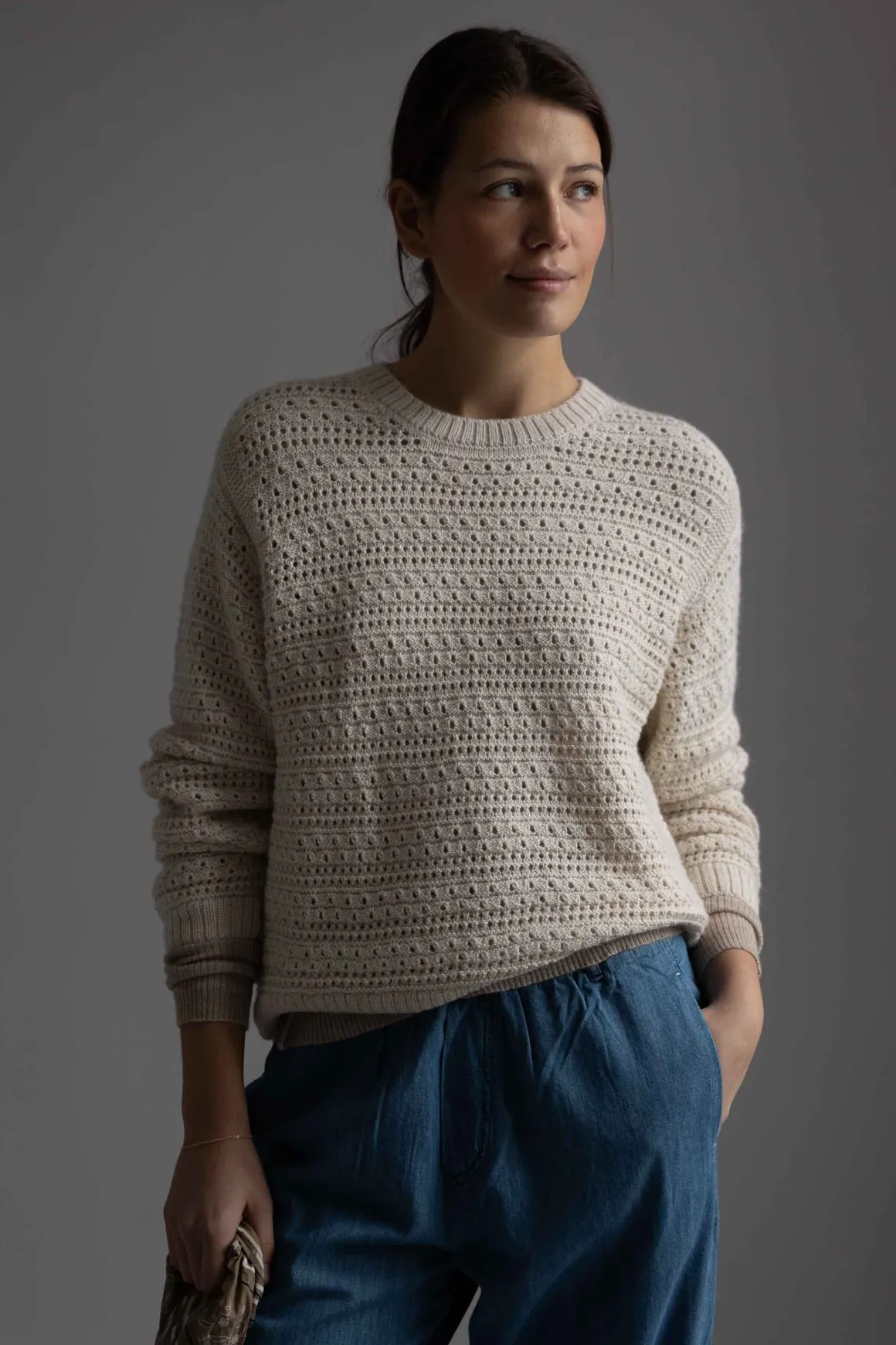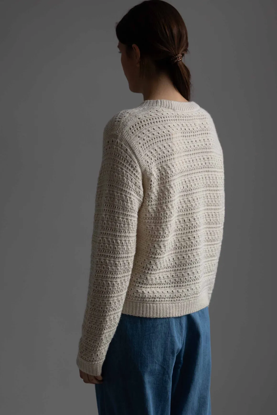 Tamaya-genseren fra Aiayu er en klassisk genser laget av myk og luksuriøs lamafiber. Genseren er strikket i et delikat hullmønster og har gjennomtenkte detaljer som rund hals, dropped shoulders og ribbestrikkede kanter. En tidløs favoritt som kombinerer kvalitet og unikt design, perfekt for lag-på-lag styling eller alene på kjølige dager.